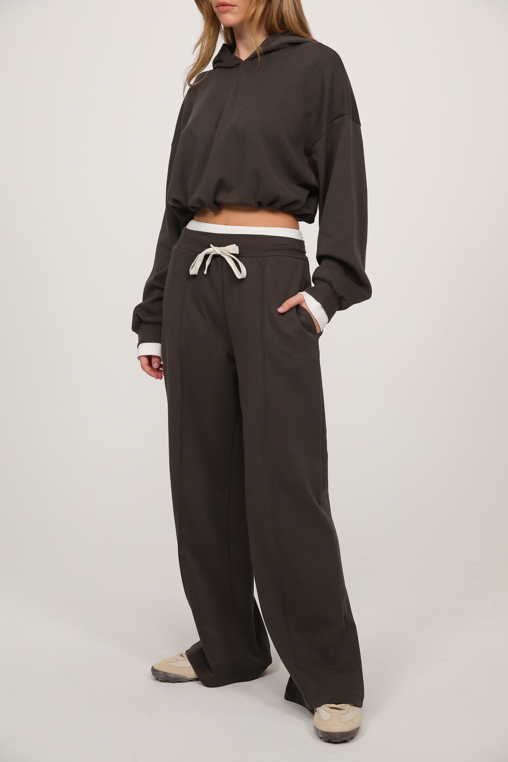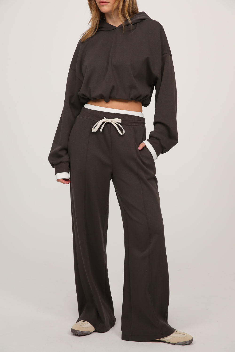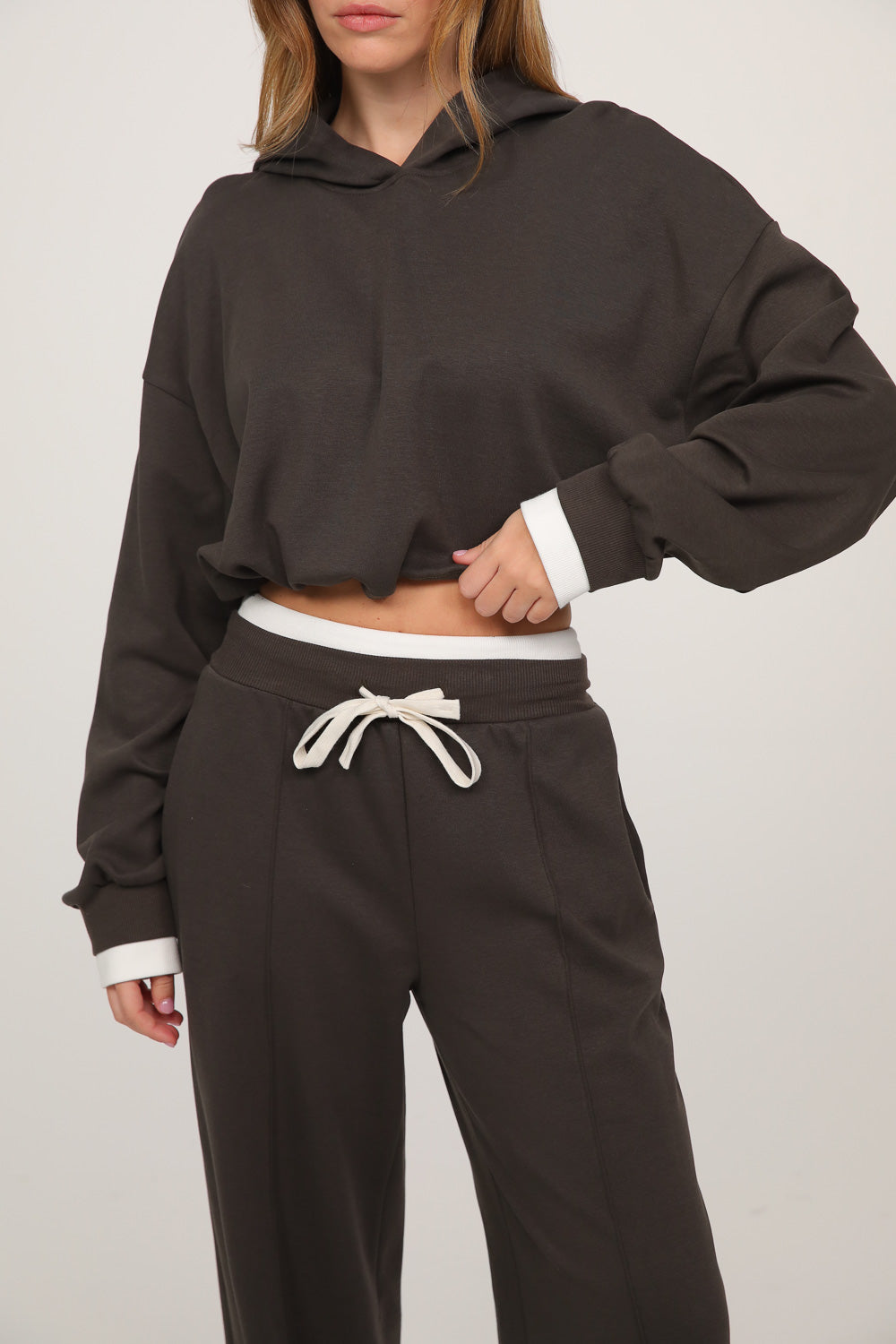 חליפה נינוחה עם מראה חמים וקז’ואלי, כוללת סווטשירט בגזרה רפויה עם קפוצ’ון ושרוולים ארוכים, בשילוב מכנסיים רחבים עם מותן אלסטית בנד גומי לבן ושרוך קשירה,