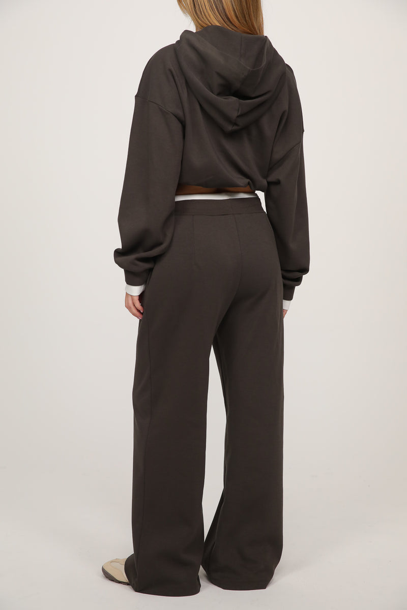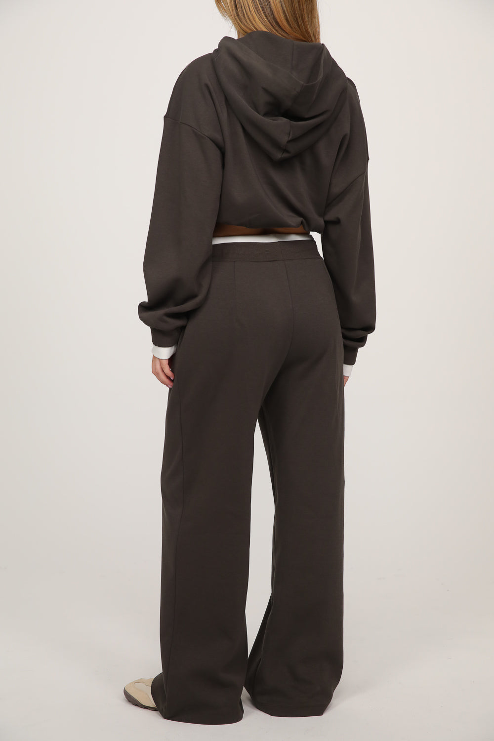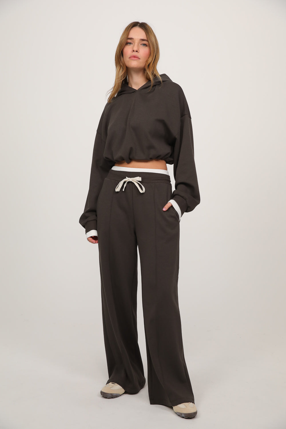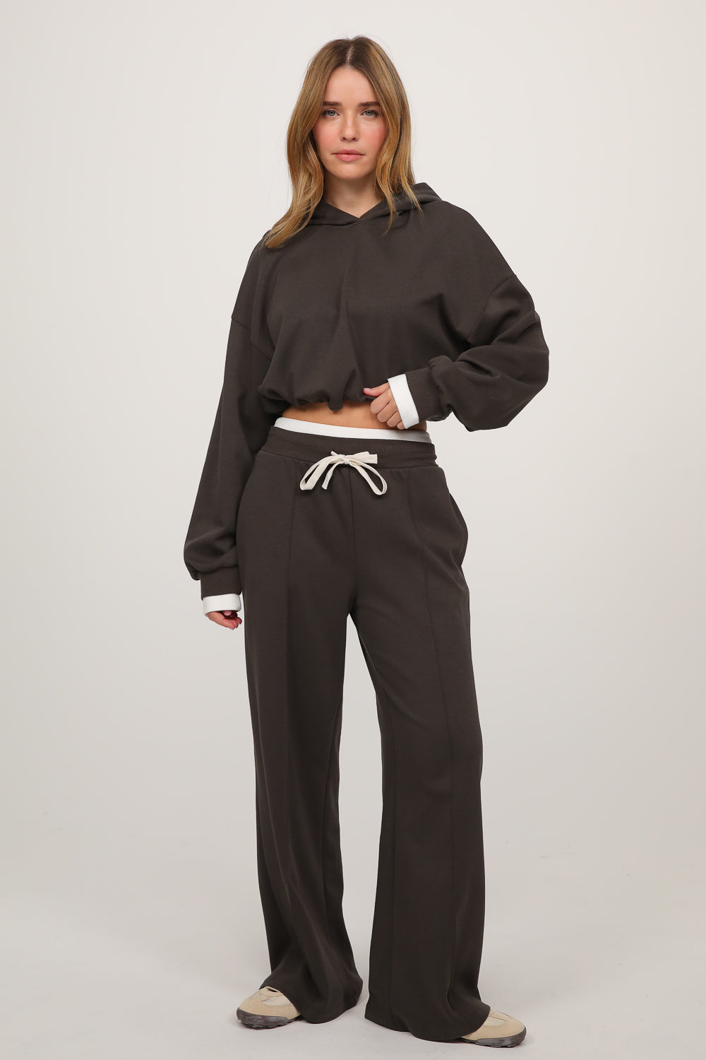 חליפה נינוחה עם מראה חמים וקז’ואלי, כוללת סווטשירט בגזרה רפויה עם קפוצ’ון ושרוולים ארוכים, בשילוב מכנסיים רחבים עם מותן אלסטית בנד גומי לבן ושרוך קשירה,