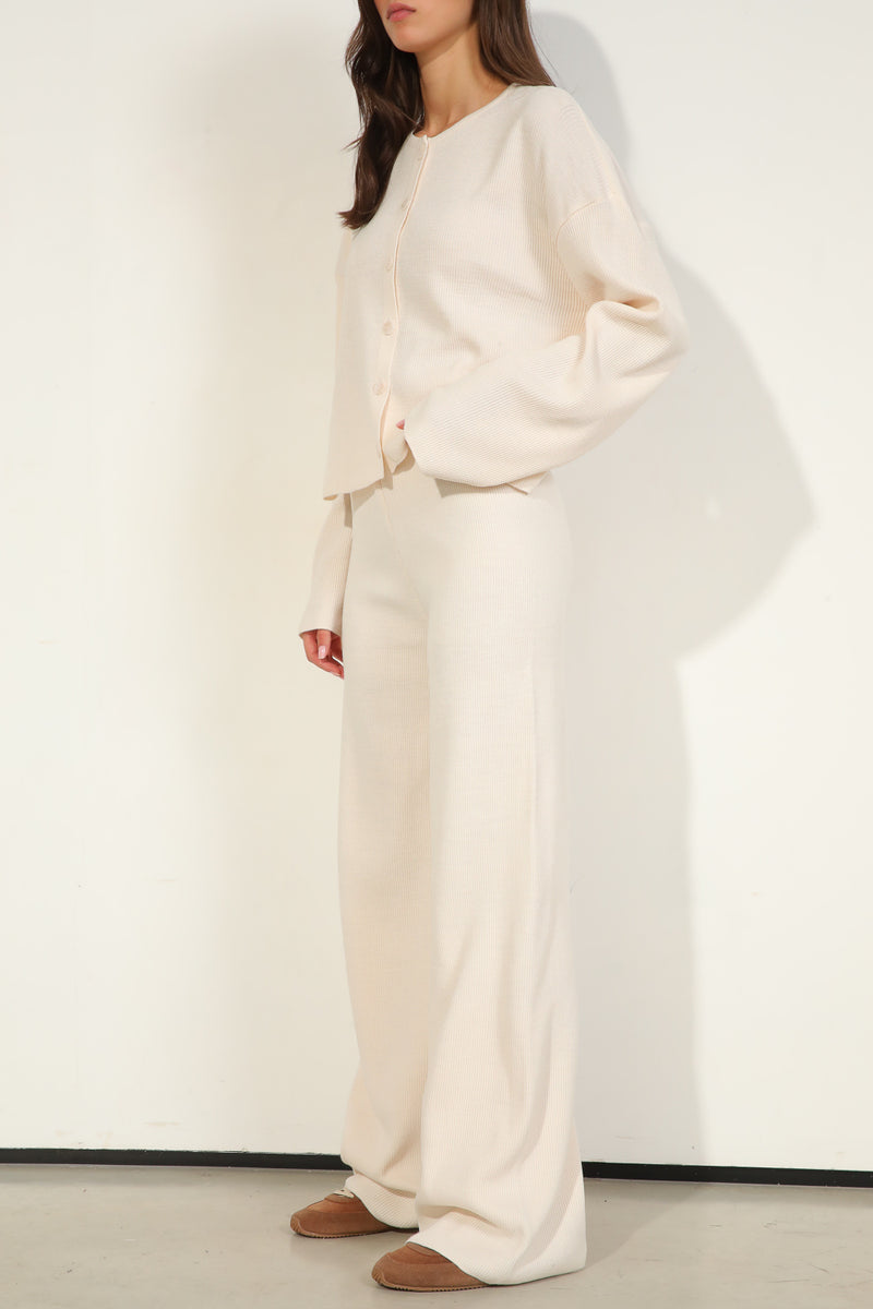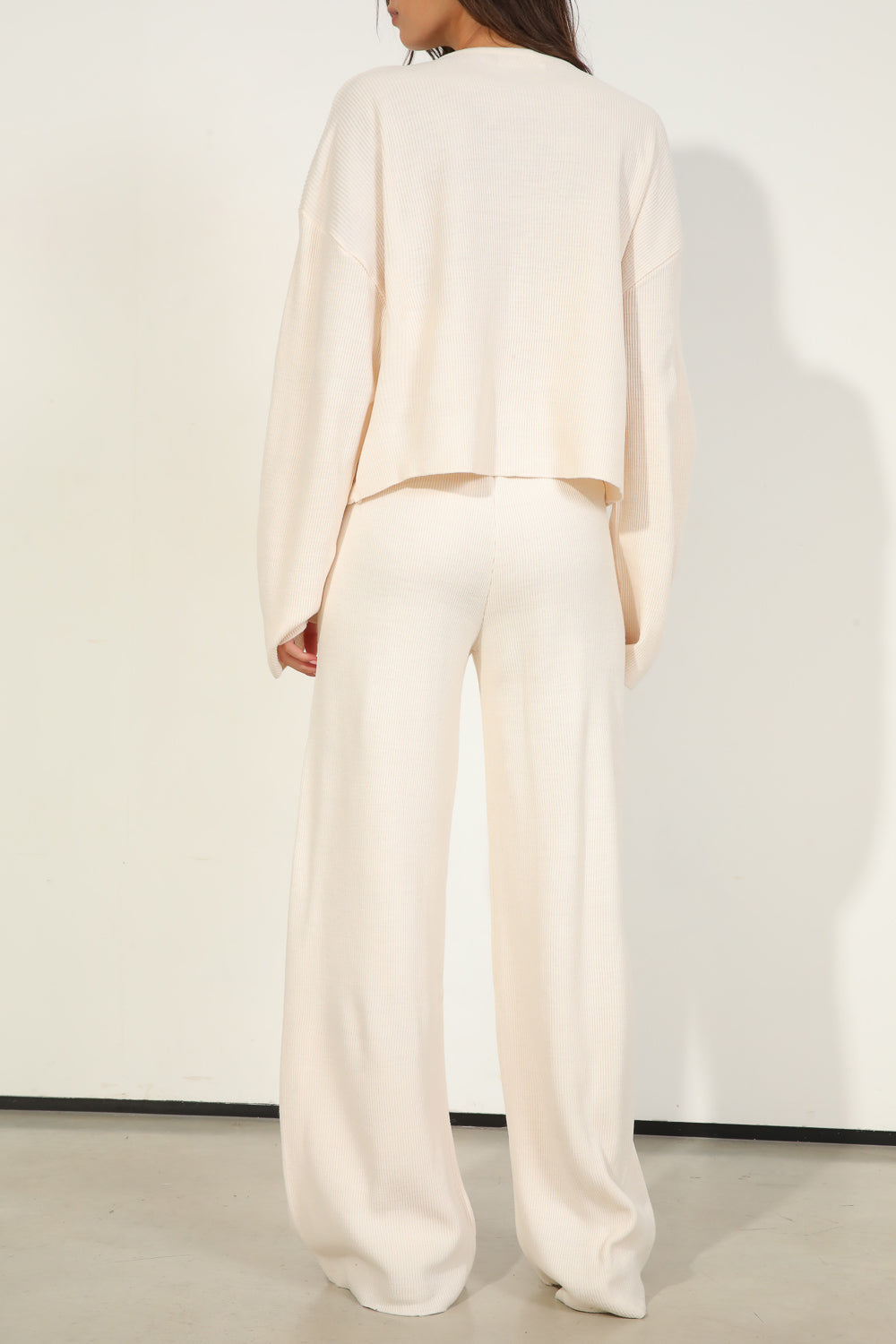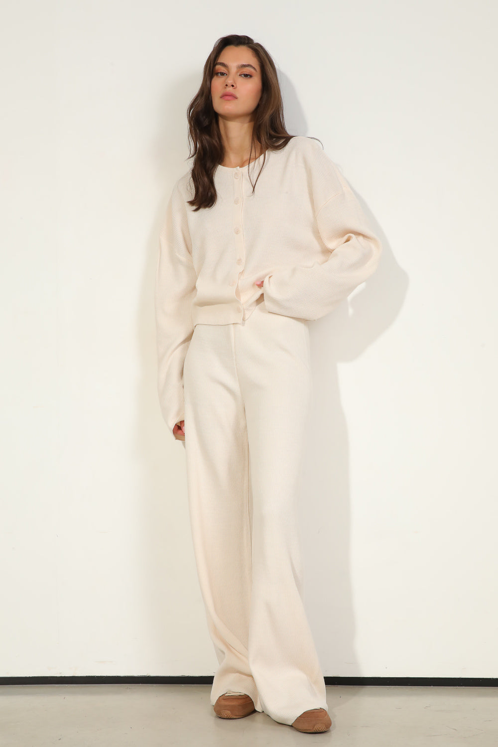 חליפת שתי חלקים רכה ונינוחה עם מראה אלגנטי ולא מתאמץ. כוללת מכנס בגזרה ישרה שנופל יפה על הגוף, וחלק עליון תואם בגזרה קלילה שמחמיאה מבלי להצמיד. מושלמת ליום במשרד, לקפה בעיר או לערב רגוע  סט שמרגיש נוח אבל נראה מדויק ושיקי.