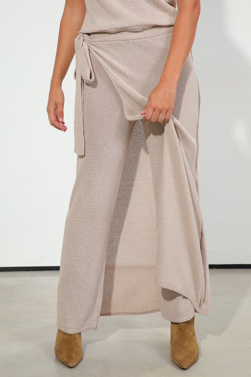 חליפת שתי חלקים יוקרתית ומחמיאה בגוון שמנת עדין, שמביאה איתה שילוב מושלם של נוחות וסטייל. החלק העליון בגזרה מחמיאה עם כתפייה רחבה, והחלק התחתון משתלב במכנס נשפך ורחב שיוצר מראה אלגנטי וזורם.