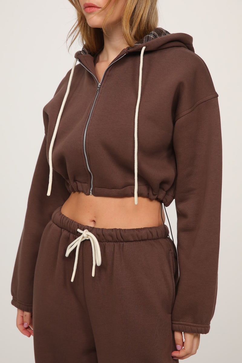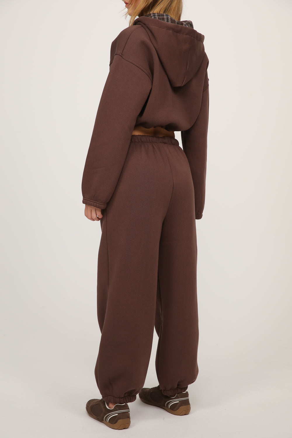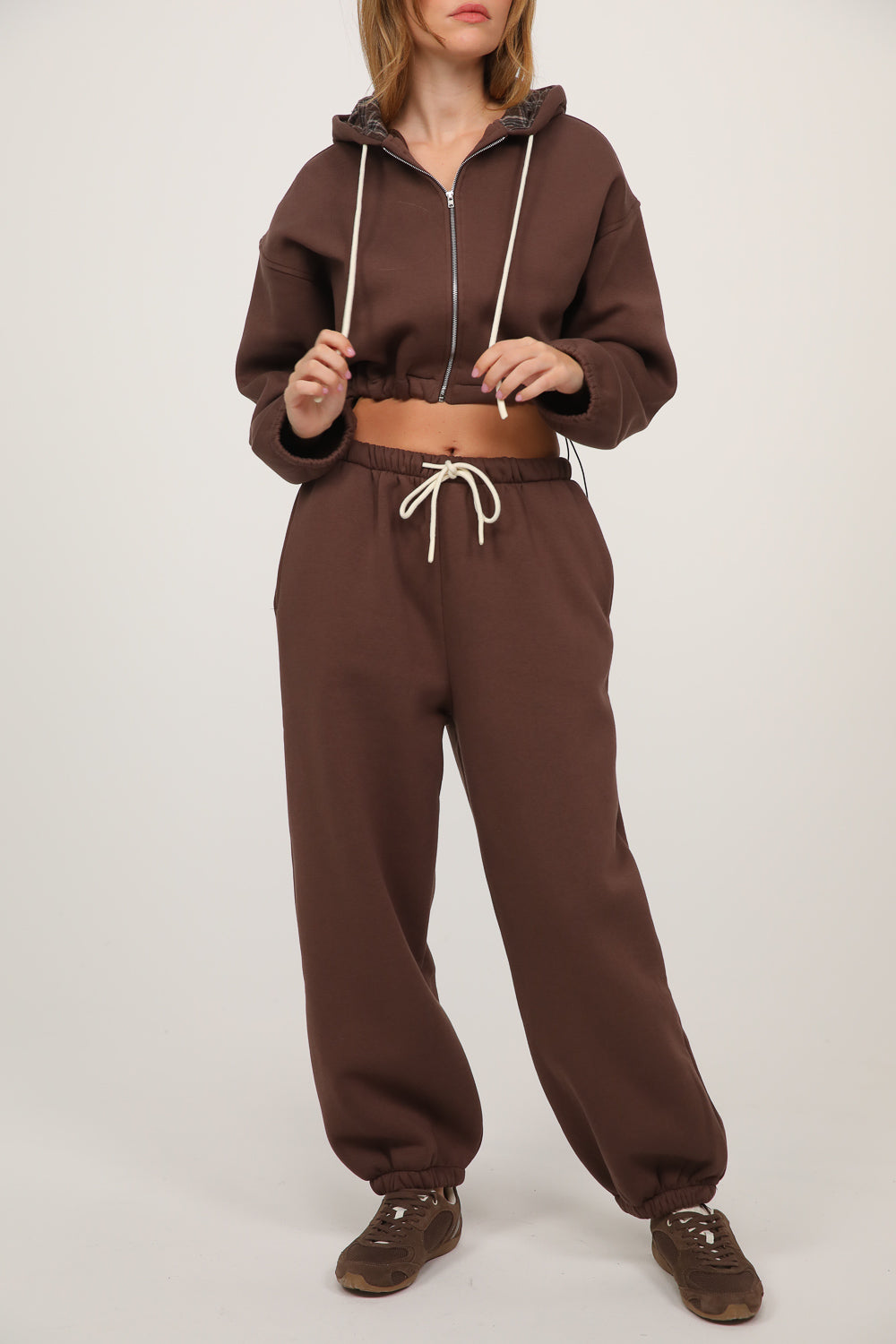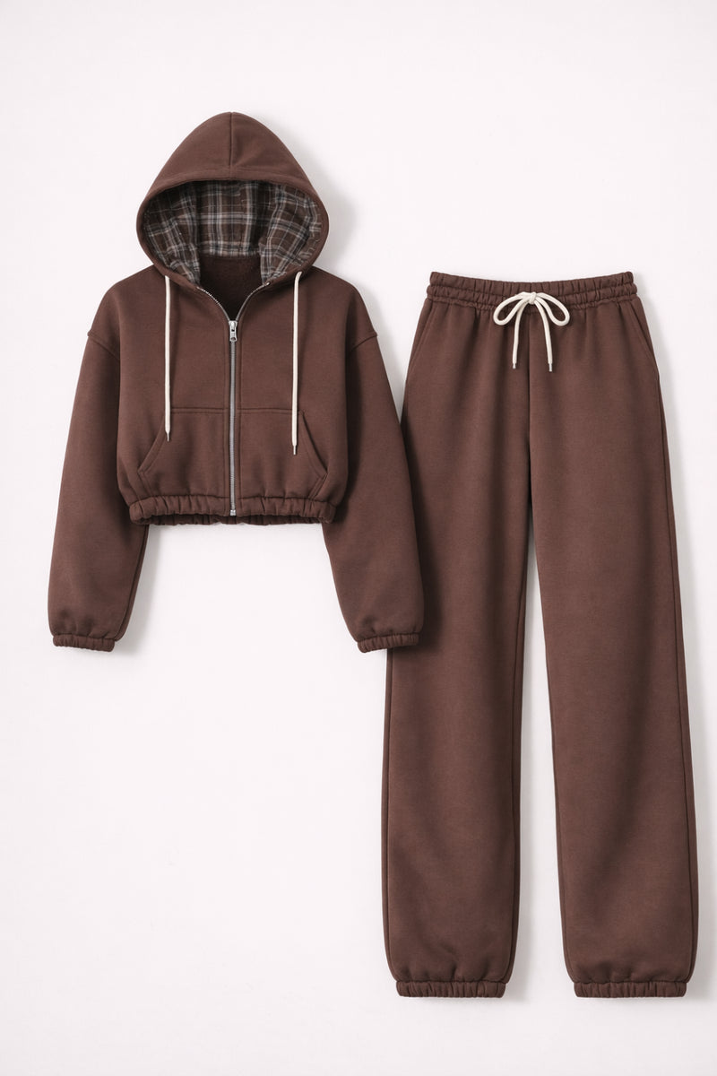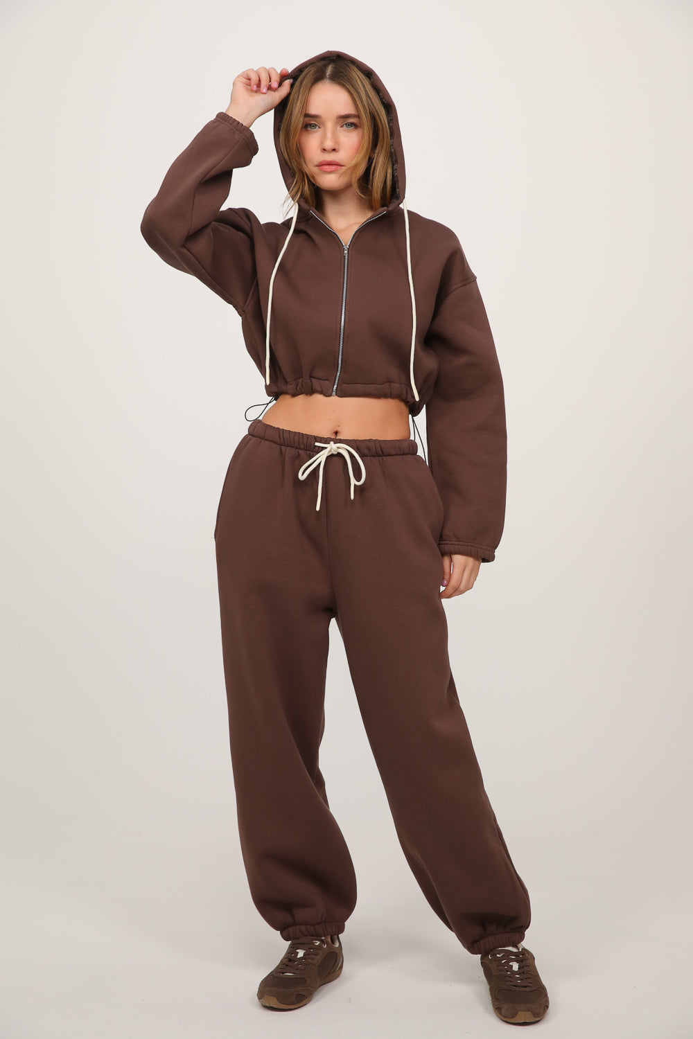 חליפת קז’ואל רכה ונוחה בגוון חום עמוק, כוללת סווטשירט קרופ עם קפוצ’ון ורוכסן קדמי, יחד עם מכנסיים בגזרה רחבה ונינוחה. בד נעים למגע עם שרוך קשירה במותן להתאמה מדויקת. שילוב מושלם בין נוחות לסטייל יומיומי, מתאים ללוק אורבני רגוע או ליום של סידורים בסטייל.