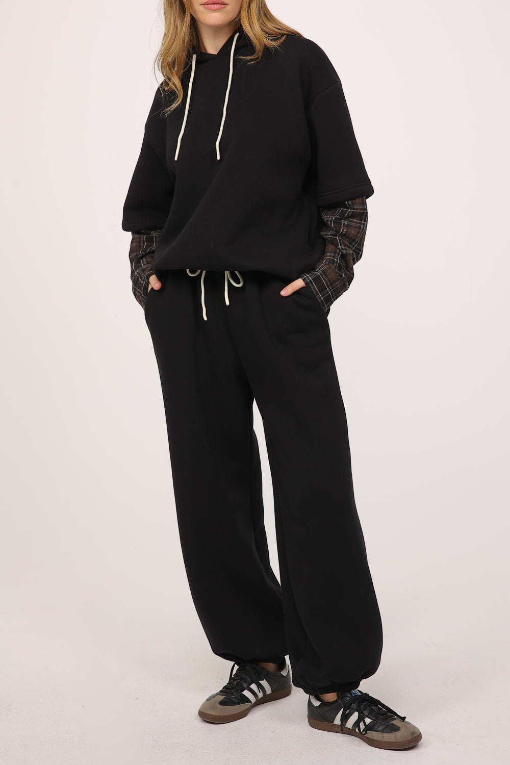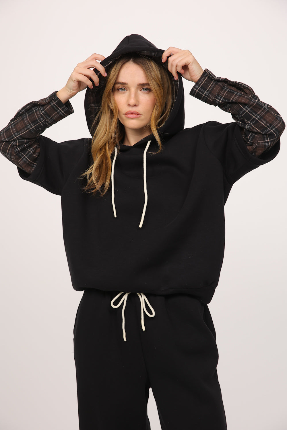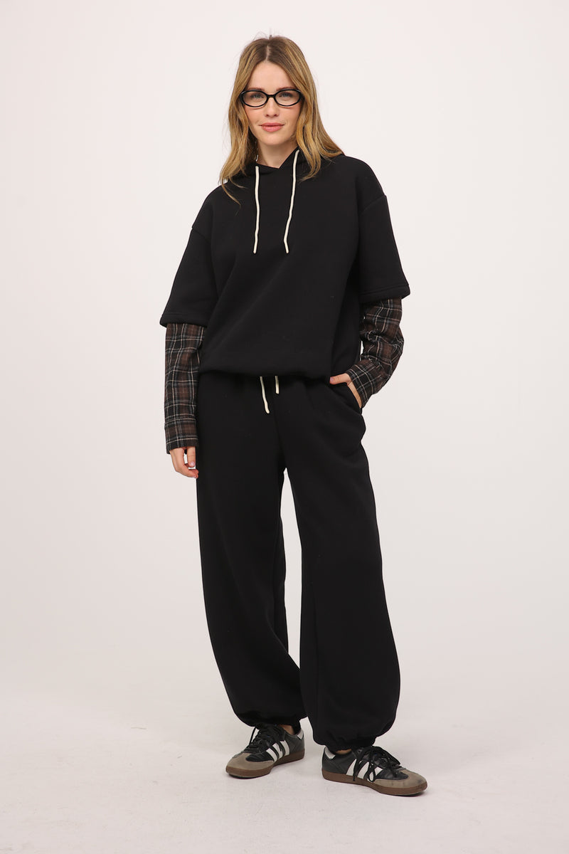 חליפה נינוחה בגזרה רחבה ונקייה, כוללת קפוצ’ון ומכנסיים תואמים. הקפוצ’ון מעוצב עם בטנת משבצות פנימית שמוסיפה עומק ועניין למראה המינימליסטי, וסגירה קדמית נוחה. המכנסיים בגזרה ישרה עם נפילה רכה, ליצירת לוק יומיומי מוקפד.