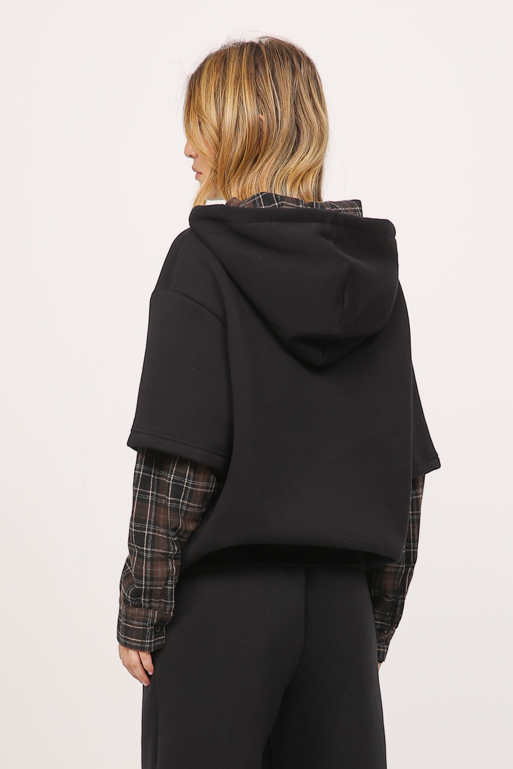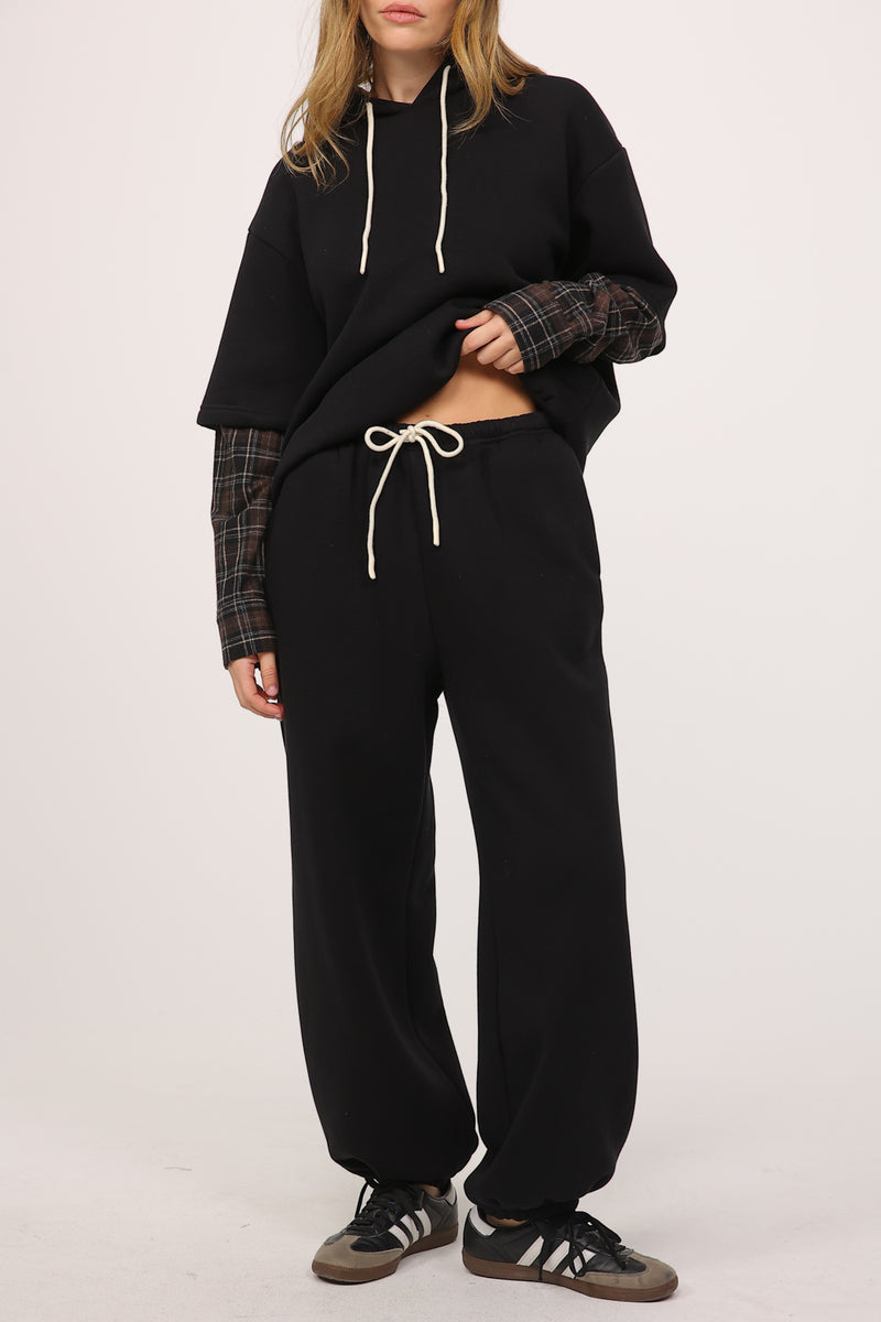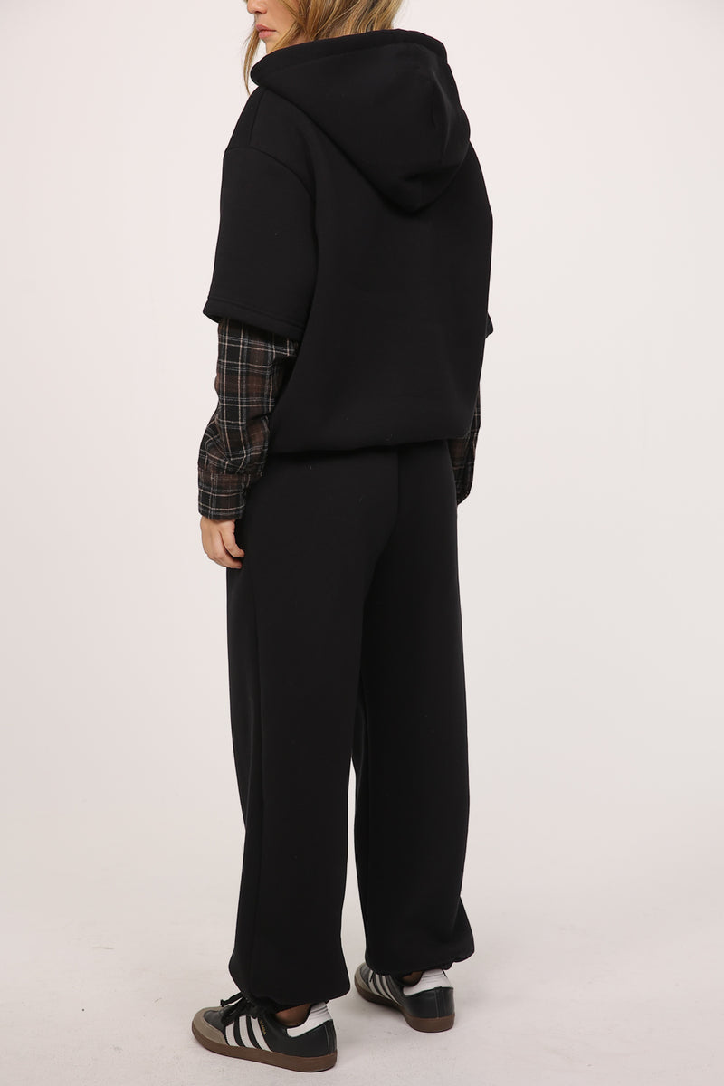חליפה נינוחה בגזרה רחבה ונקייה, כוללת קפוצ’ון ומכנסיים תואמים. הקפוצ’ון מעוצב עם בטנת משבצות פנימית שמוסיפה עומק ועניין למראה המינימליסטי, וסגירה קדמית נוחה. המכנסיים בגזרה ישרה עם נפילה רכה, ליצירת לוק יומיומי מוקפד.