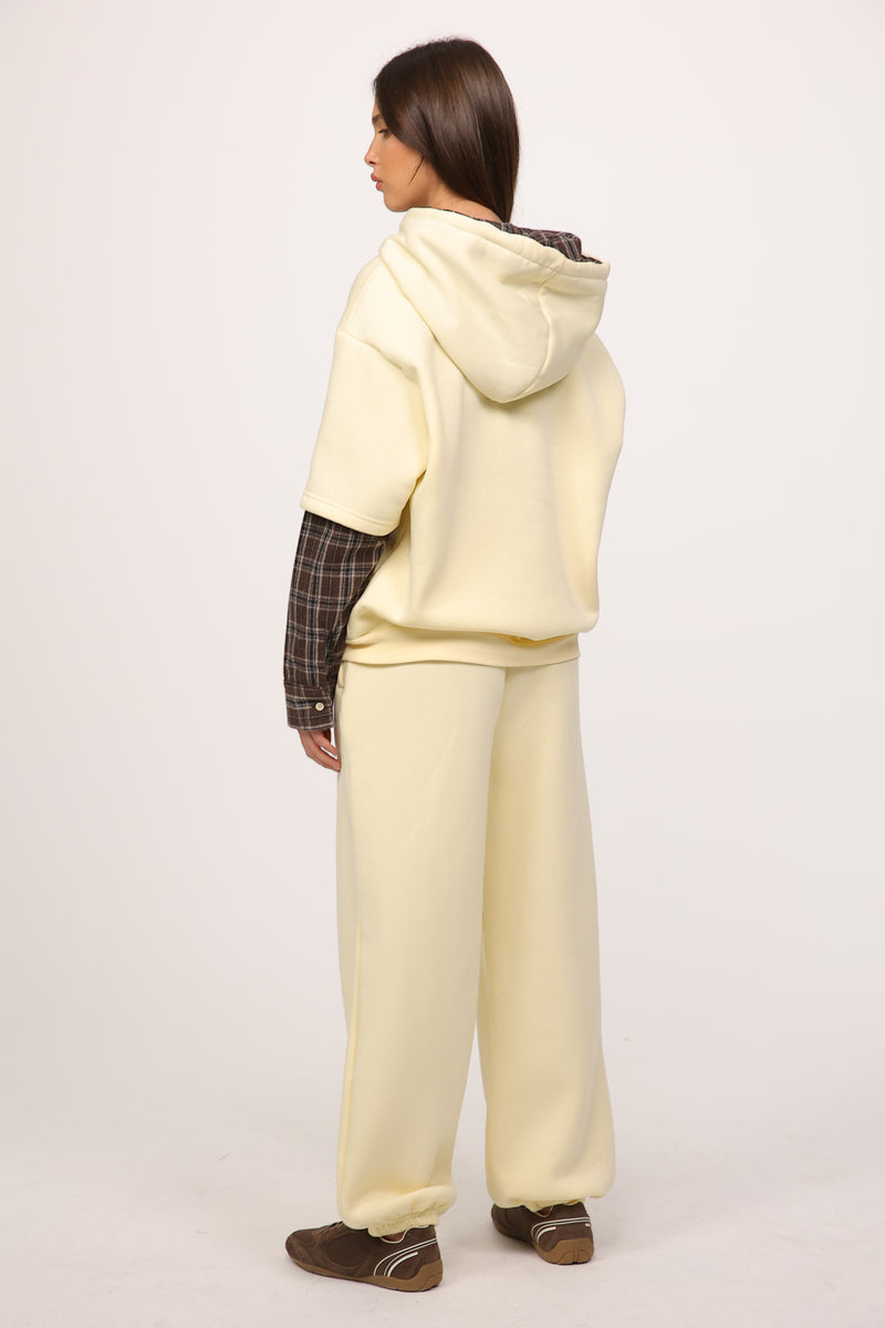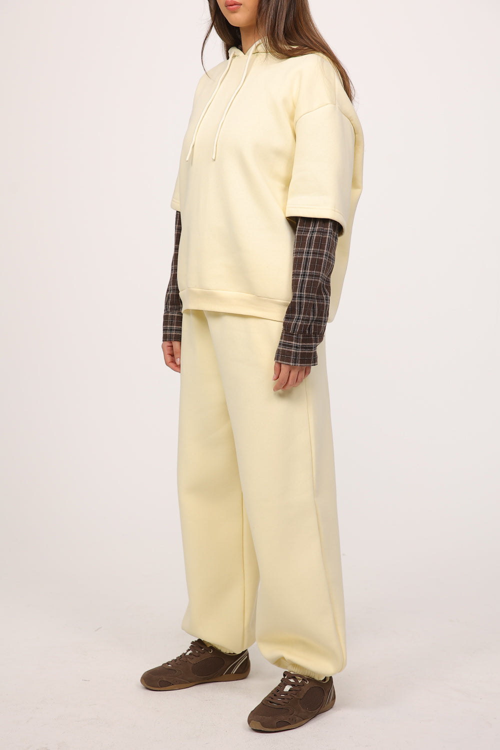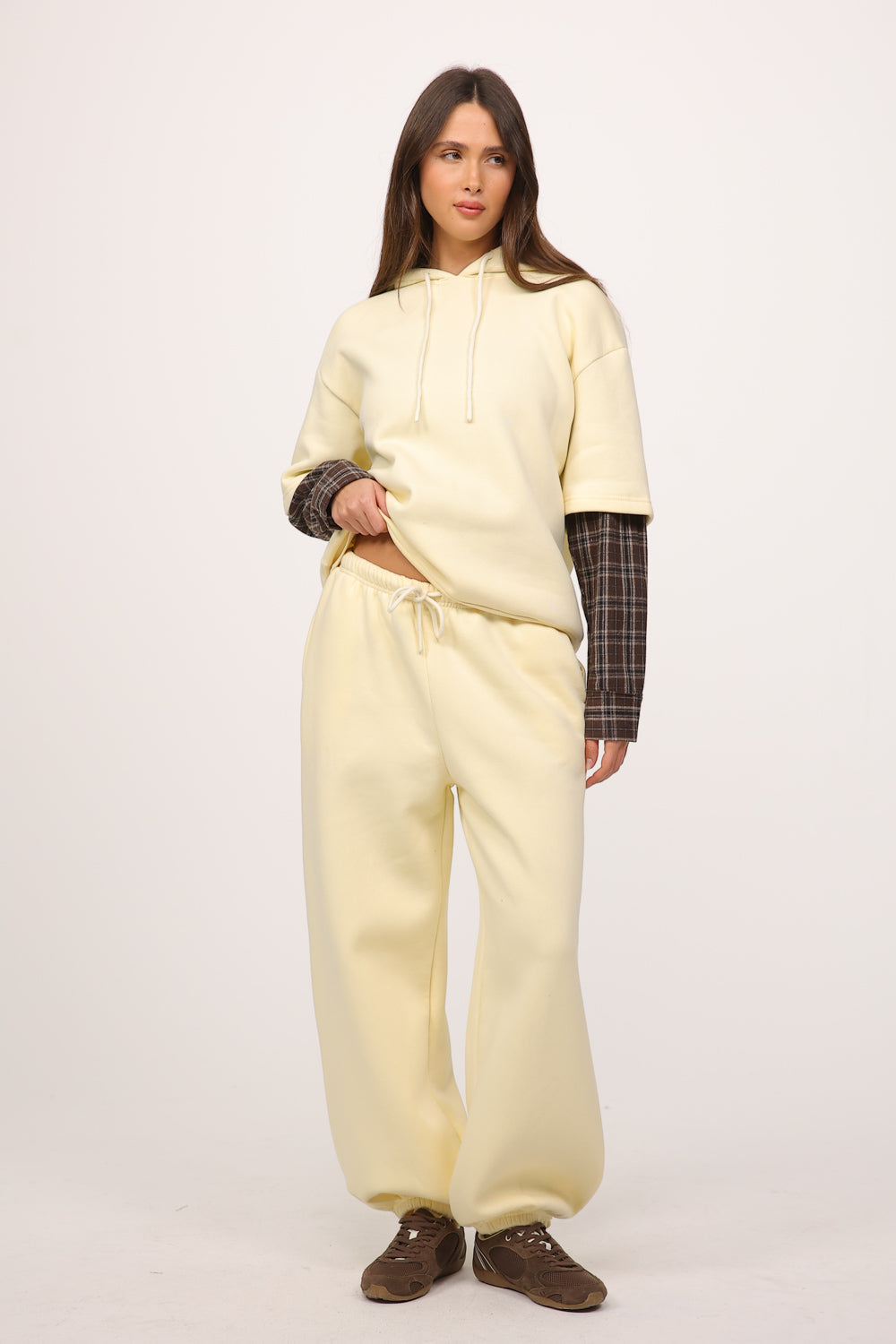 חליפה נינוחה בגזרה רחבה ונקייה, כוללת קפוצ’ון ומכנסיים תואמים. הקפוצ’ון מעוצב עם בטנת משבצות פנימית שמוסיפה עומק ועניין למראה המינימליסטי, וסגירה קדמית נוחה. המכנסיים בגזרה ישרה עם נפילה רכה, ליצירת לוק יומיומי מוקפד.