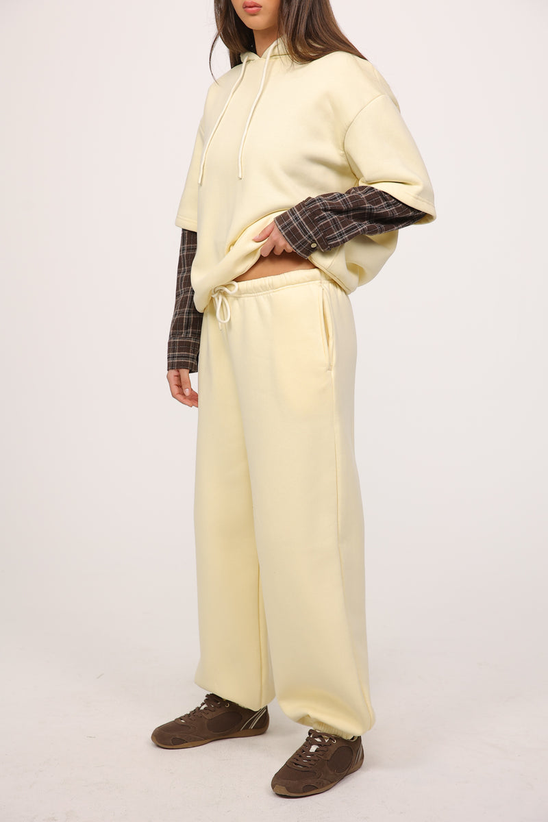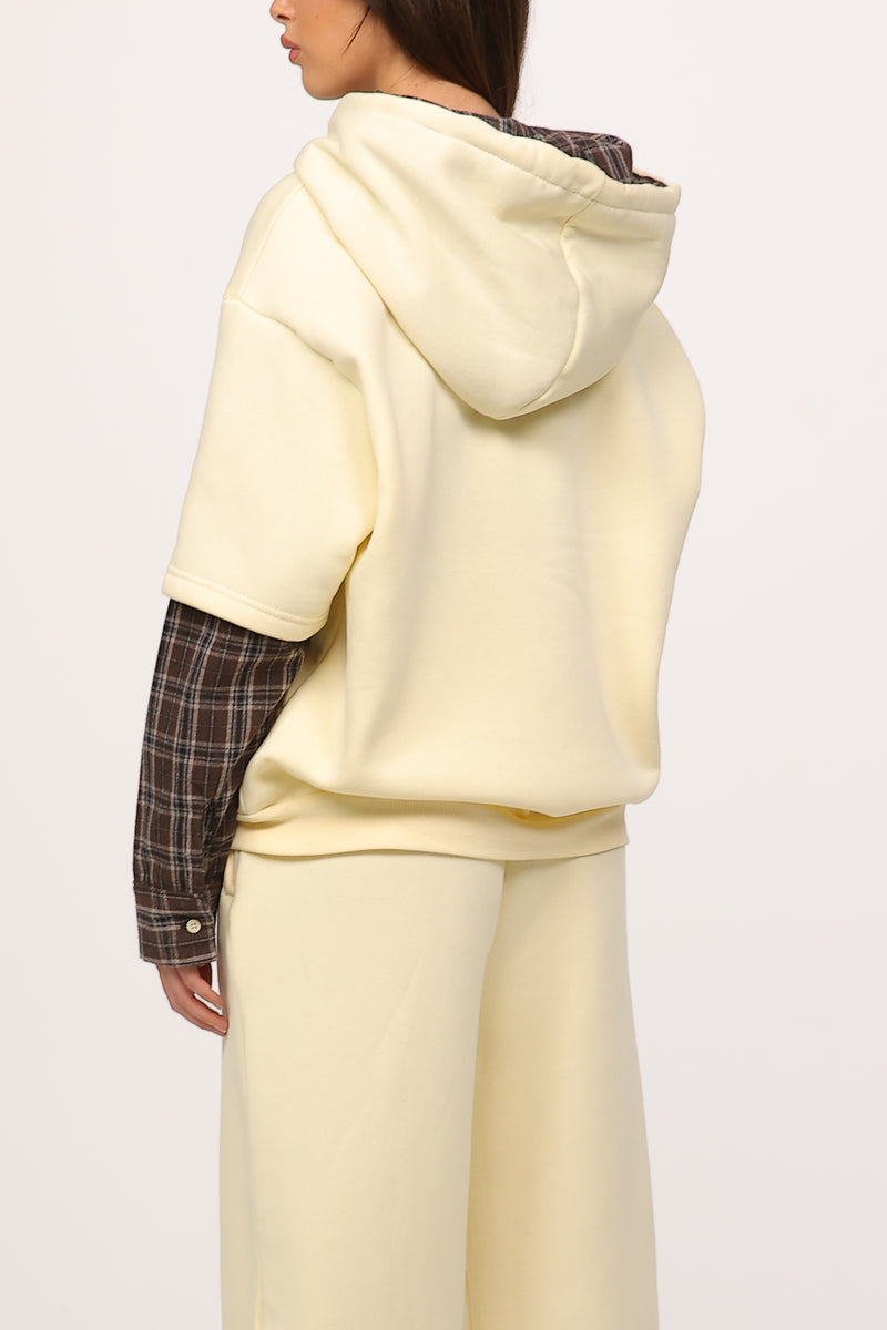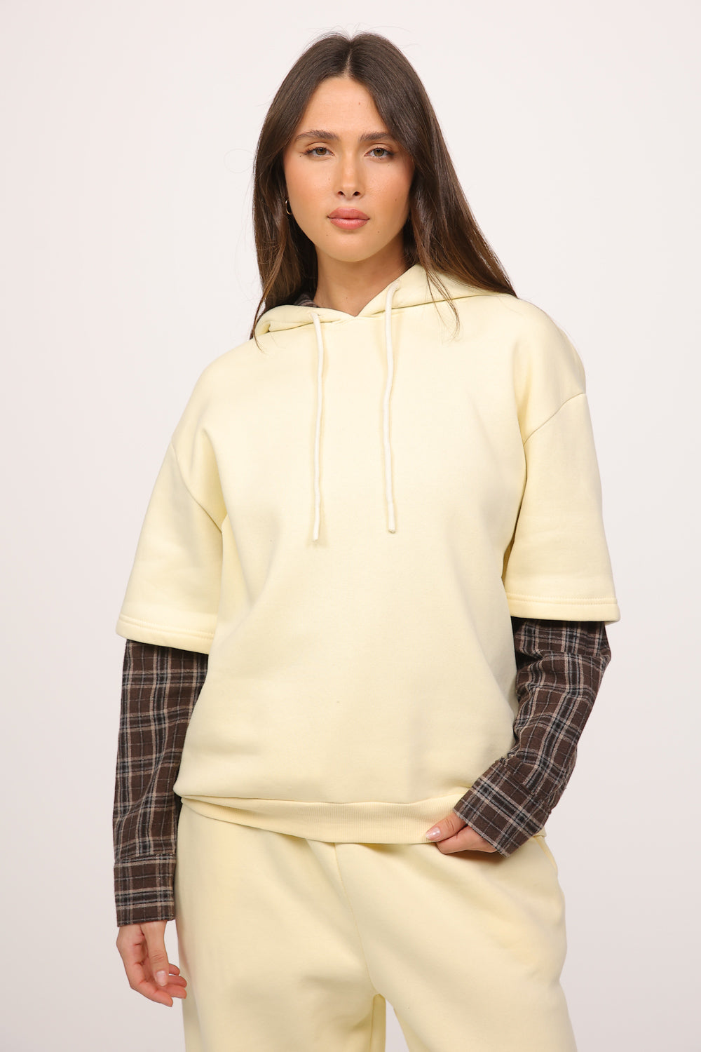 חליפה נינוחה בגזרה רחבה ונקייה, כוללת קפוצ’ון ומכנסיים תואמים. הקפוצ’ון מעוצב עם בטנת משבצות פנימית שמוסיפה עומק ועניין למראה המינימליסטי, וסגירה קדמית נוחה. המכנסיים בגזרה ישרה עם נפילה רכה, ליצירת לוק יומיומי מוקפד.