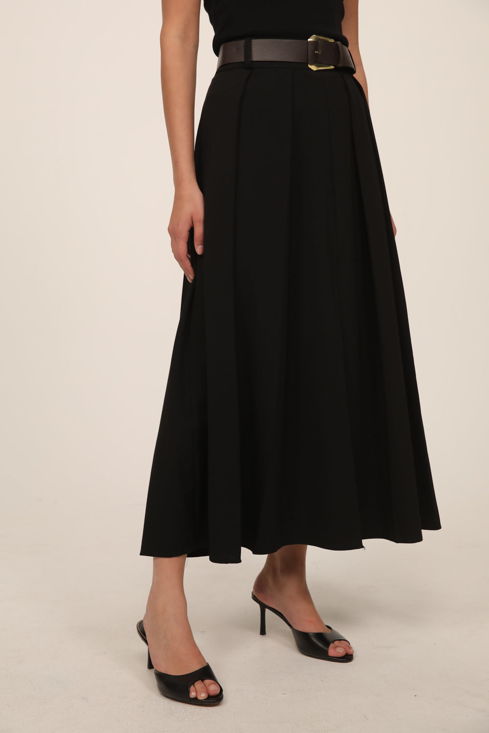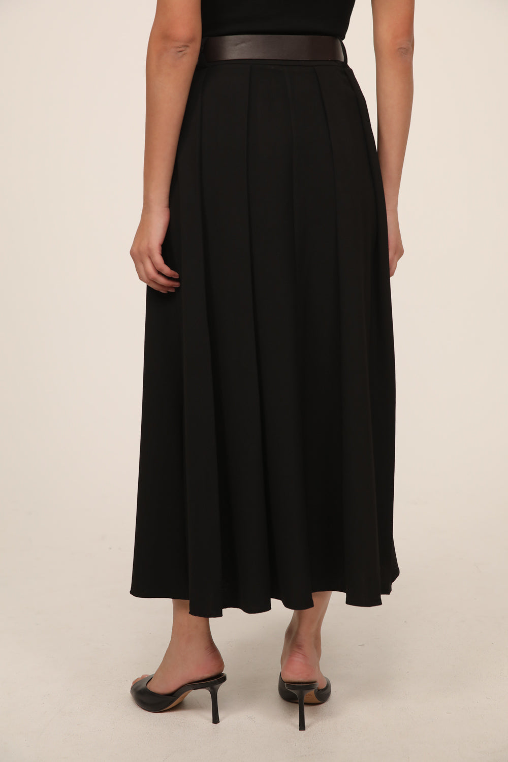 חצאית מידי בגזרה מחמיאה עם מותן גבוהה וחגורה תואמת המדגישה את קו המותן.