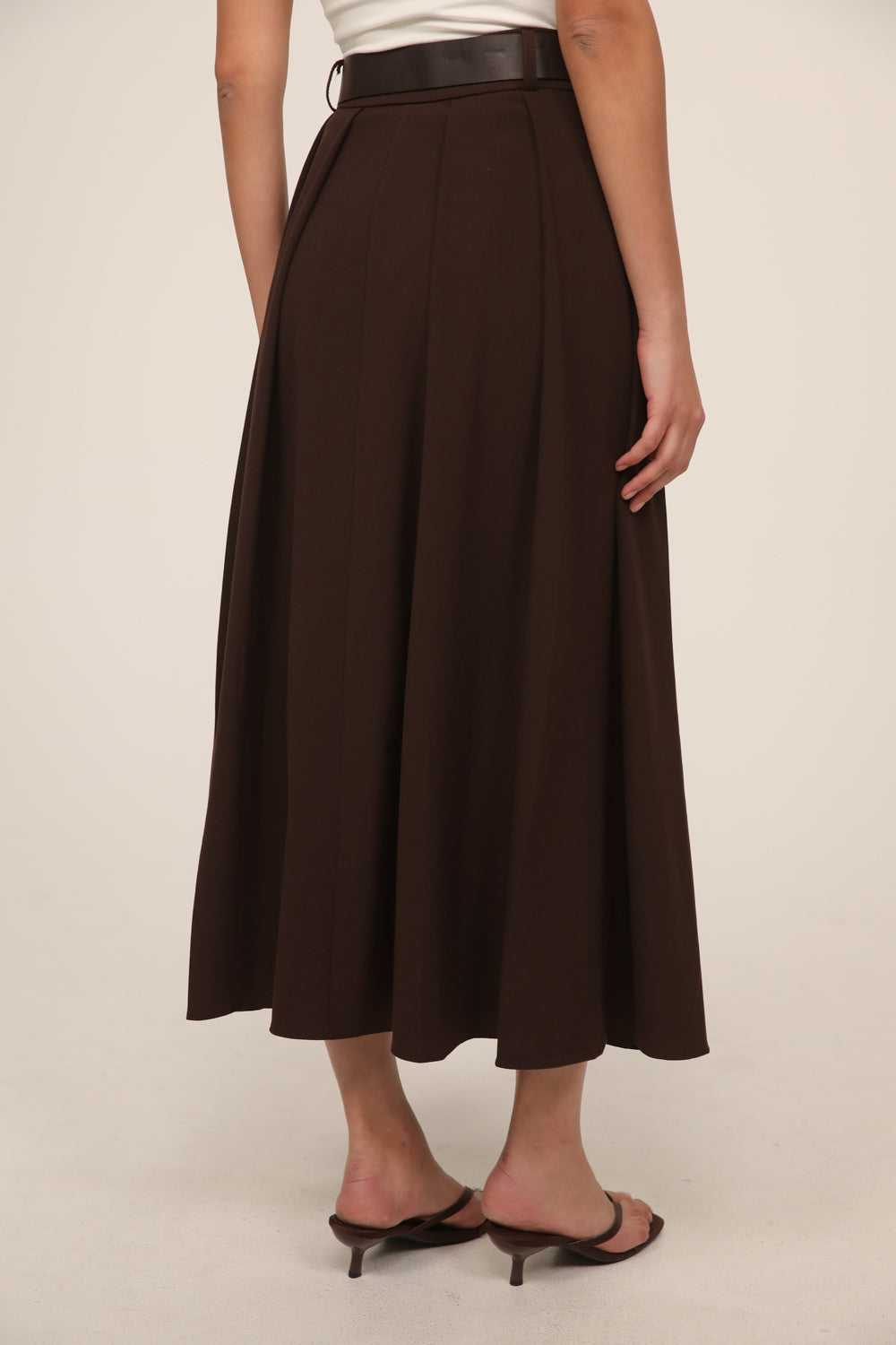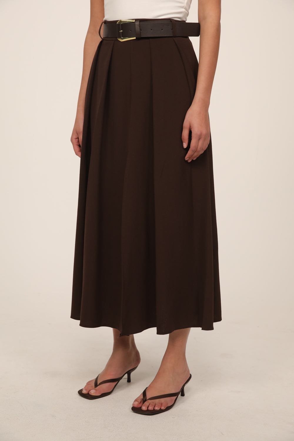 חצאית מידי בגזרה מחמיאה עם מותן גבוהה וחגורה תואמת המדגישה את קו המותן.