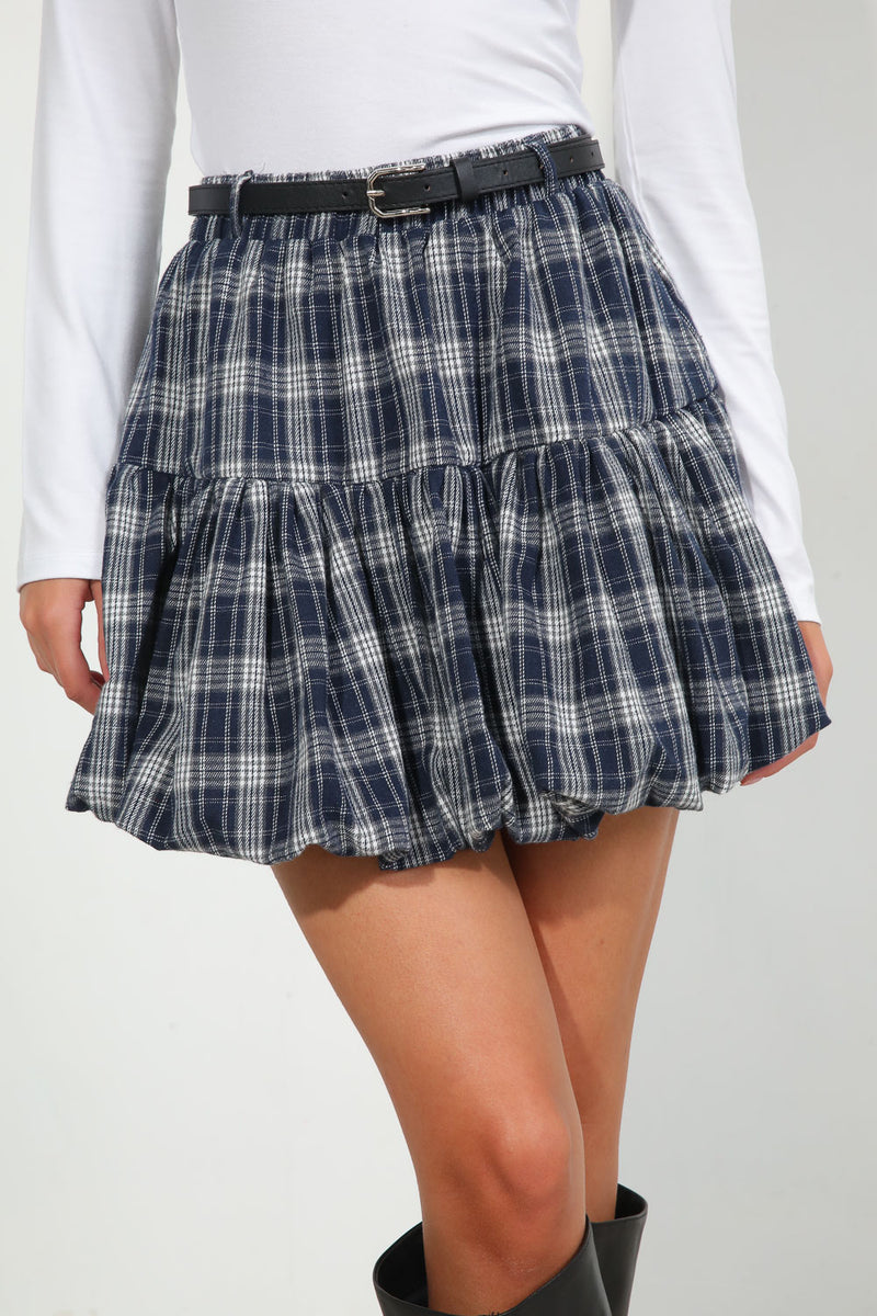 חצאית מיני משבצות בגזרת בלון, בשילוב חגורת דמוי עור שחורה,