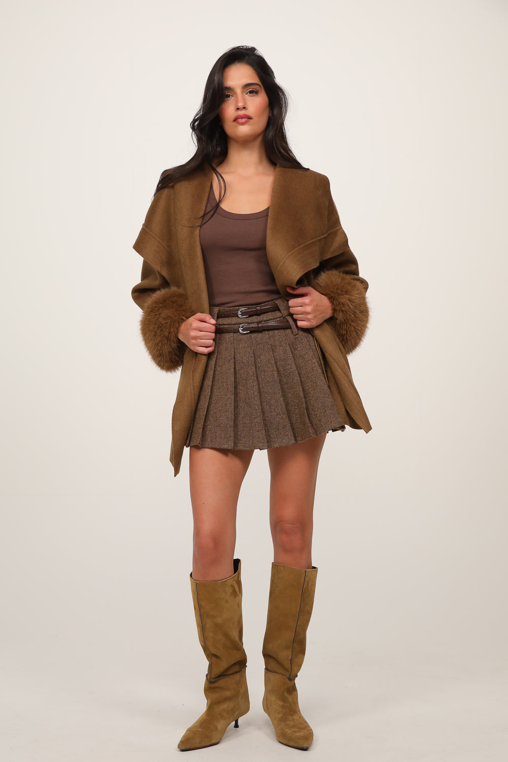 חצאית מיני בגזרת A עם קפלים עדינים, עשויה בד במראה מחויט עם טקסטורה עשירה. כוללת חגורת מותן מודגשת וסגירה נקייה למראה מסודר אך קליל. משתלבת בצורה מושלמת עם מגפיים, סריגים או חולצות צמודות, ומתאימה ללוק יומיומי עם טוויסט אורבני או לערב מוקפד.