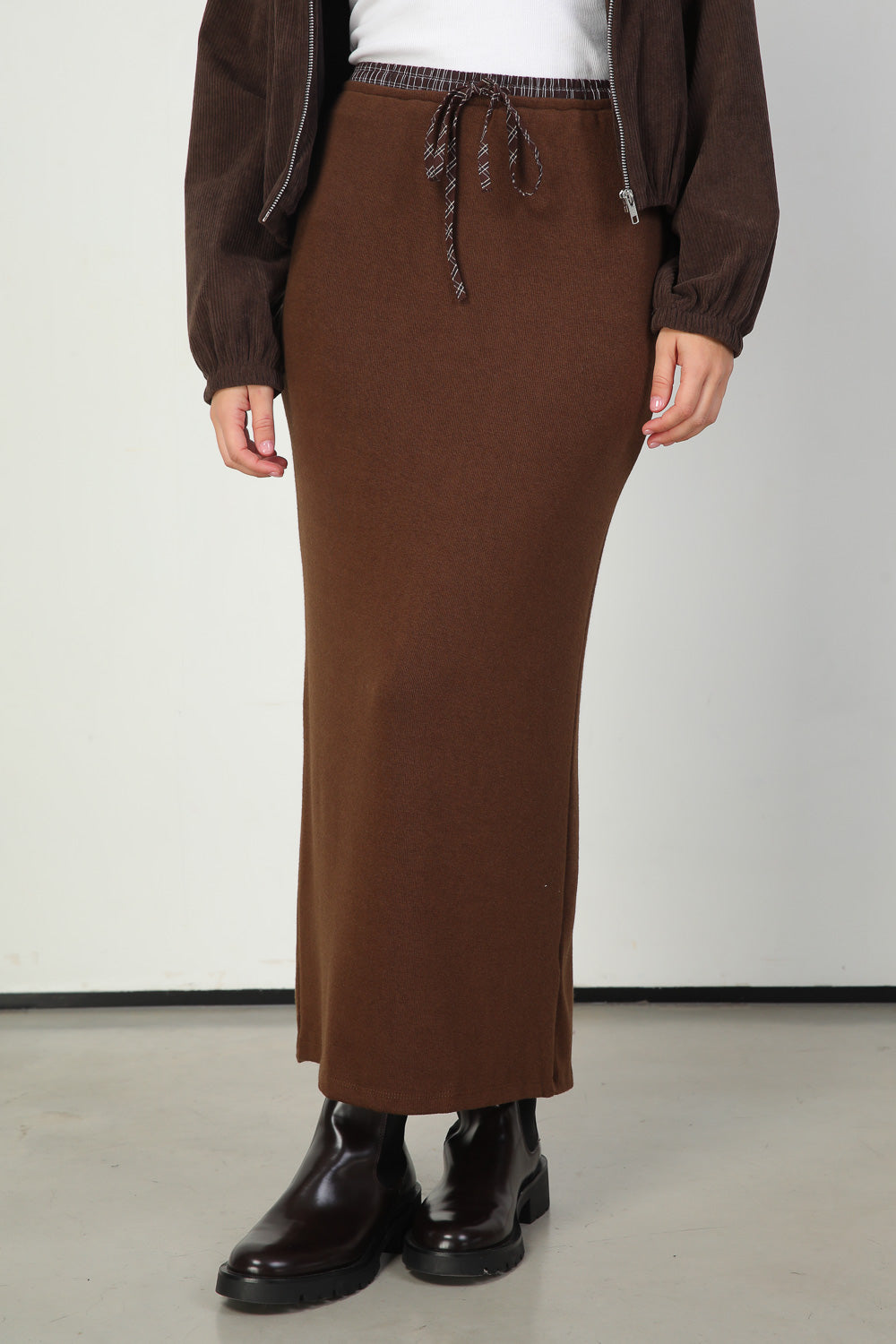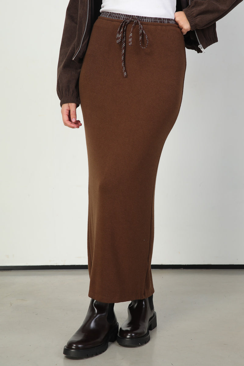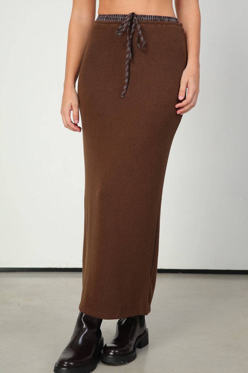 חצאית מקסי מבד רך ונעים בשילוב מנג'ט גומי משובץ במותן עם שרוך קשירה תואם.