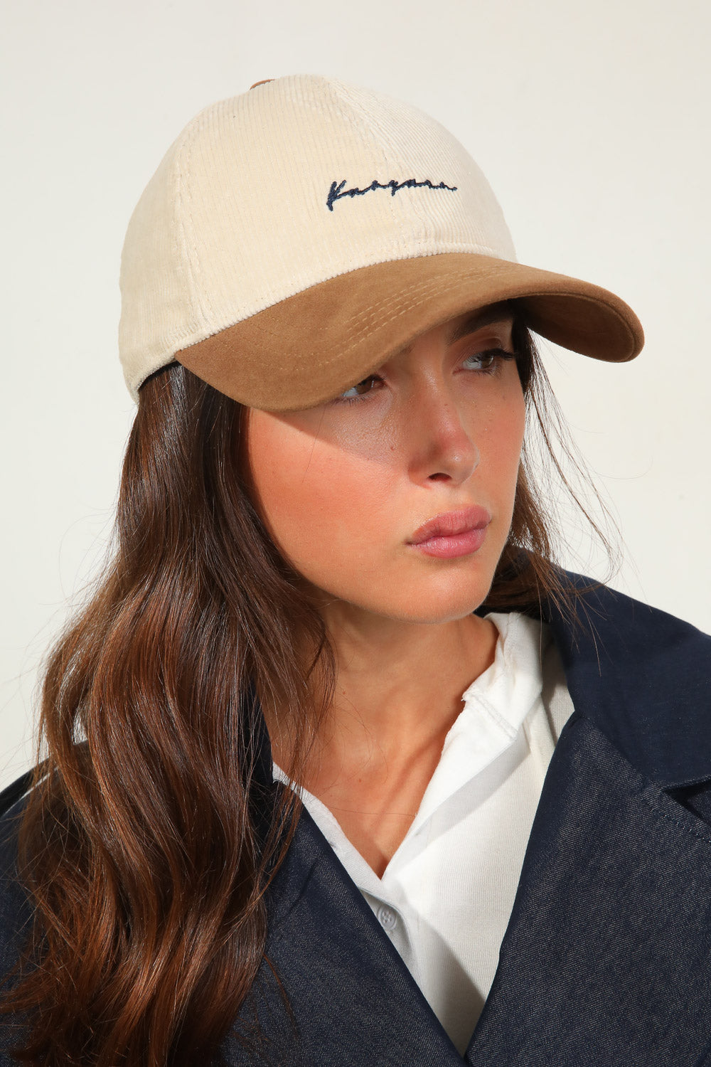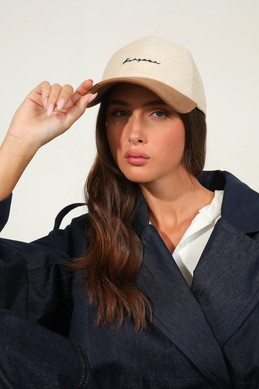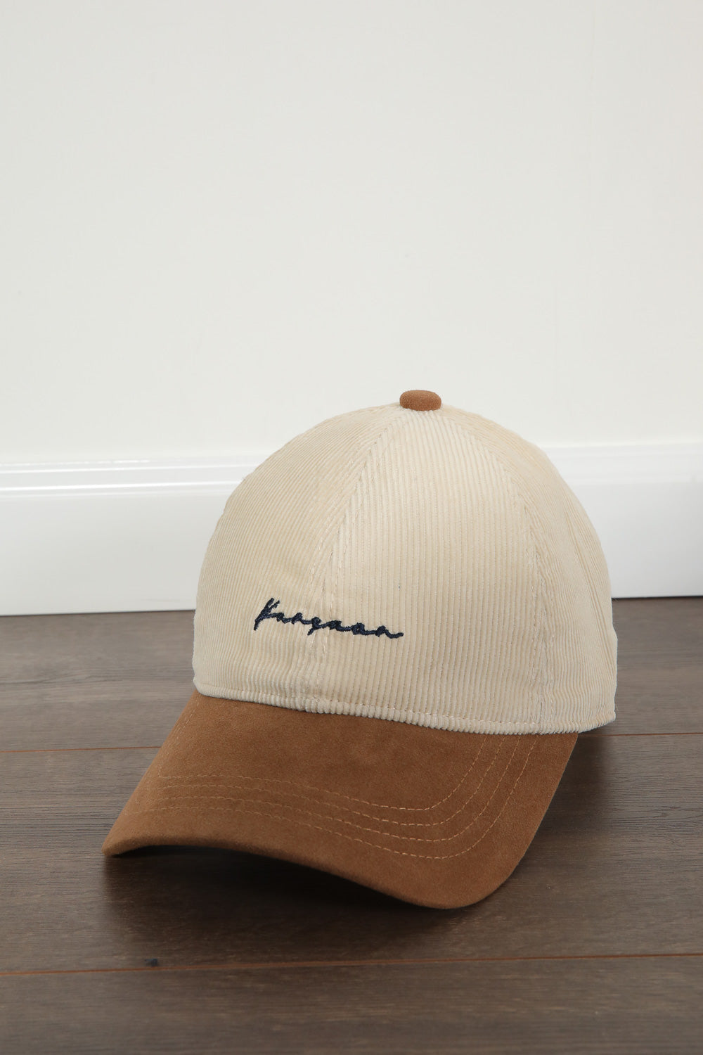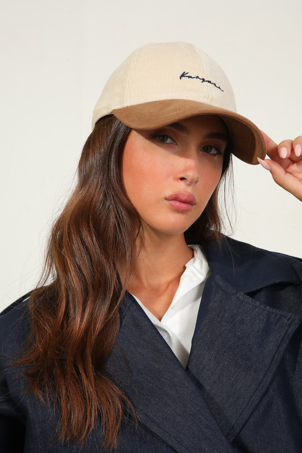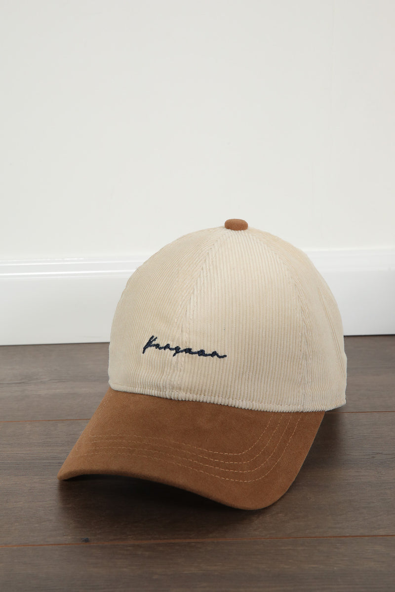 כובע מצחיה בטקסטורת קורדרוי בשילוב רקמה בחזית.