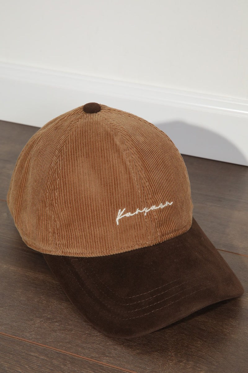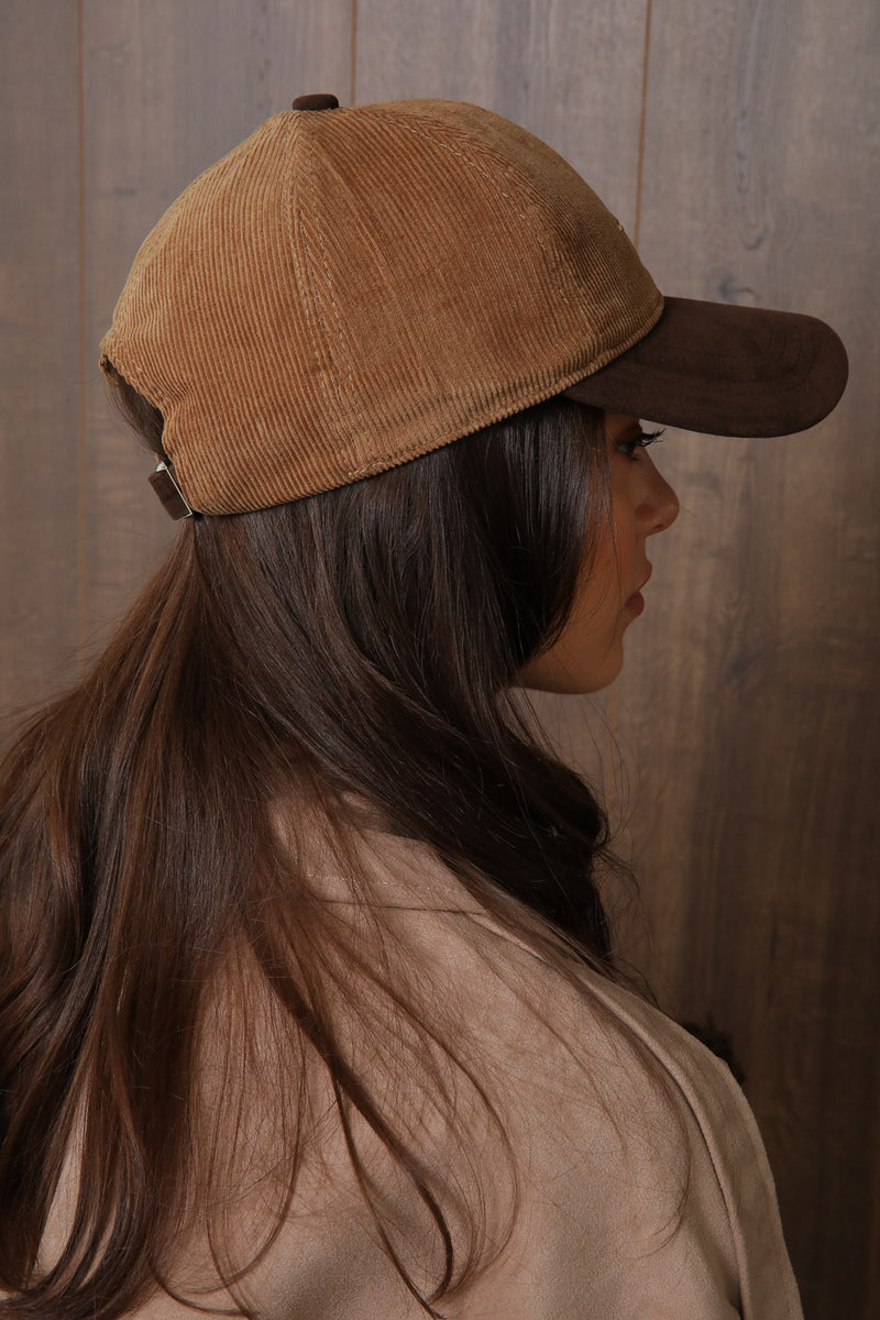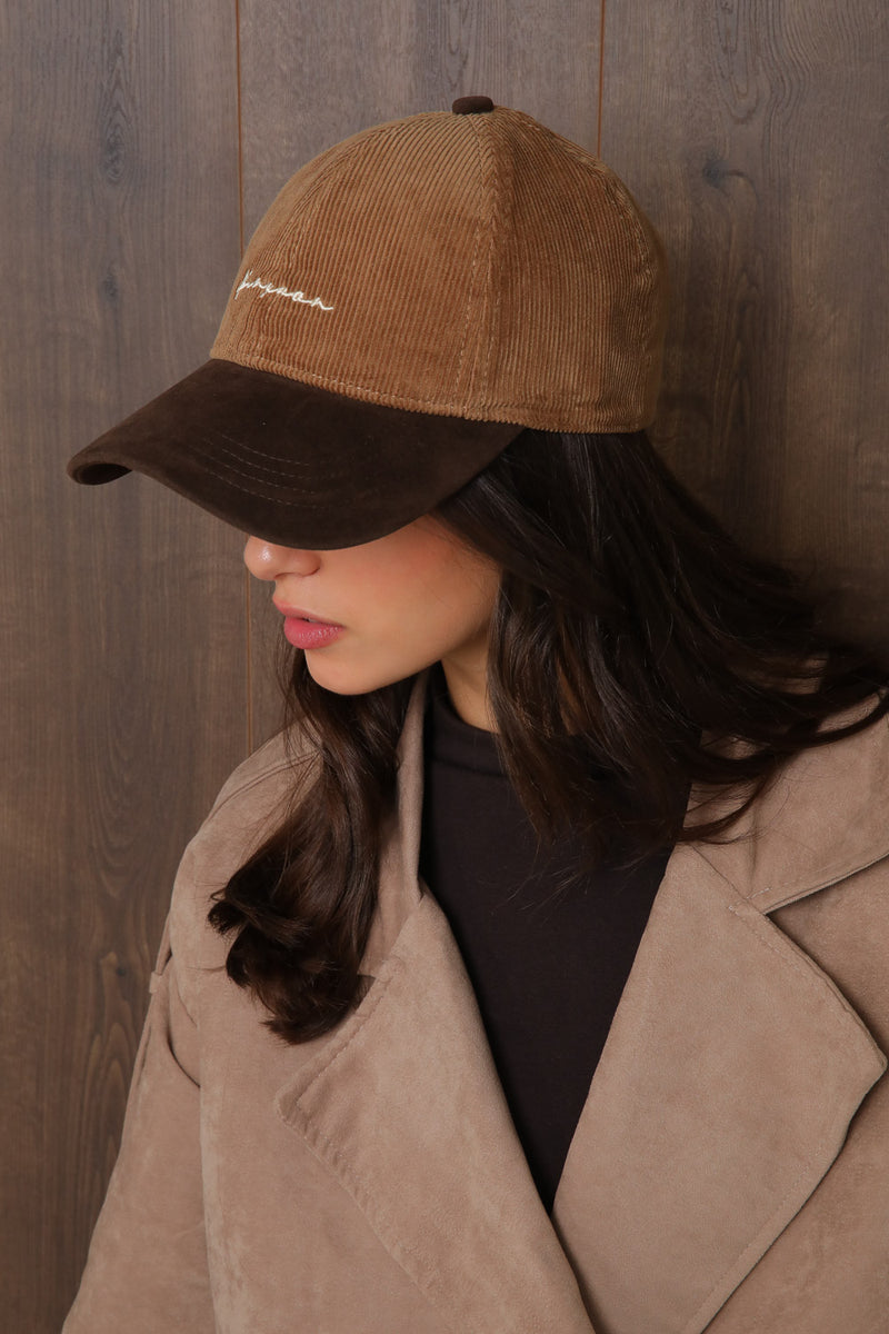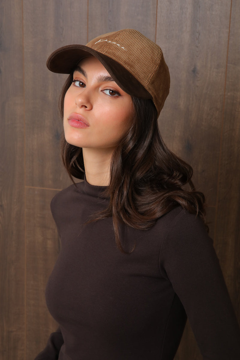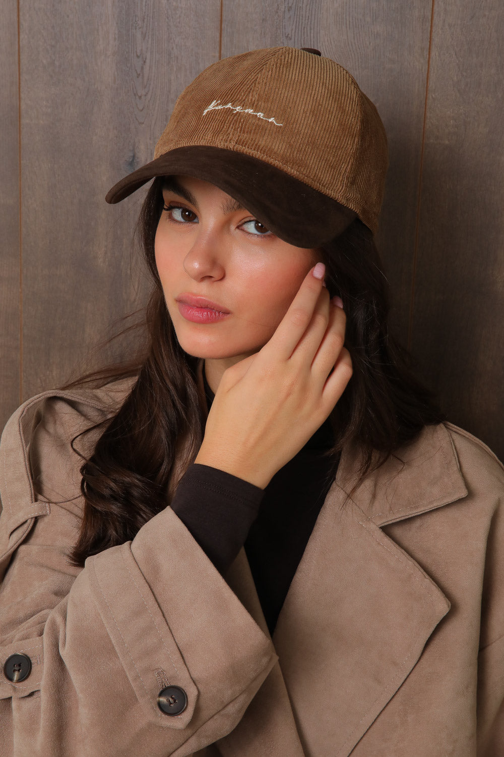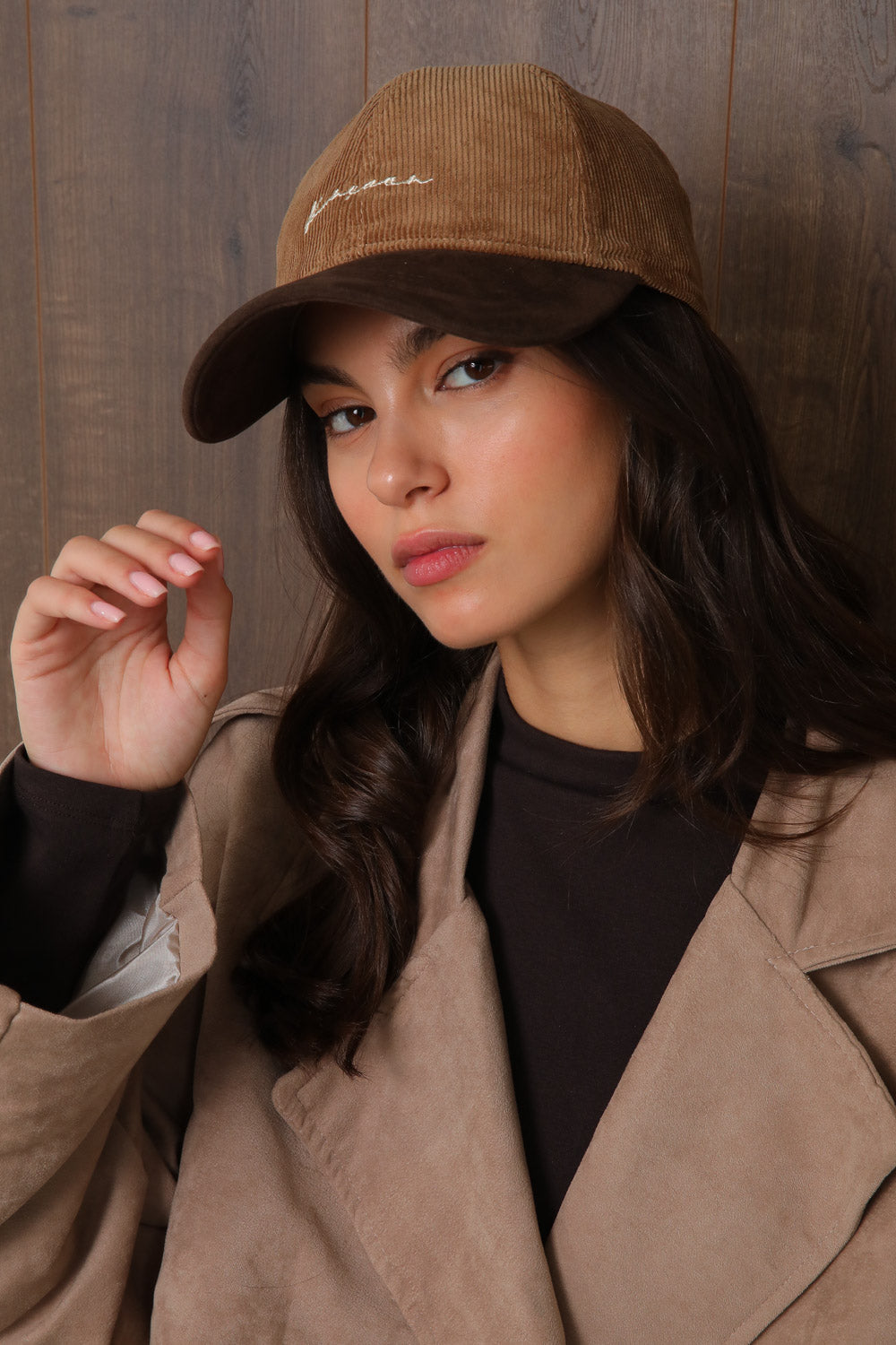 כובע מצחיה בטקסטורת קורדרוי בשילוב רקמה בחזית.