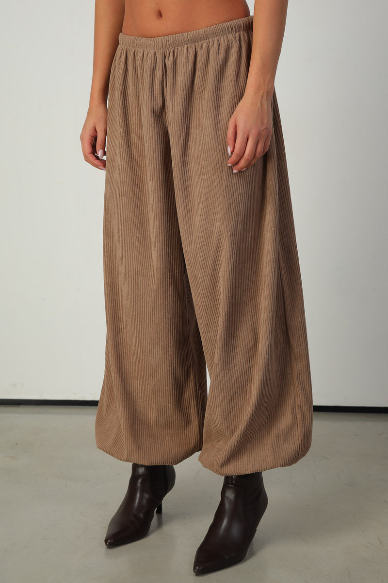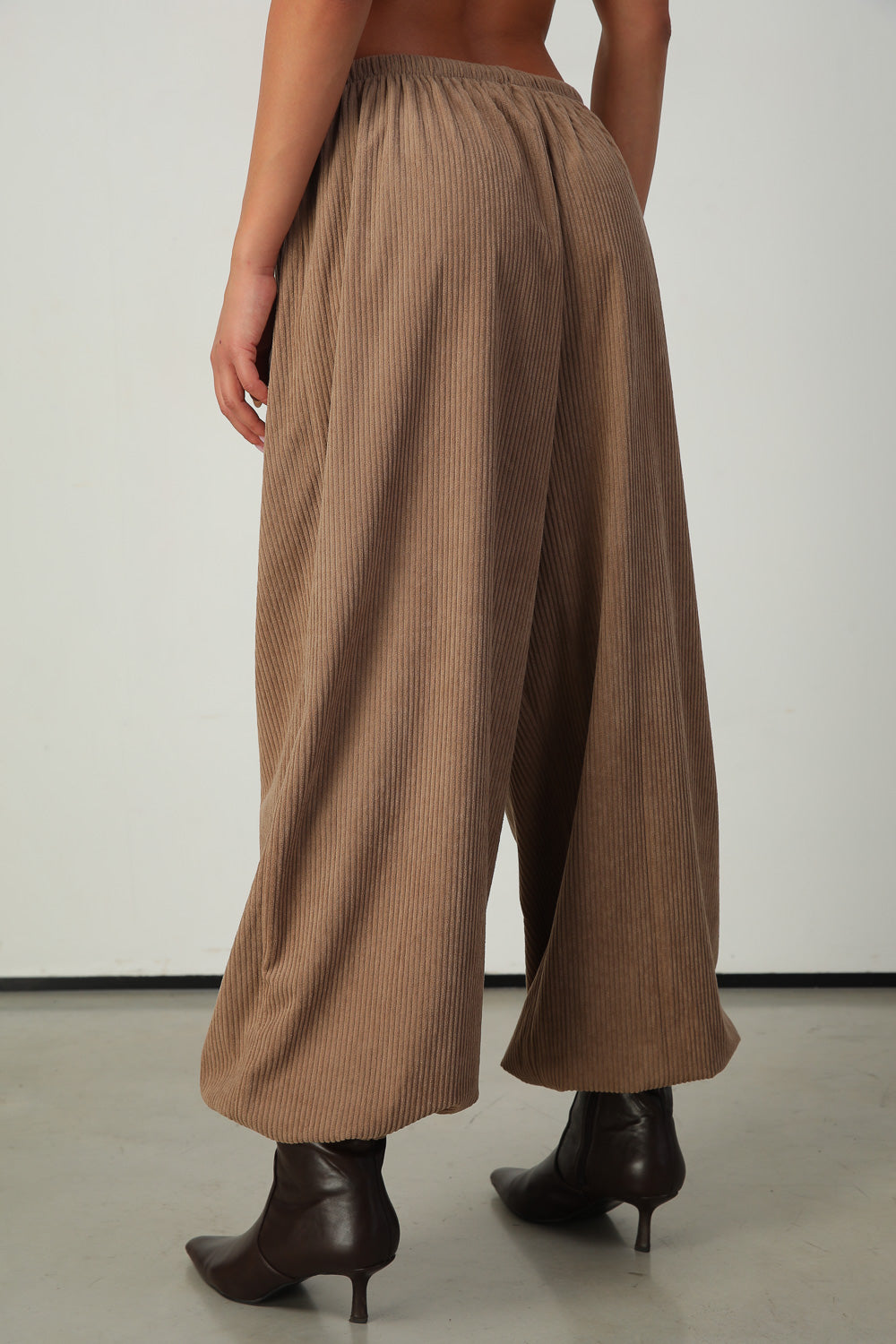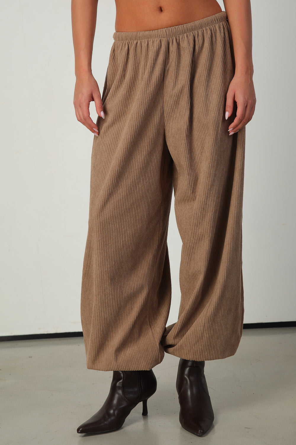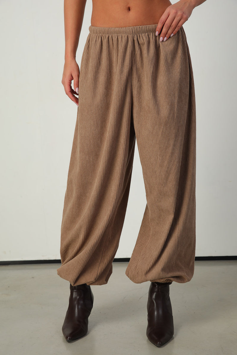 מכנס קורדרוי בגזרת בלון עם מנג'ט גומי במותן ושרוך קשירה לנוחות מירבית,
