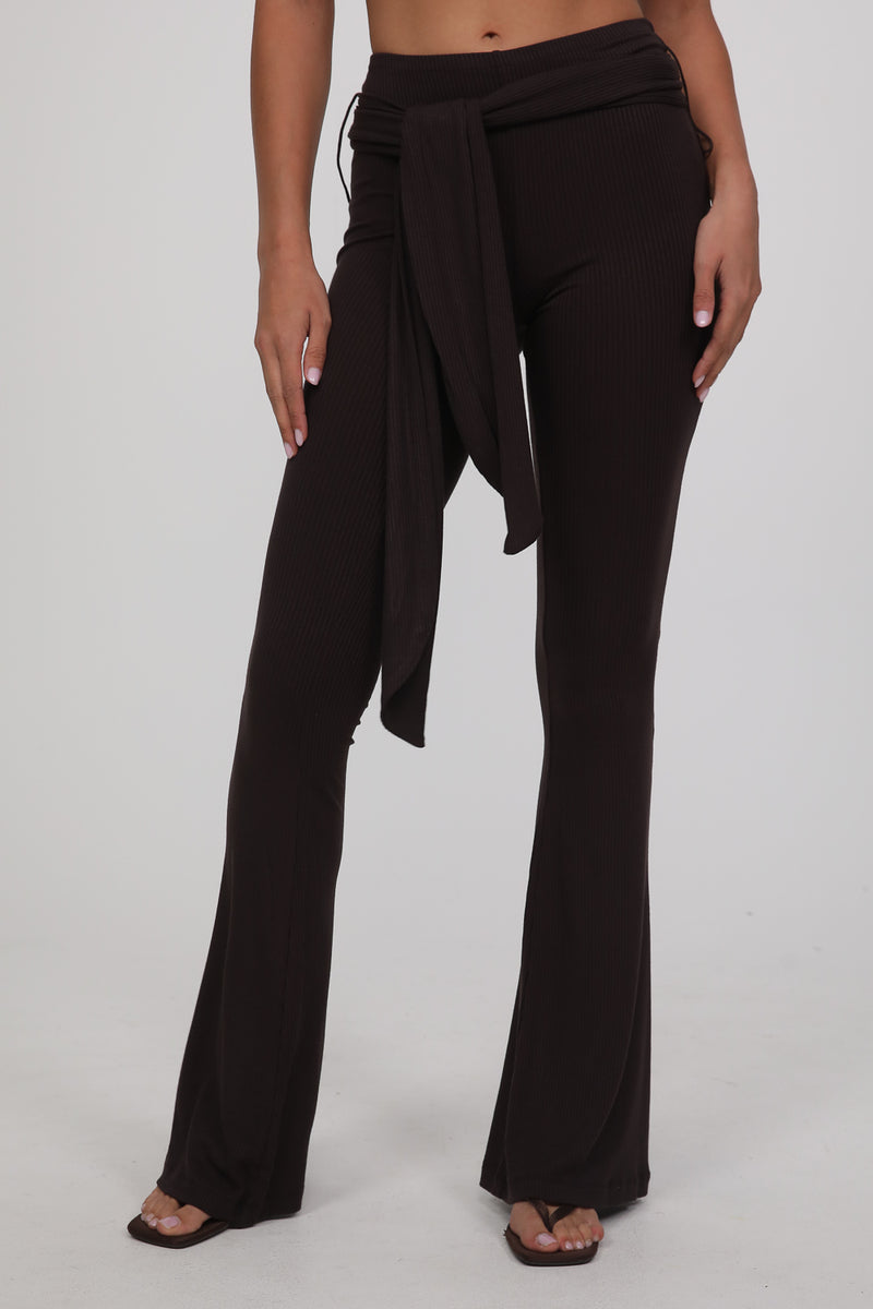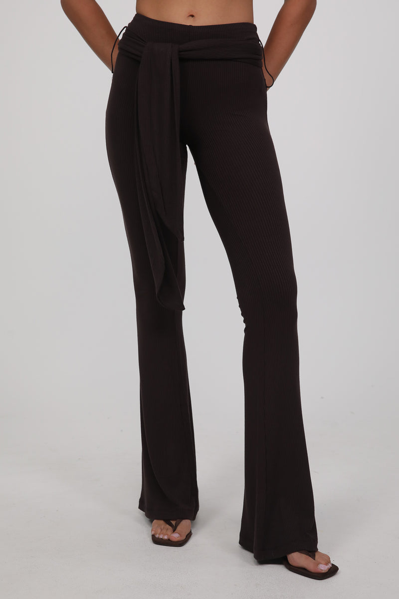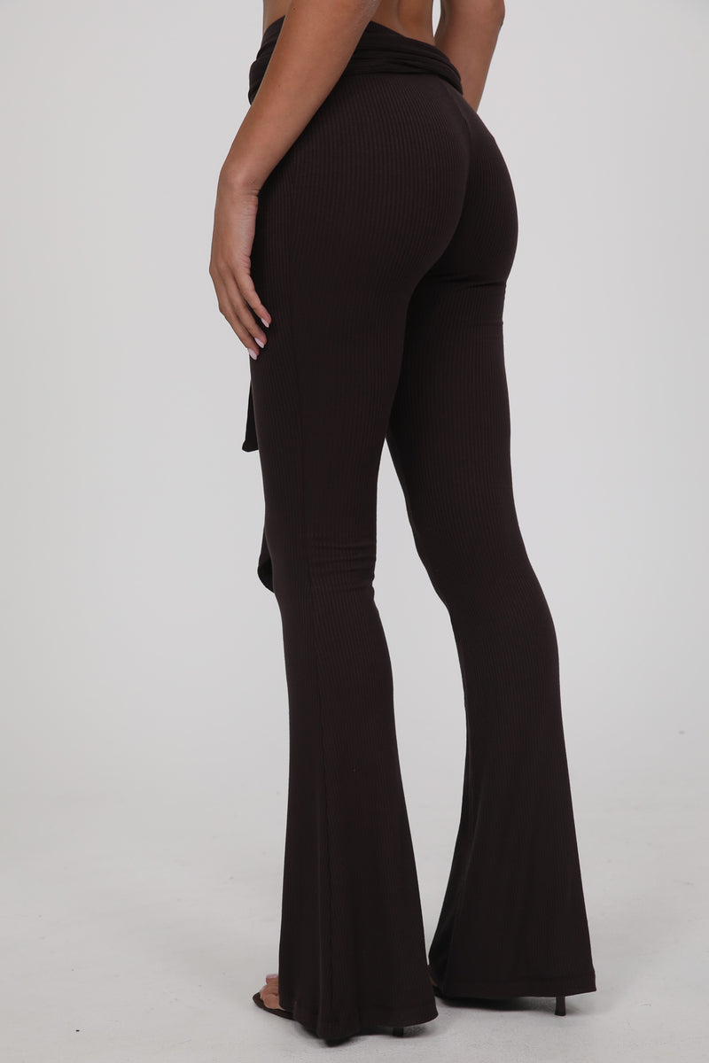 עשוי בד רך ונעים בגוון חום עמוק, עם גזרה צמודה בחלק העליון והתרחבות קלה כלפי מטה שמאריכה את קו הרגל.