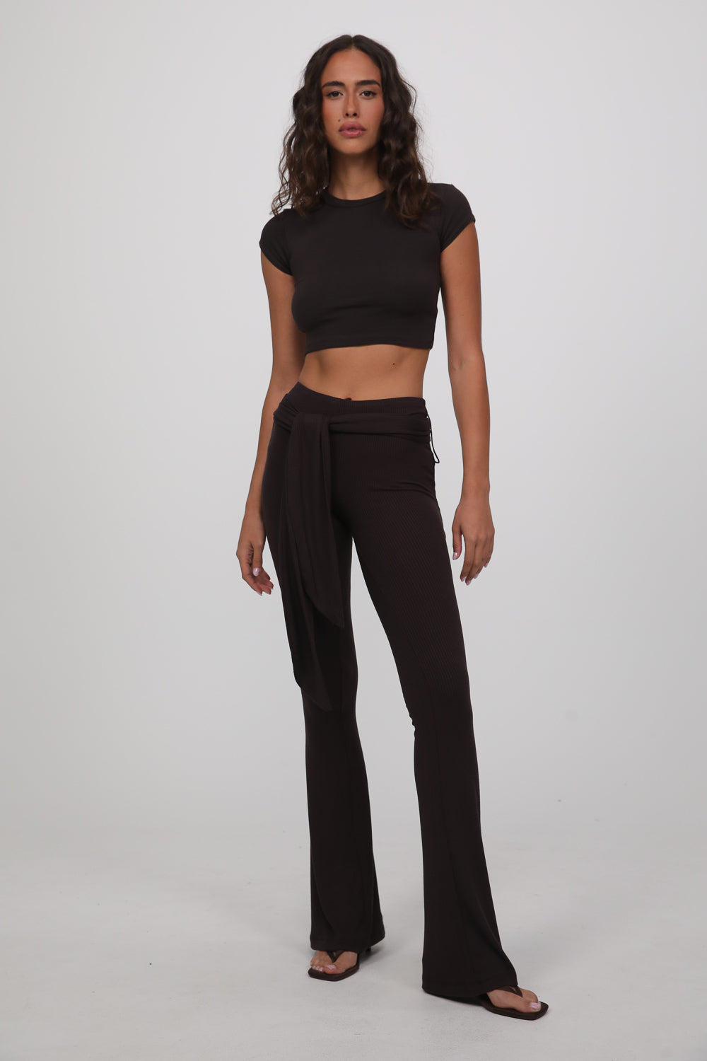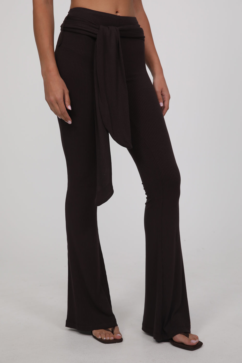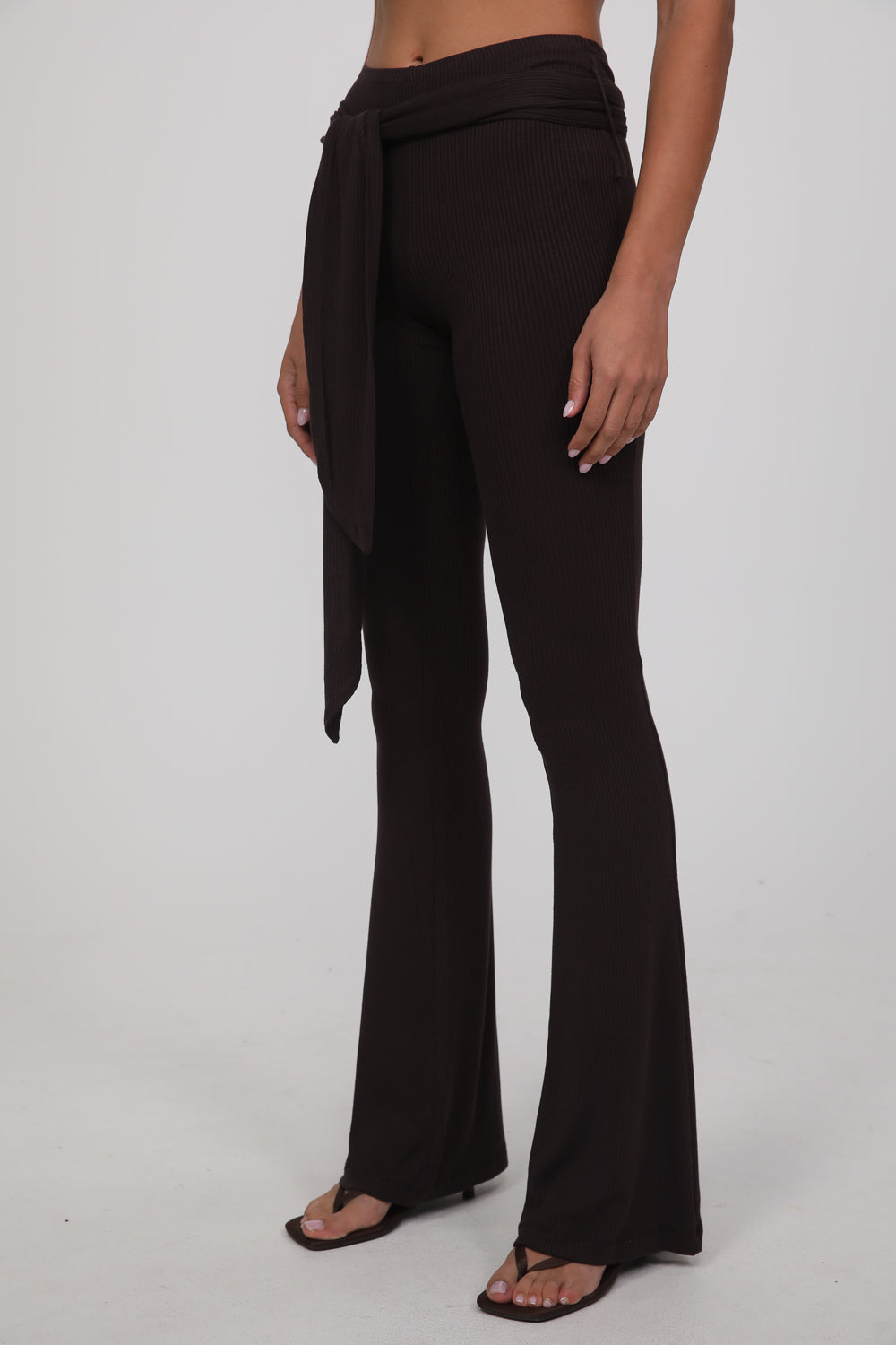 עשוי בד רך ונעים בגוון חום עמוק, עם גזרה צמודה בחלק העליון והתרחבות קלה כלפי מטה שמאריכה את קו הרגל.