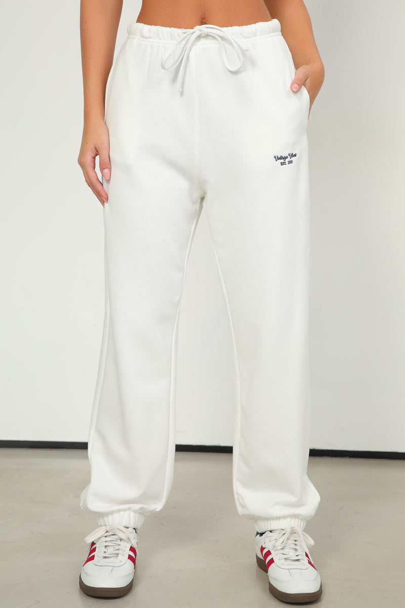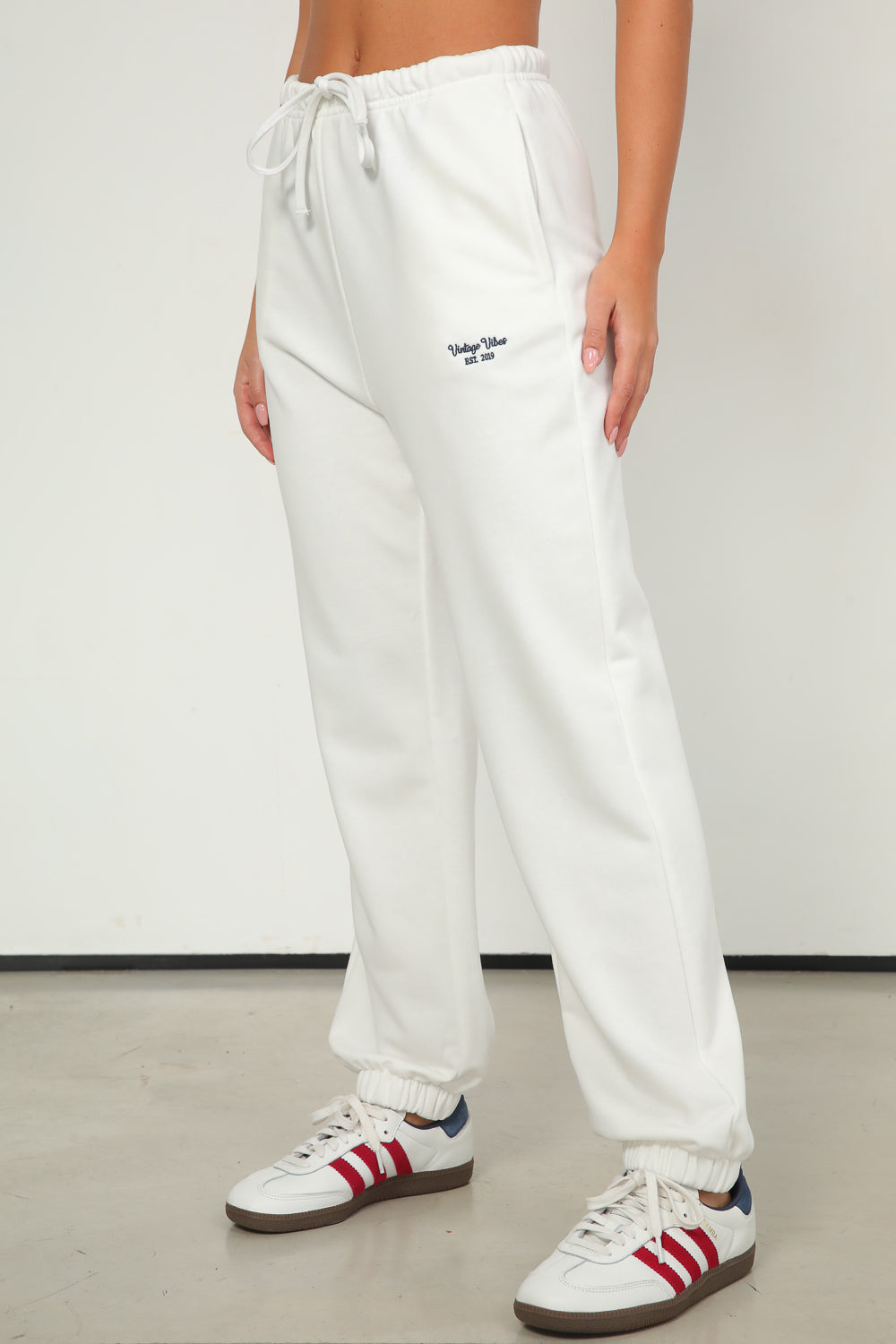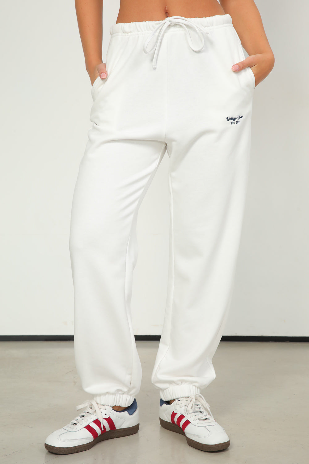 מכנס פוטר מבד רך ונעים עם מנג'ט גומי במותן ובסיומת, בשילוב רקמת וינטג וויב בחזית,