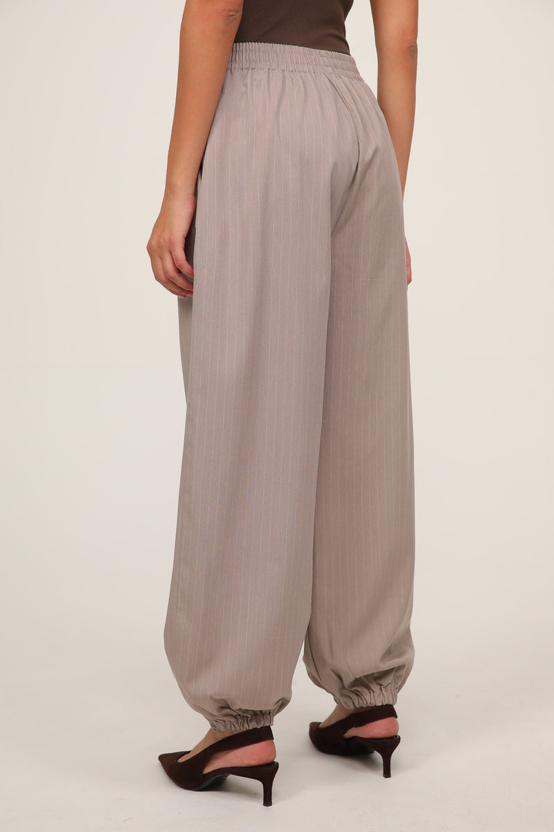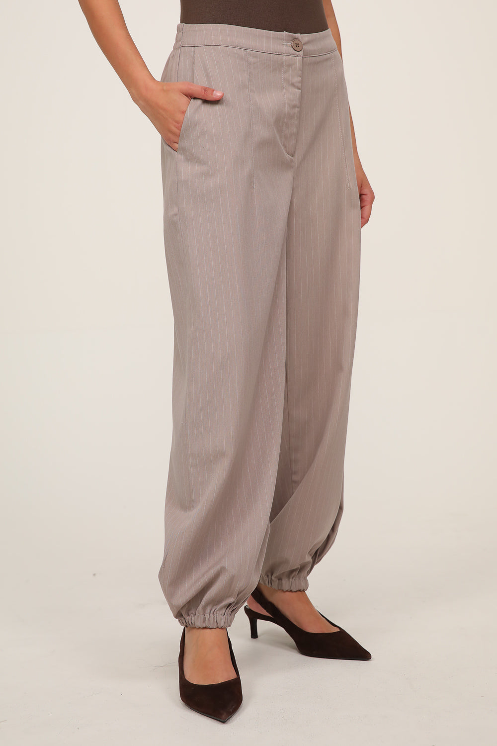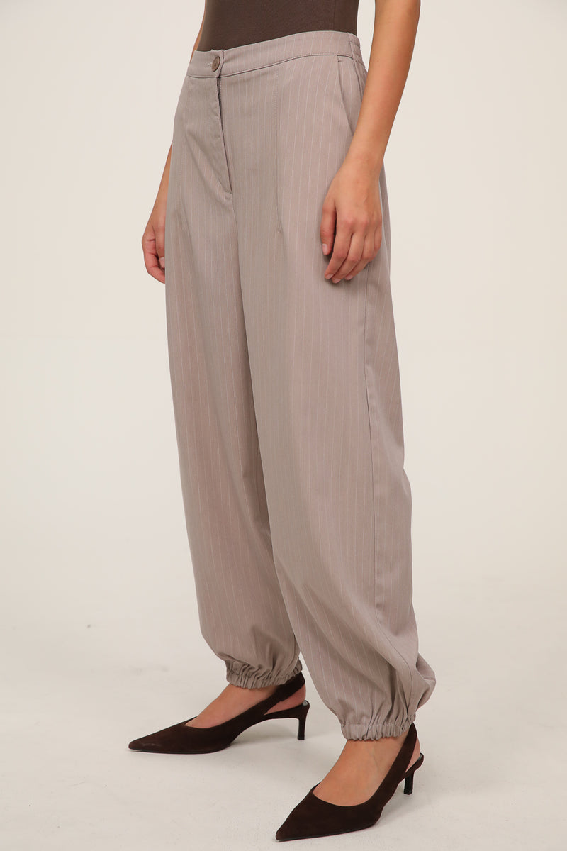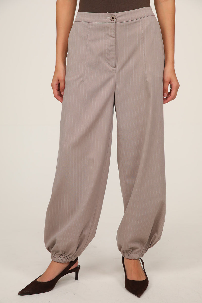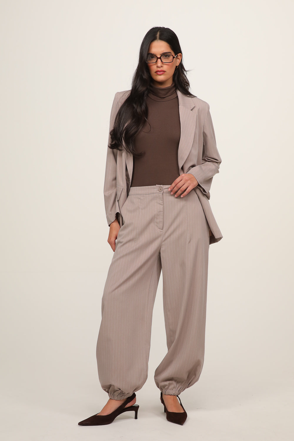 מכנסיים בגזרה משוחררת עם מראה מחויט ורך. עשויים בד בטקסטורת פסים עדינה בגוון בז', עם מותן גבוהה, קפלים קדמיים וגומי מאחור לנוחות מקסימלית. הרגל מתרחבת בעדינות ויוצרת סילואט אלגנטי שמתאים ליום ולערב. מושלמים לשילוב עם ג’קט תואם לסט מוקפד או עם טופ חלק ללוק קז’ואלי מחויט.