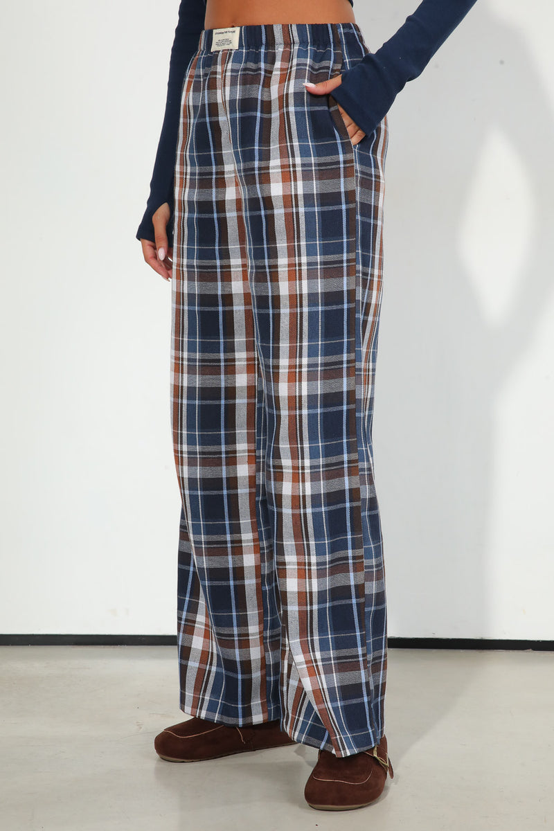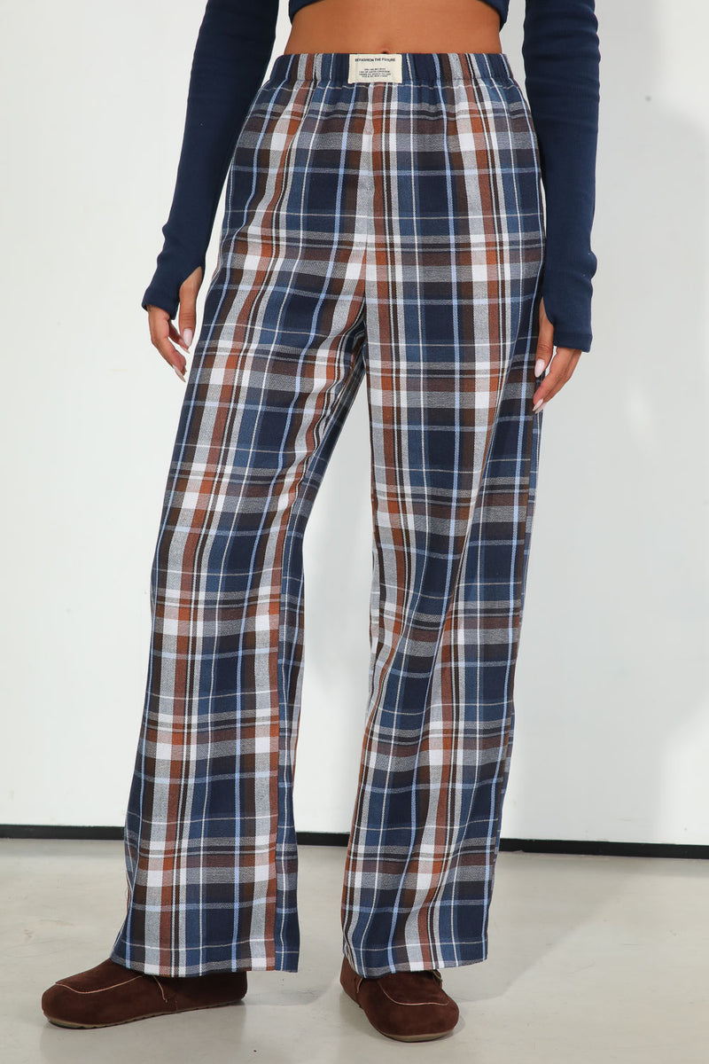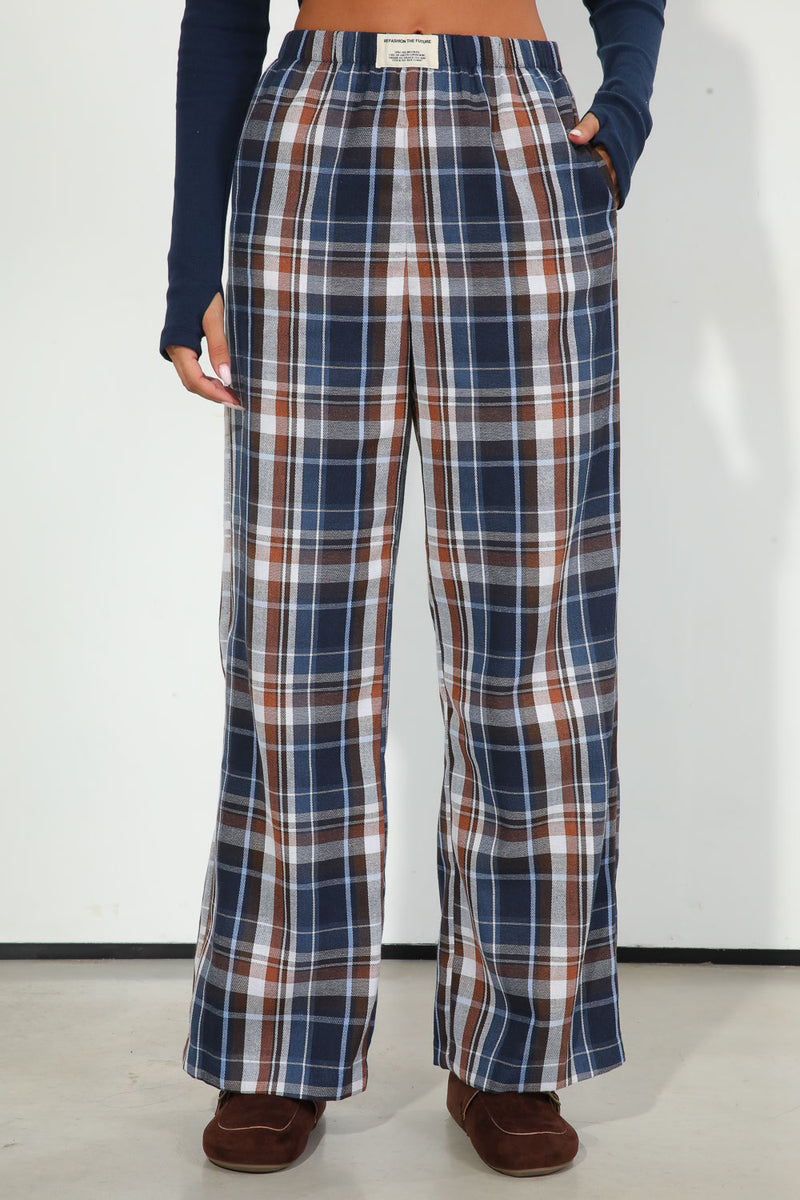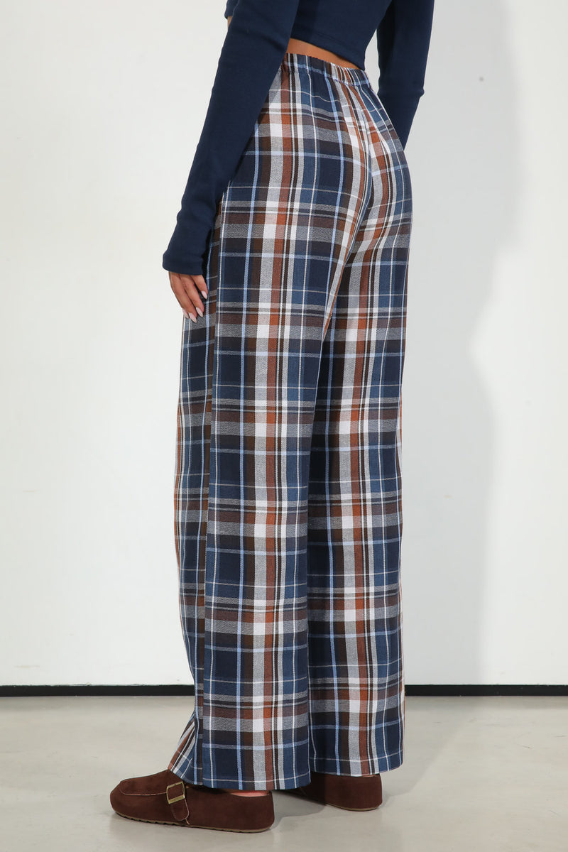 מכנס משבצות בגזרה רחבה עם מנג'ט גומי במותן בשילוב פאץ' בחזית,