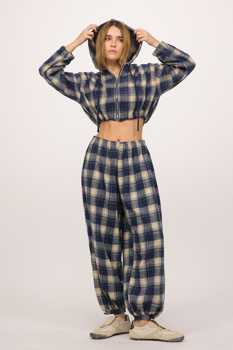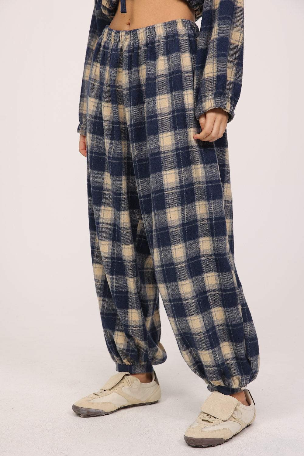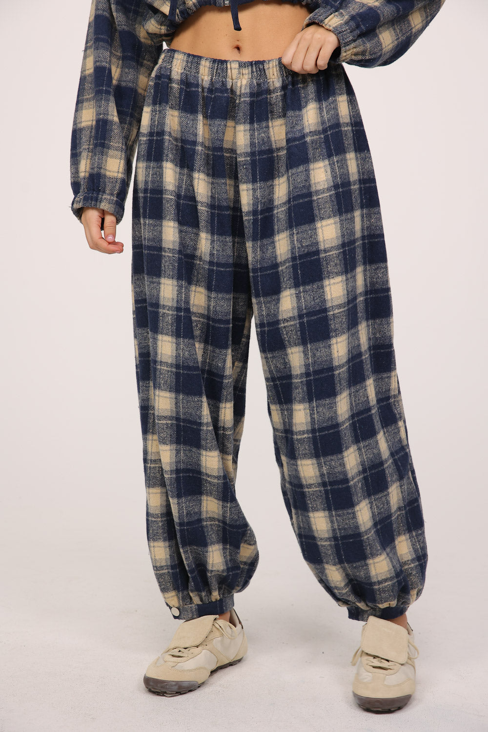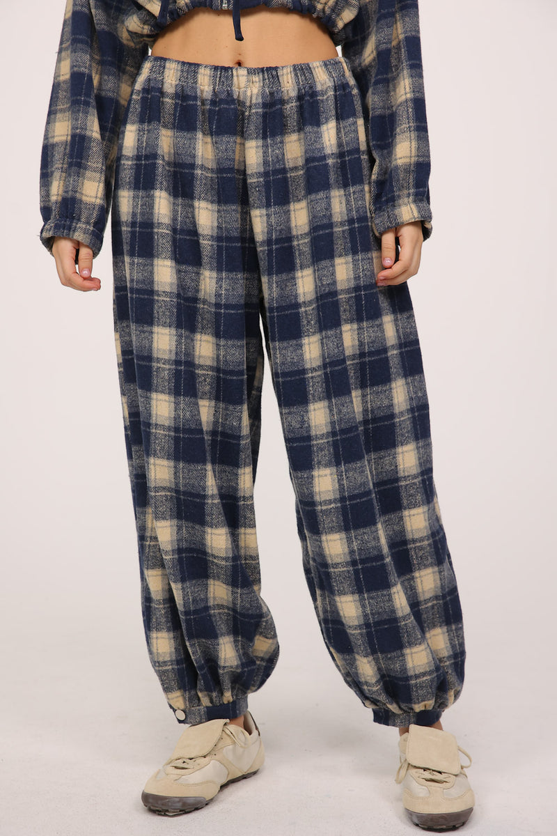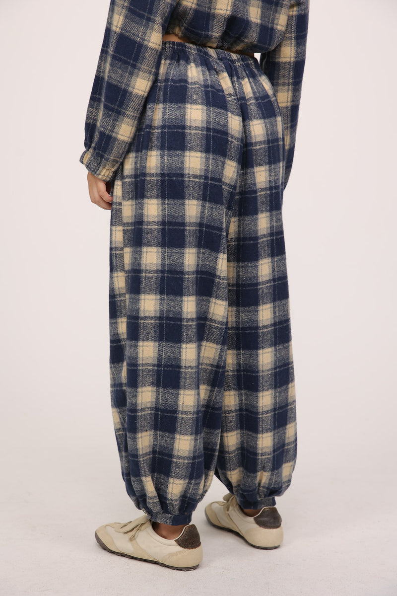 מכנס משובץ בגזרה רחבה עם גומי במותן לנוחות מקסימלית.