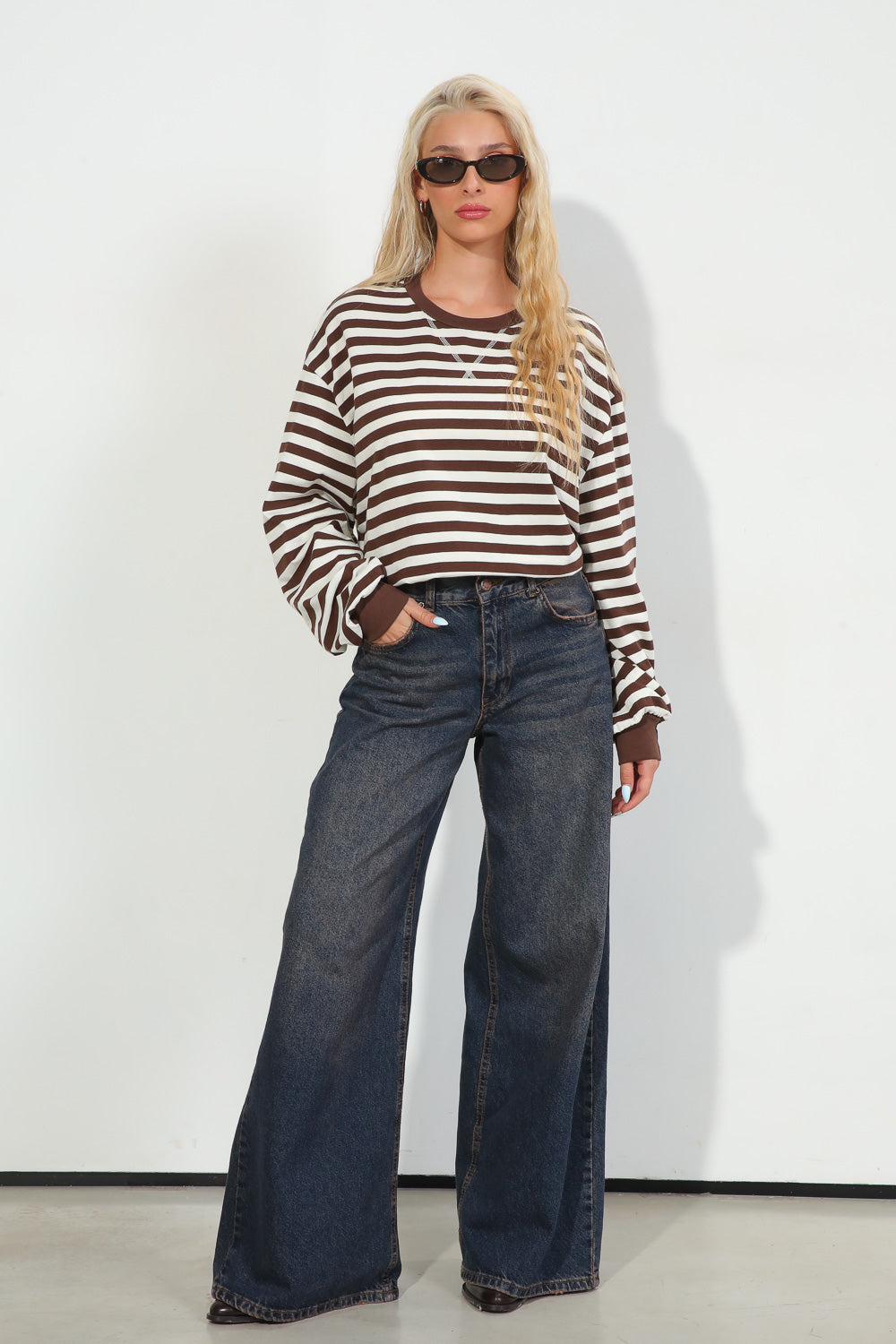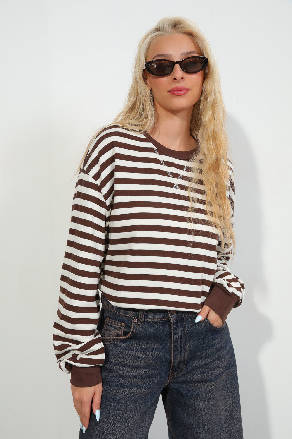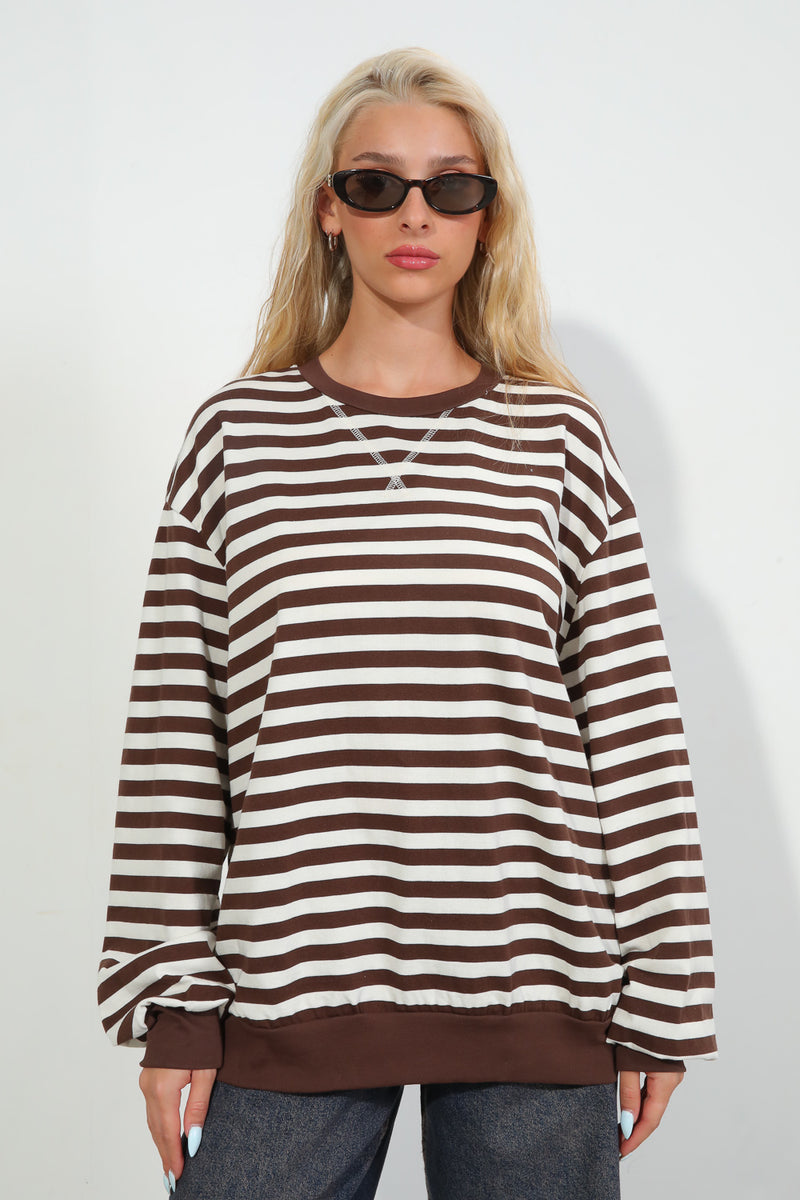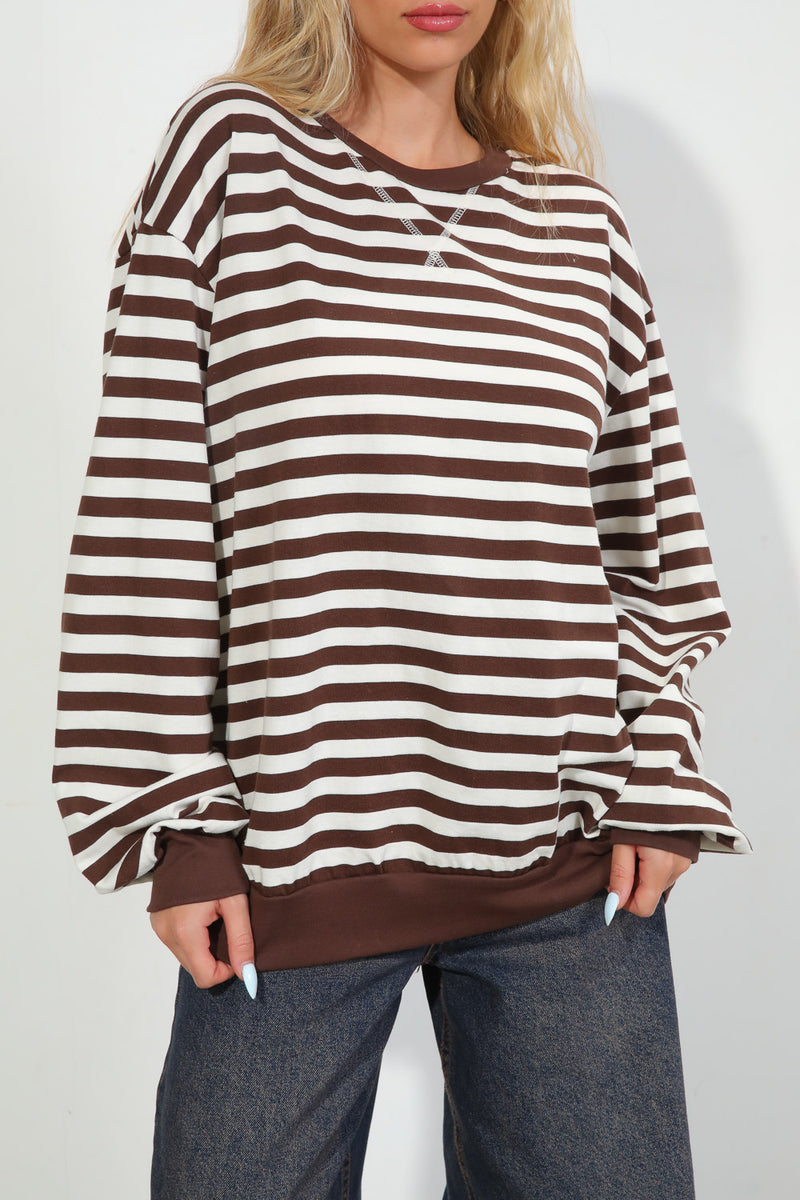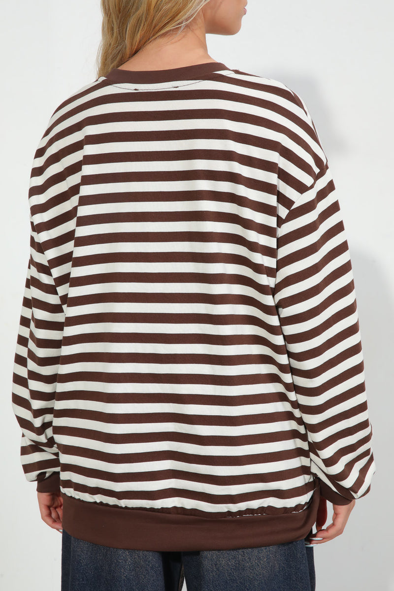 סווטשירט פסים בגזרת אוברסייז עם צוואת עגול ומנג'ט גומי בטקסטורת ריפ,