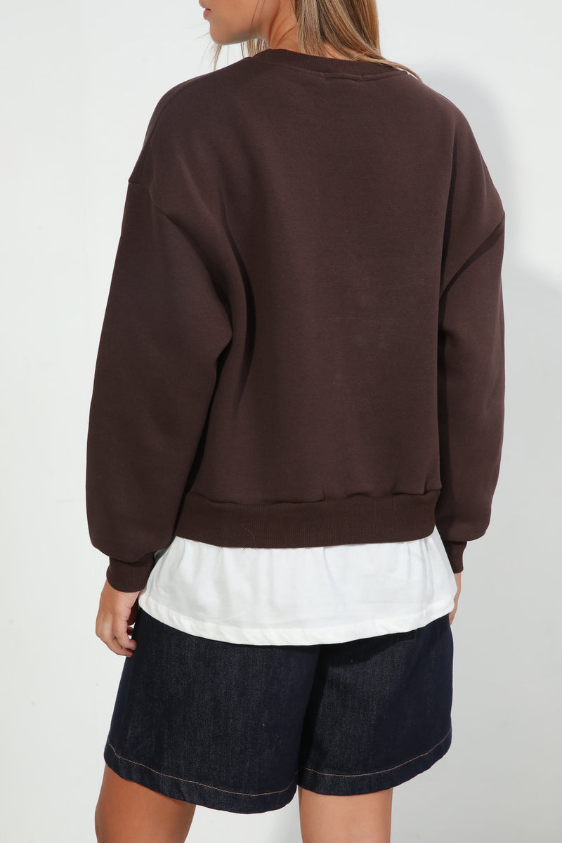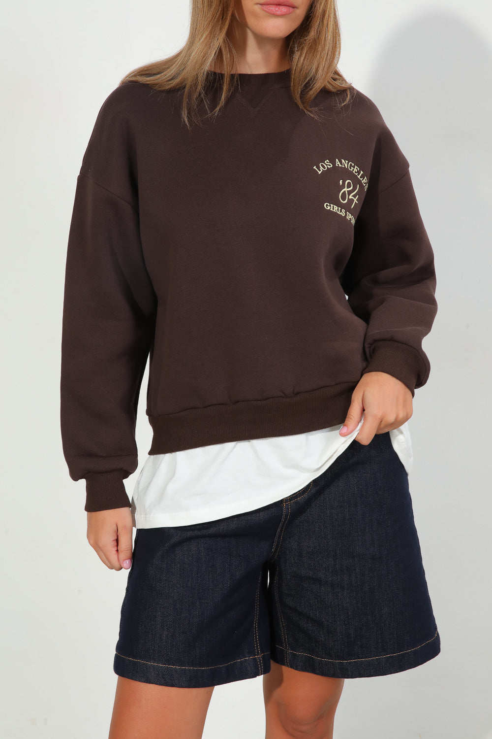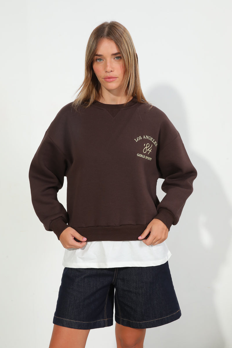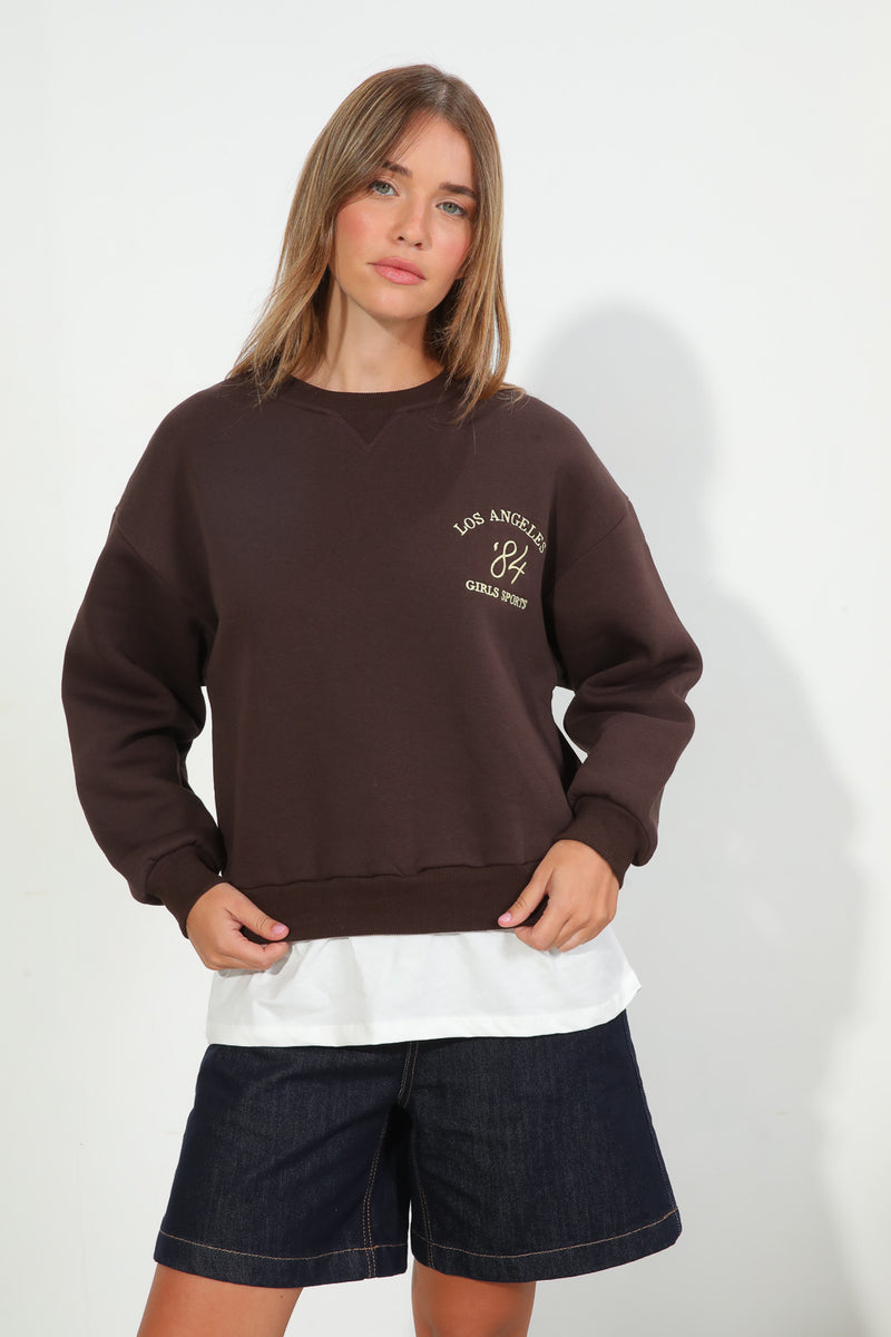 סווטשירט עם צווארון עגול, רקמה בחזית ובד פרקל לבן תפור בסיומת,