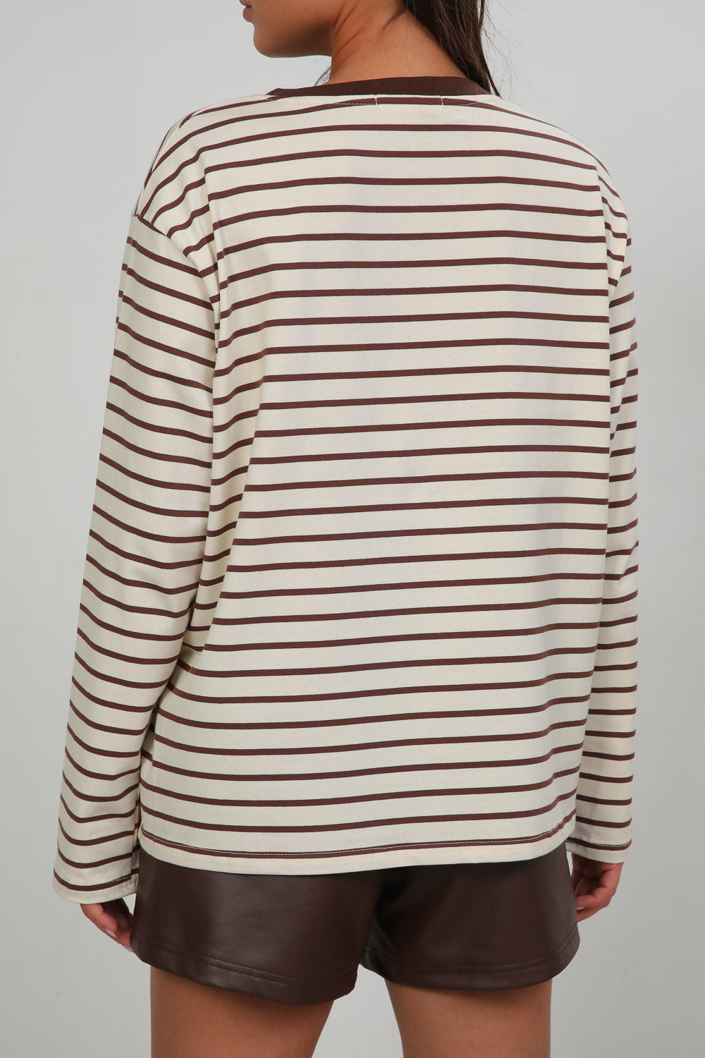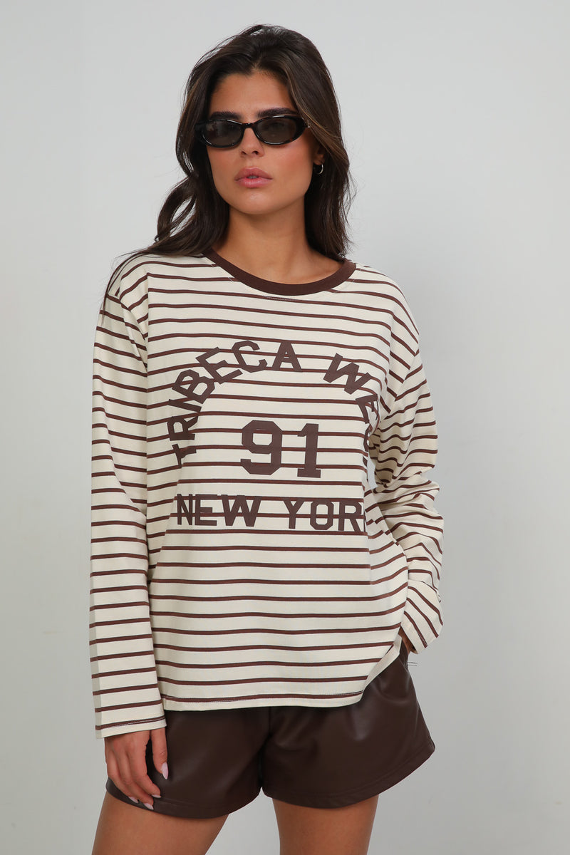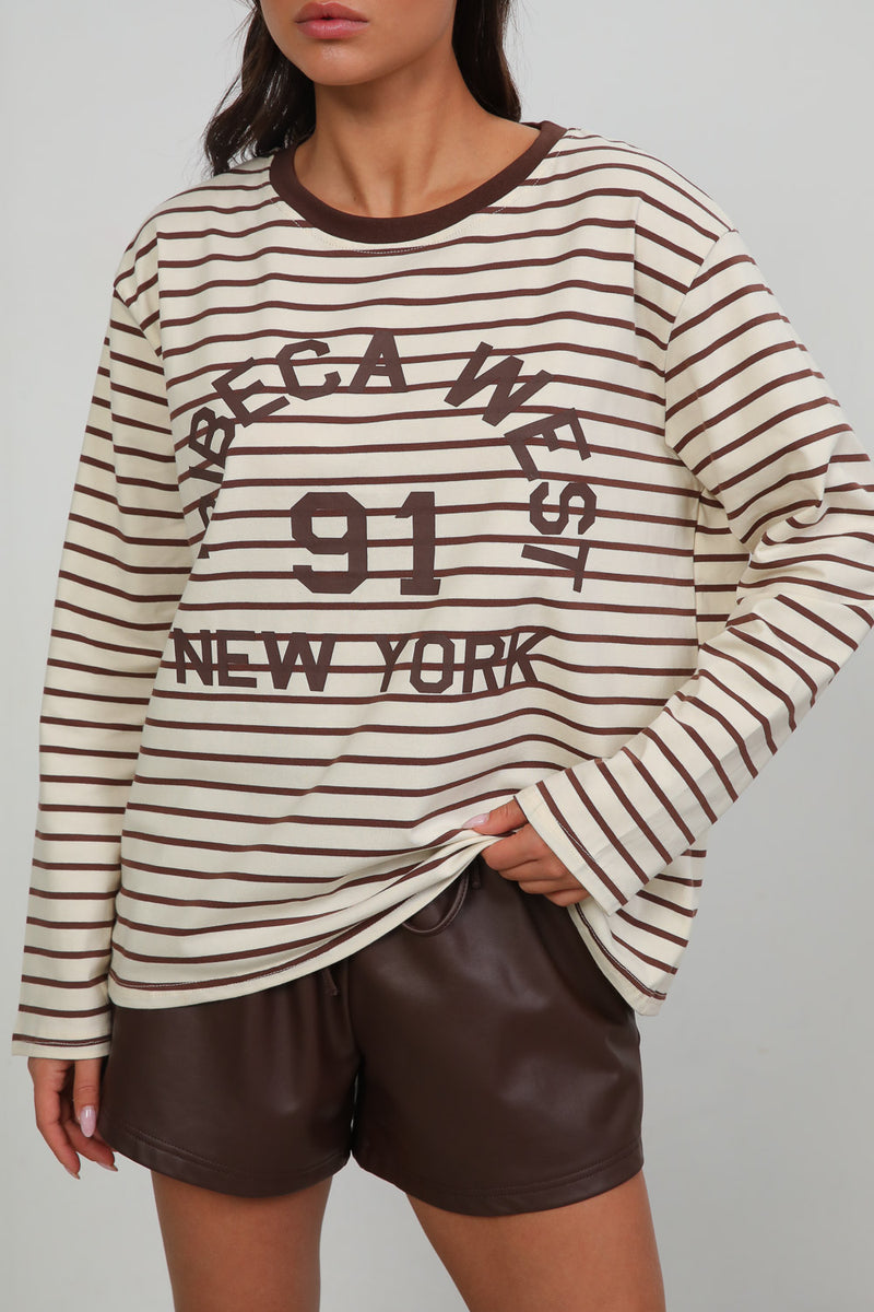 סווטשירט פסים עם צווארון עגול בשילוב דפוס קולג' וויב בחזית,