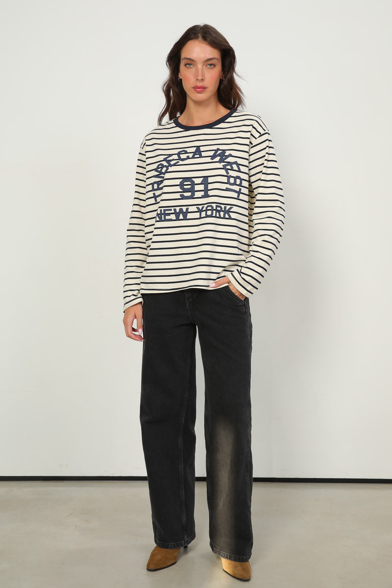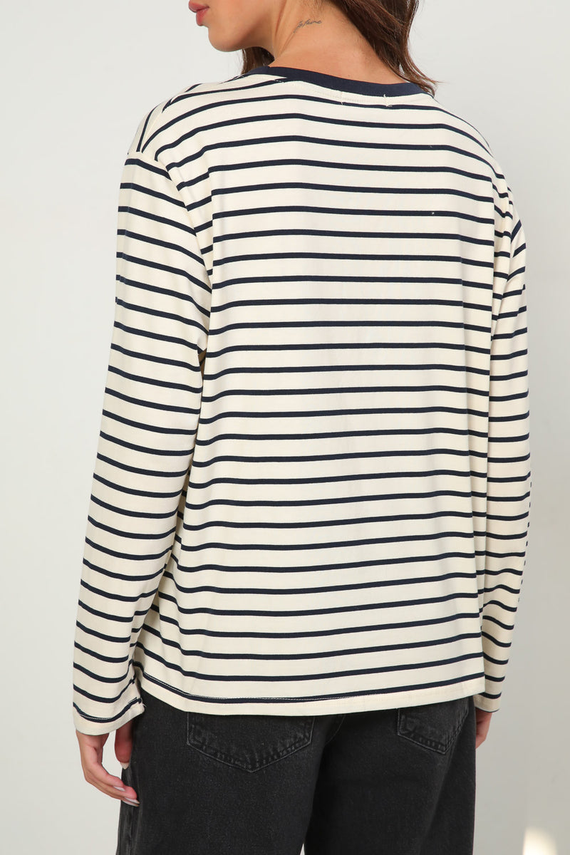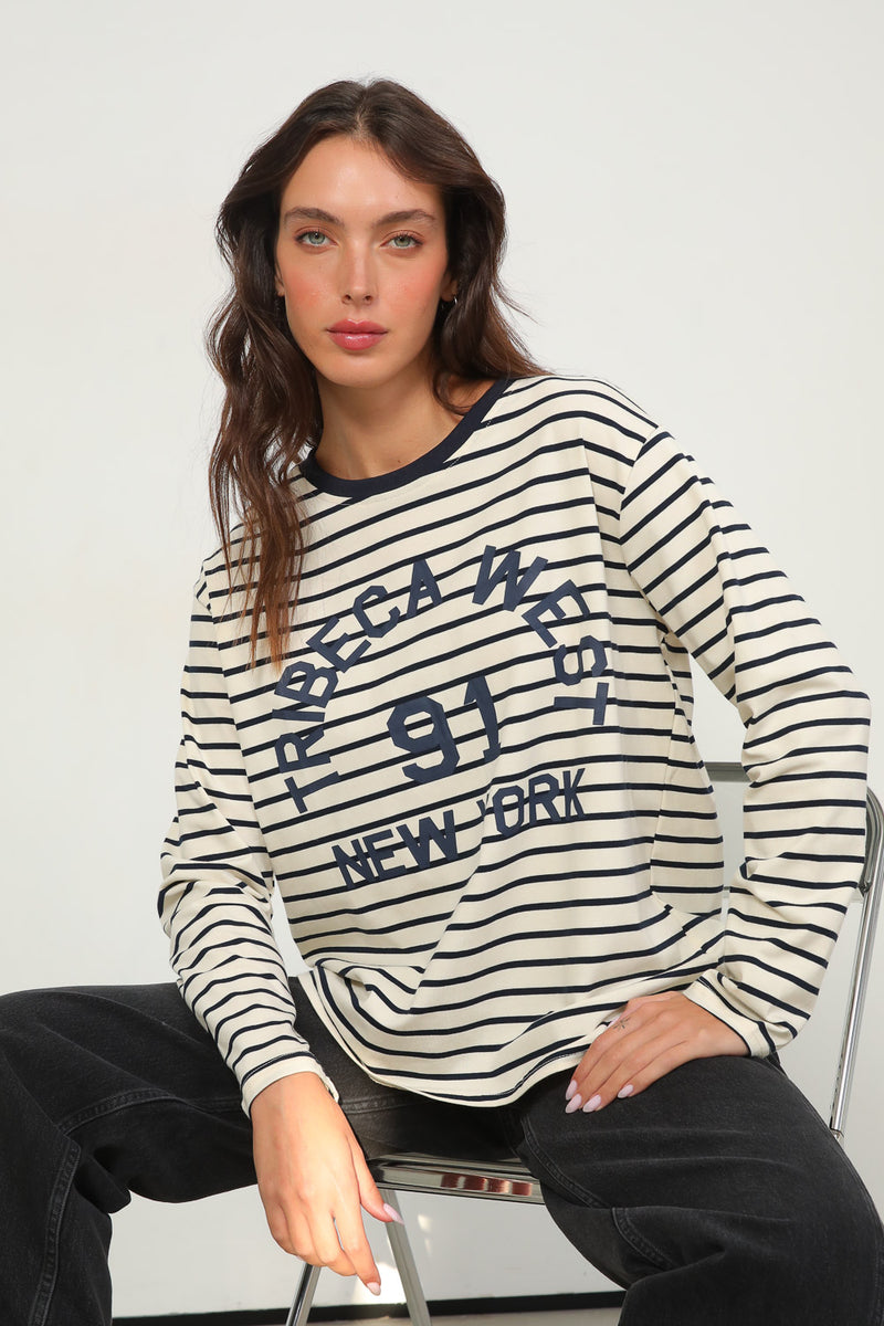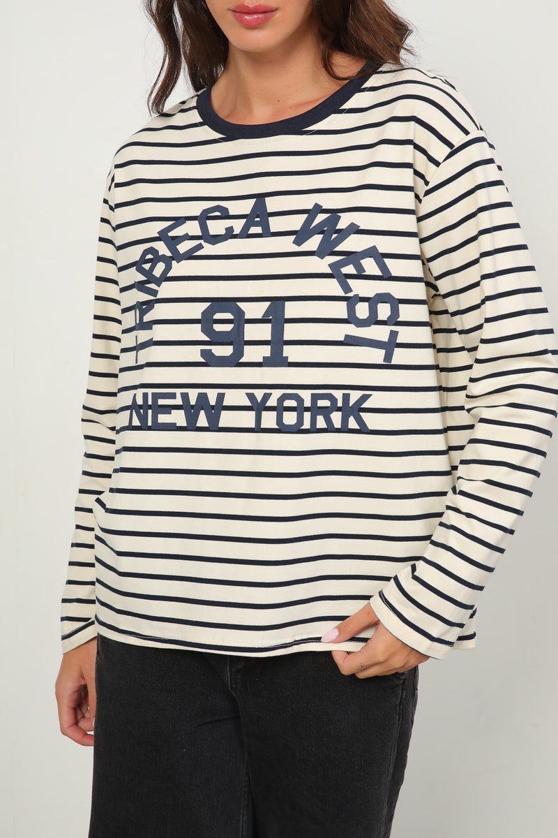 סווטשירט פסים עם צווארון עגול בשילוב דפוס קולג' וויב בחזית,