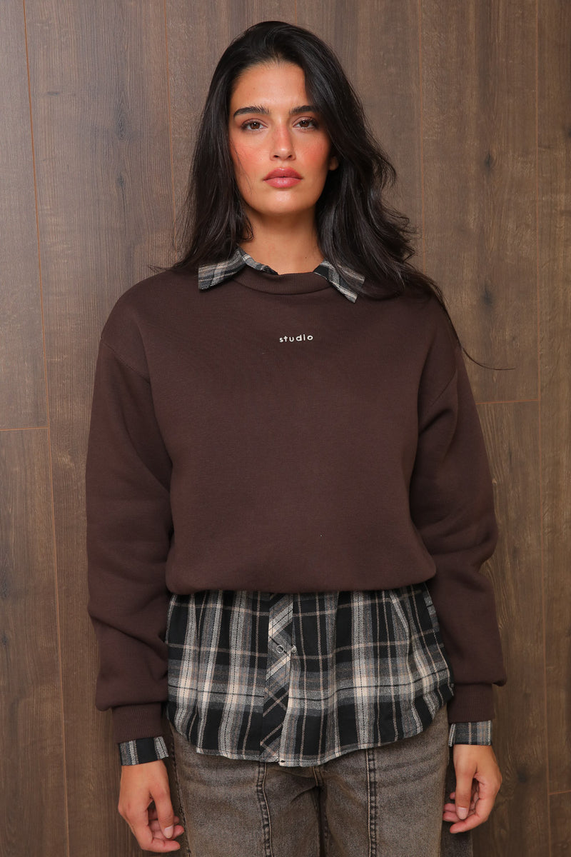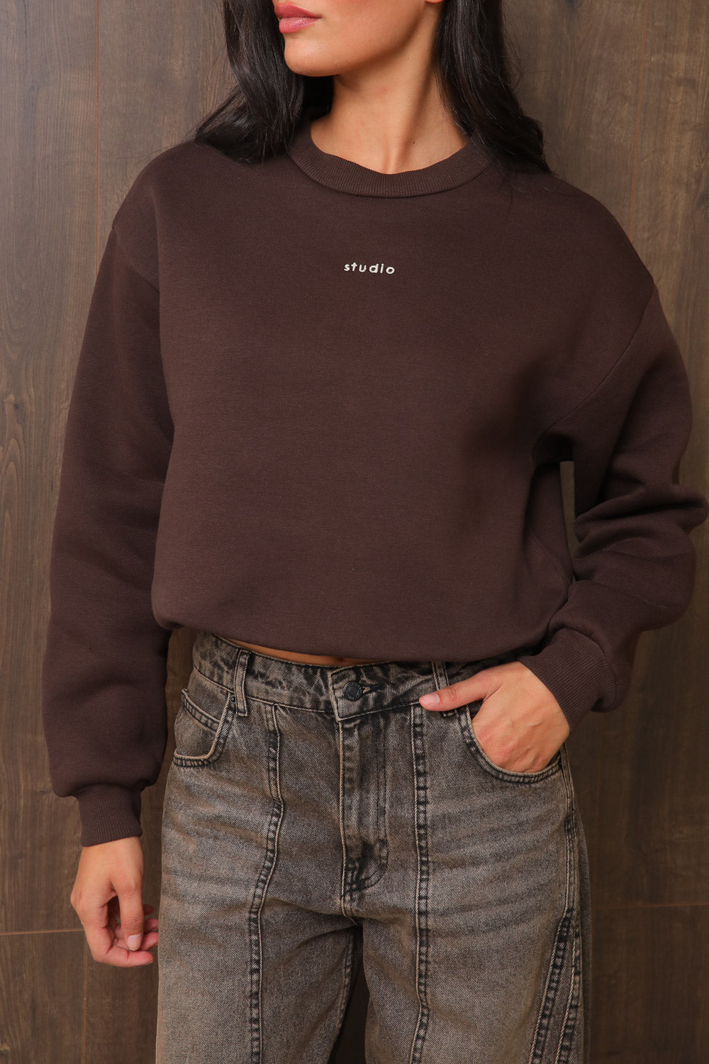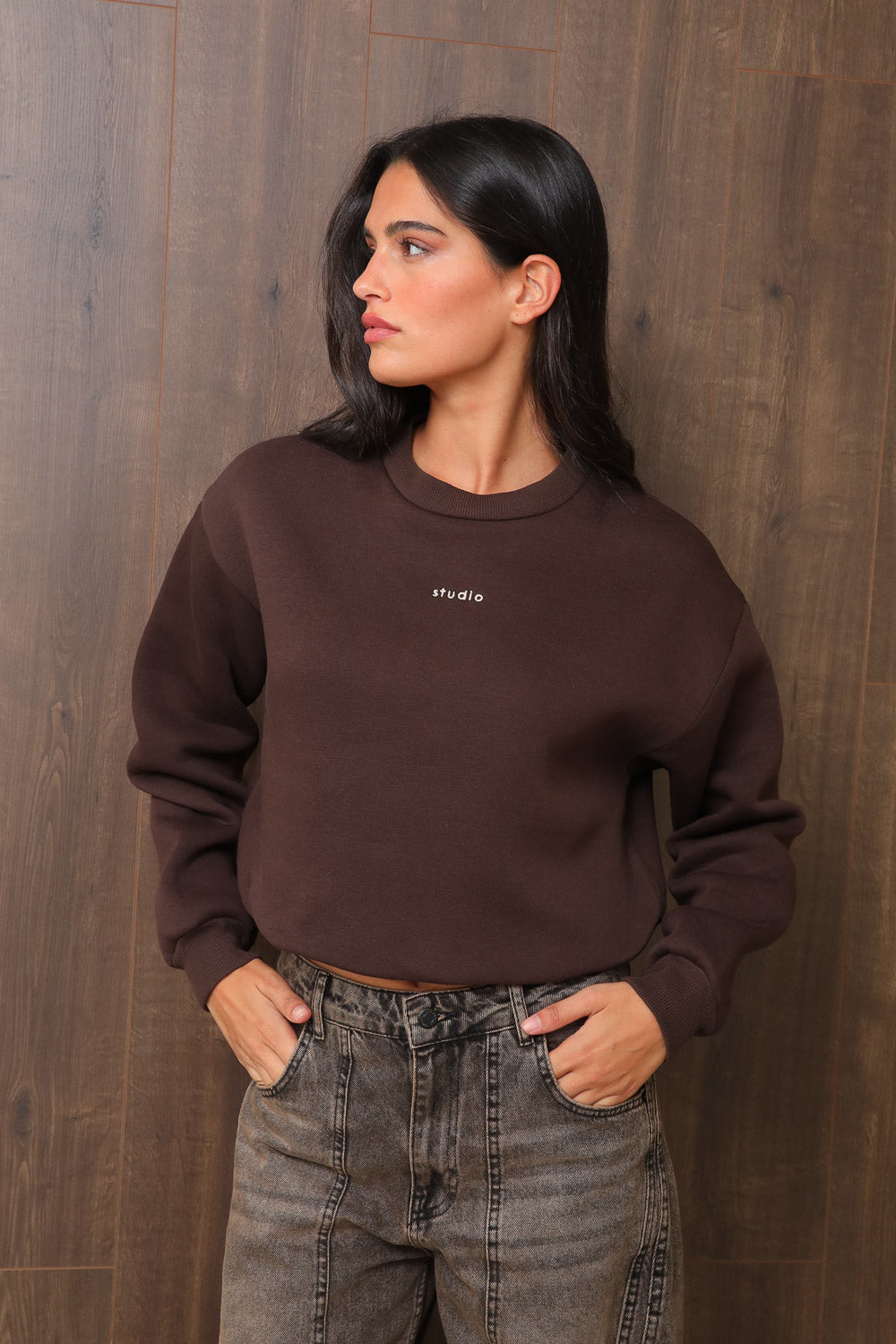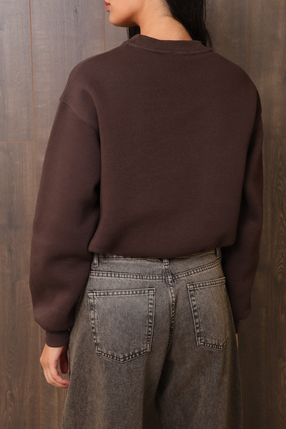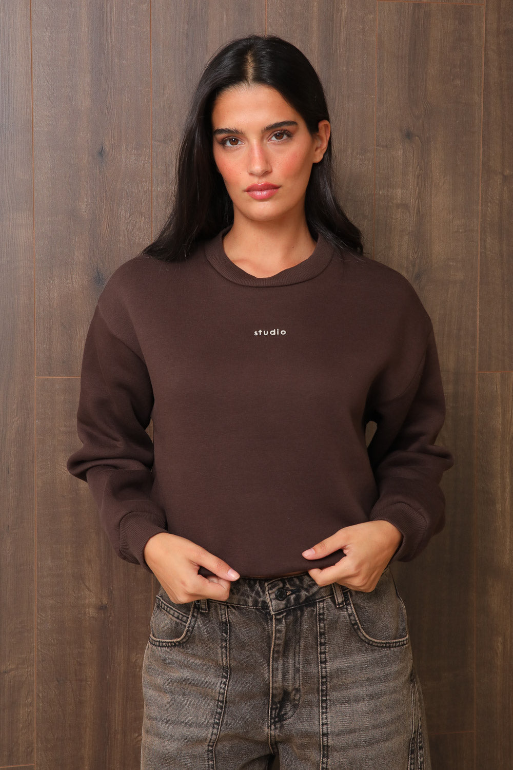סווטשירט בגוון חום כהה עם צוואורון עגול ודפוס