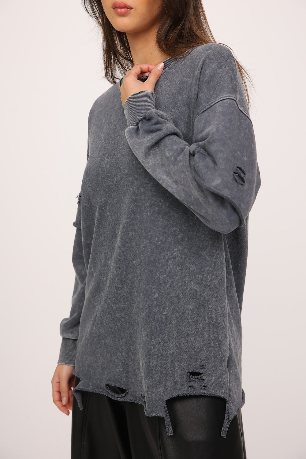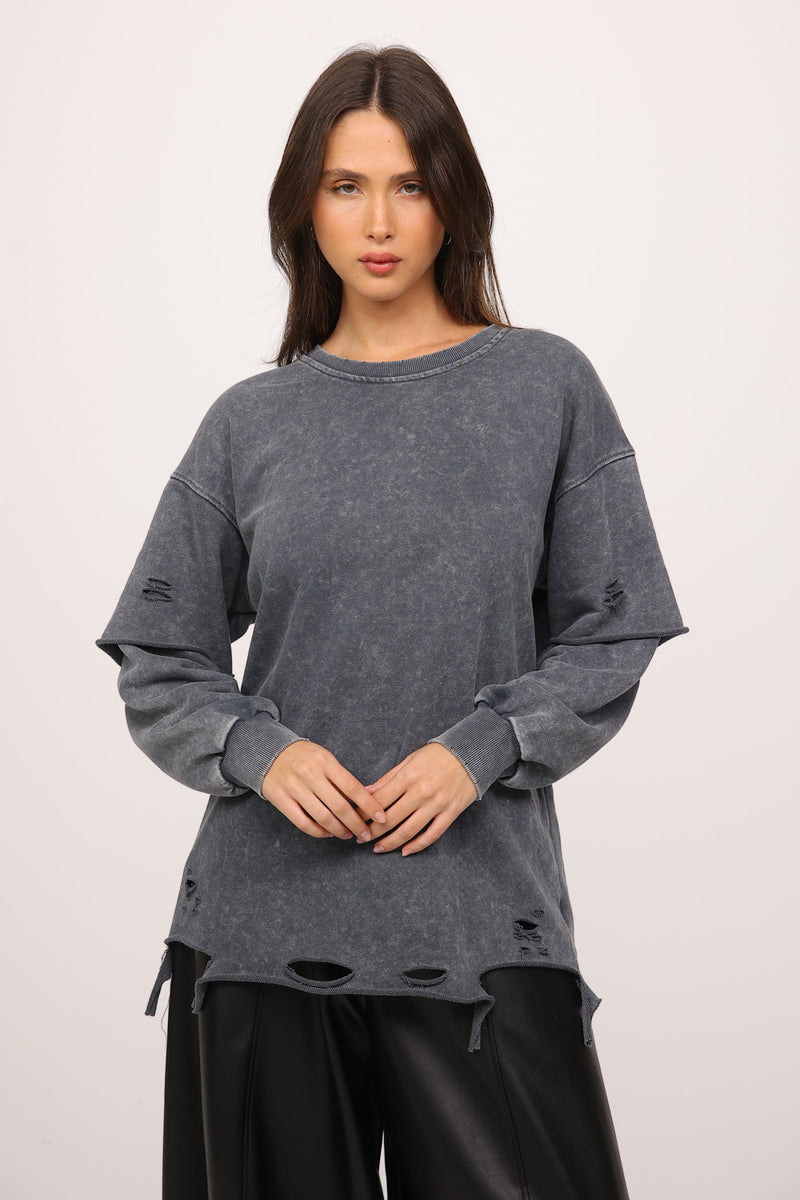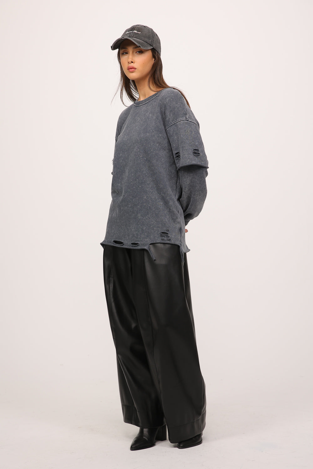 בגוון אפור כהה עם טקסטורה שטופה ואפקט משופשף עדין, כולל קרעים קטנים בשוליים שמוסיפים אופי וסטייל אורבני.
