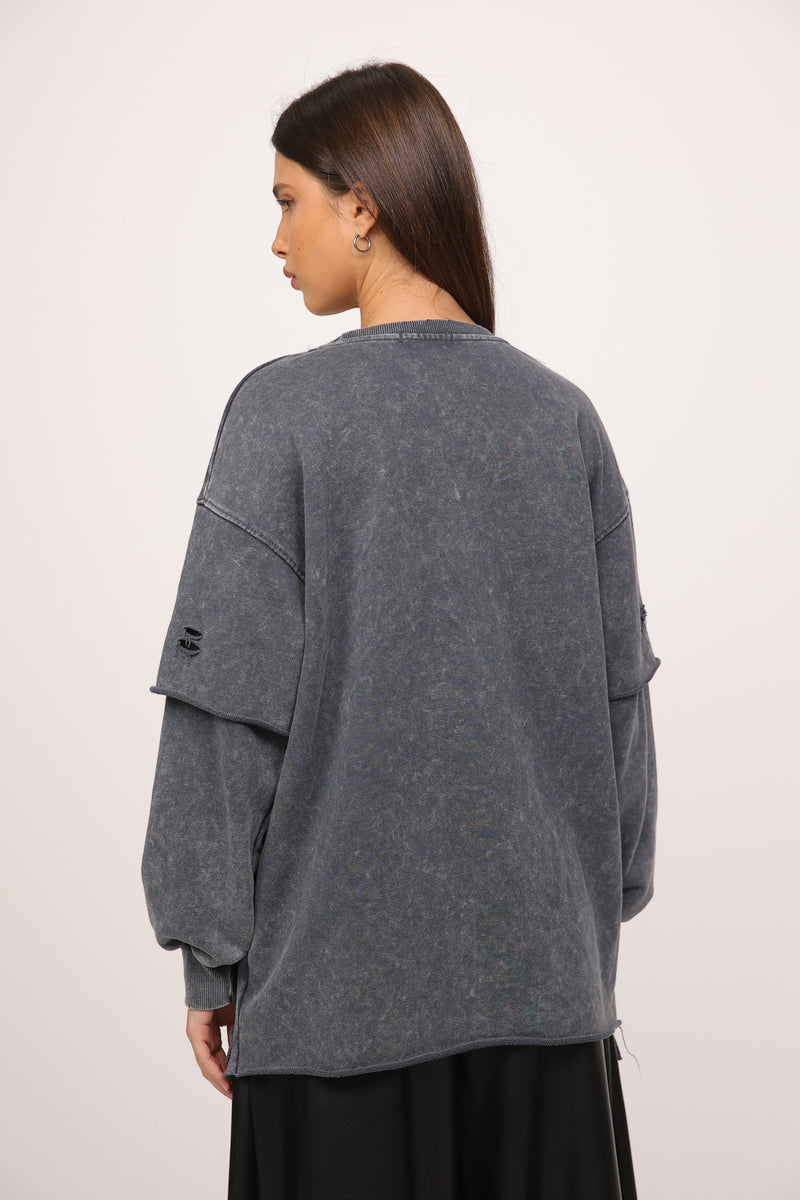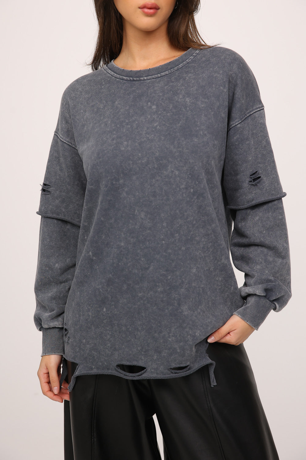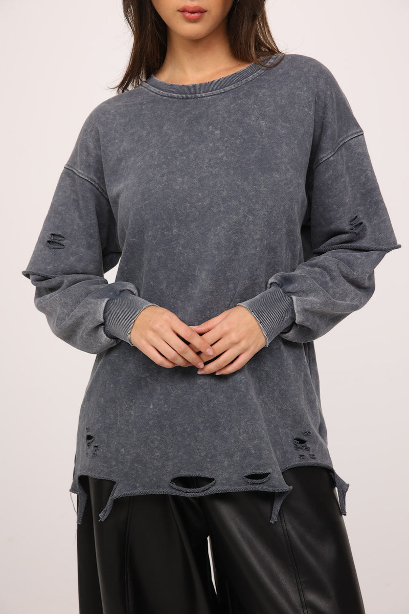 בגוון אפור כהה עם טקסטורה שטופה ואפקט משופשף עדין, כולל קרעים קטנים בשוליים שמוסיפים אופי וסטייל אורבני.