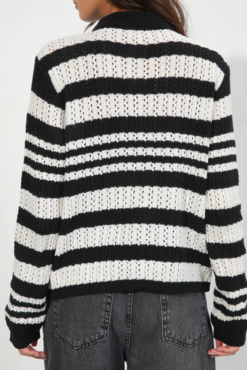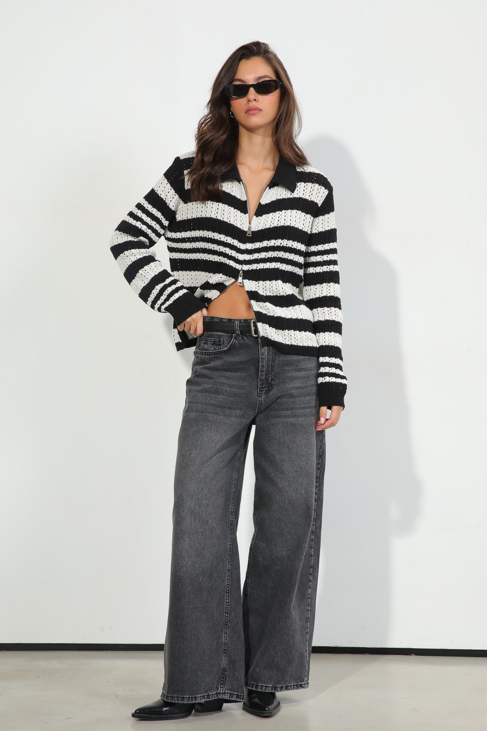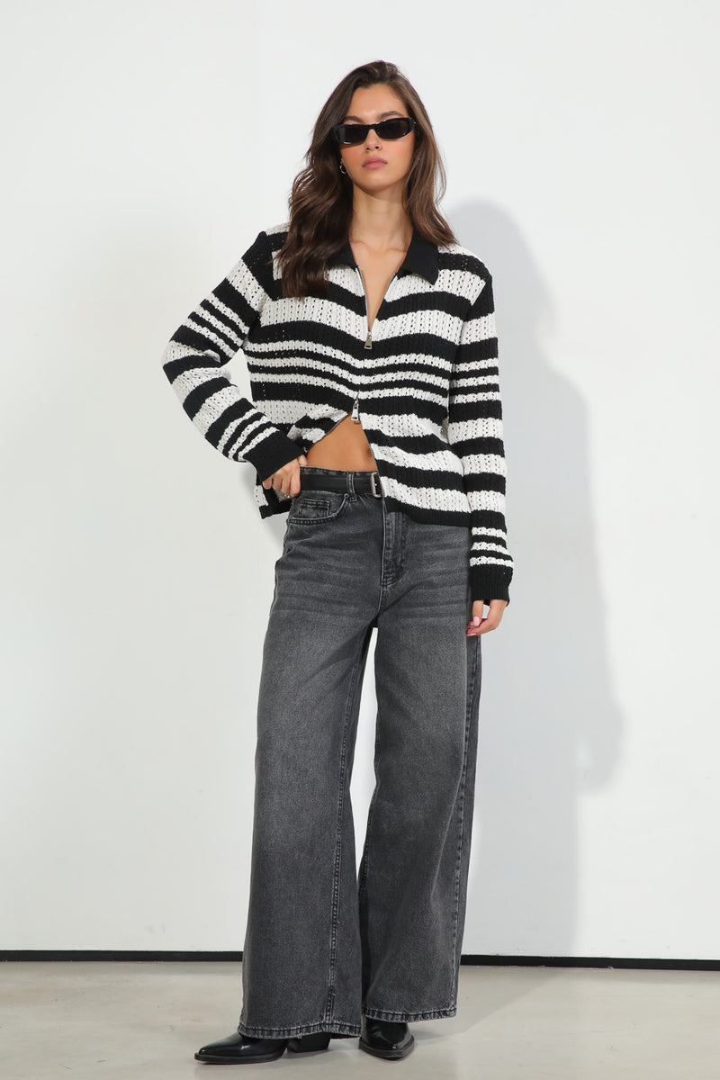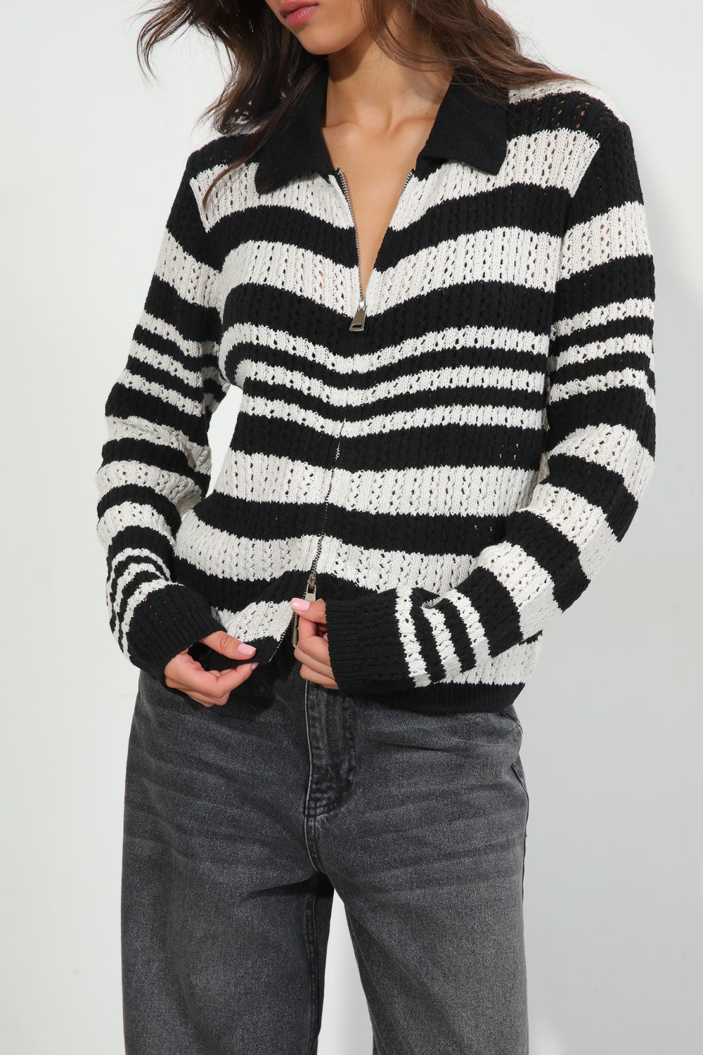 קרדיגן סריג פסים עם צווארון שינה ורוכסן בחזית,