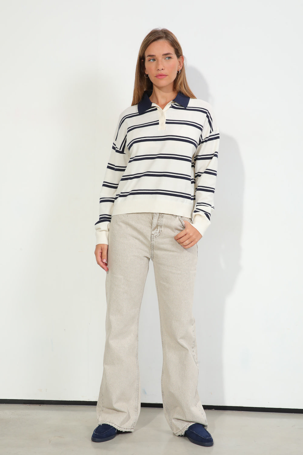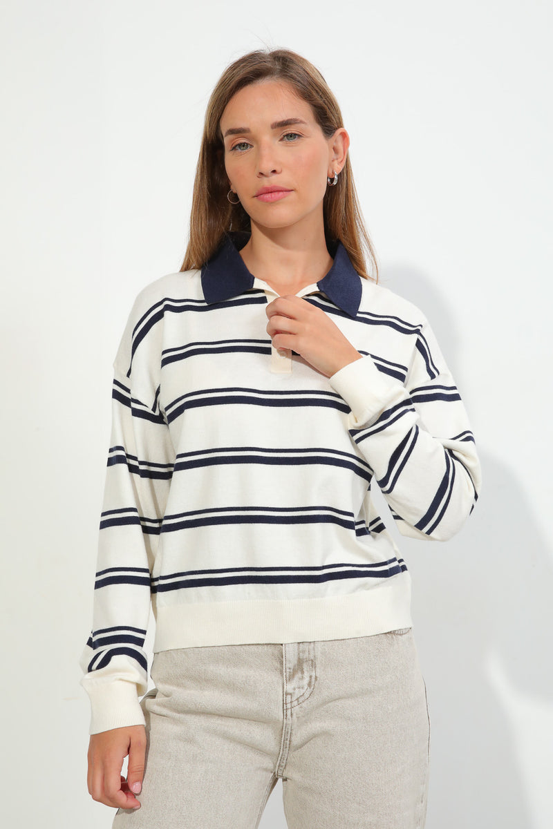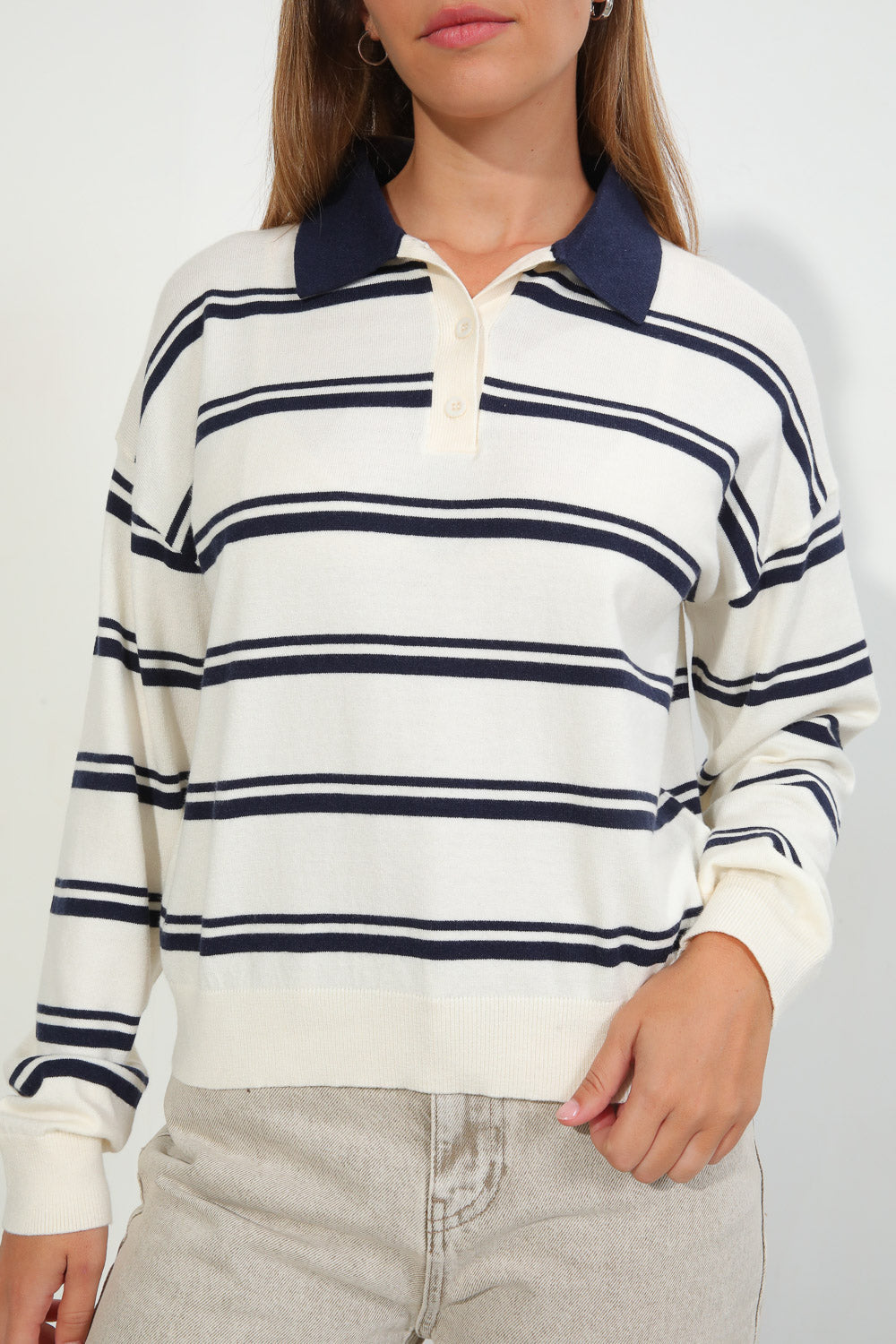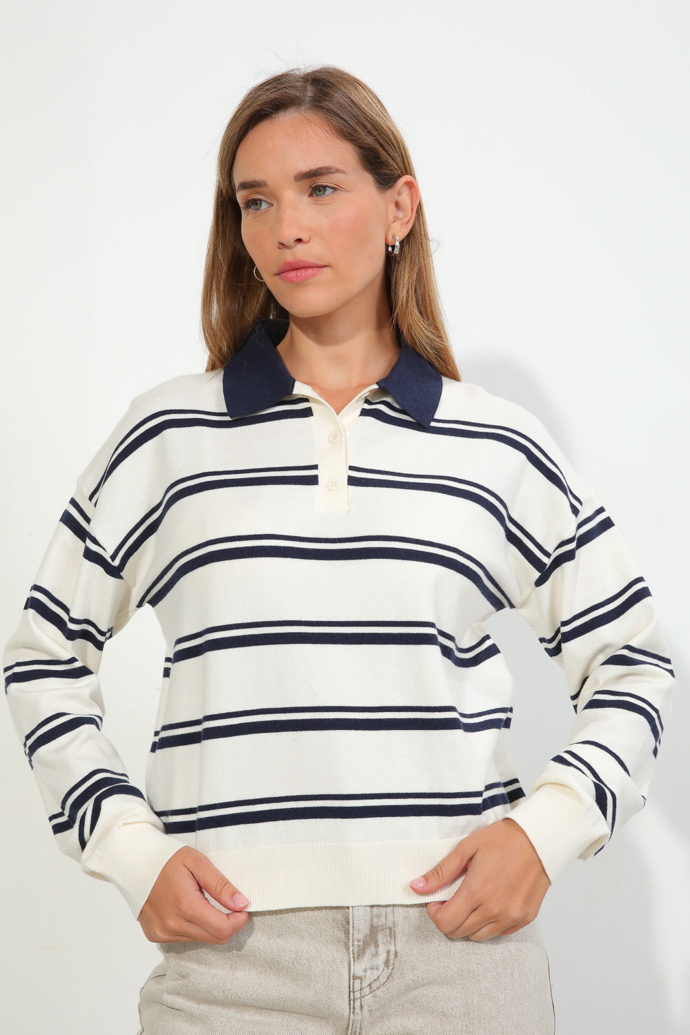 סריג פסים עם שרוולים ארוכים בשילוב צווארון שינה עם 3 כפתורים,
