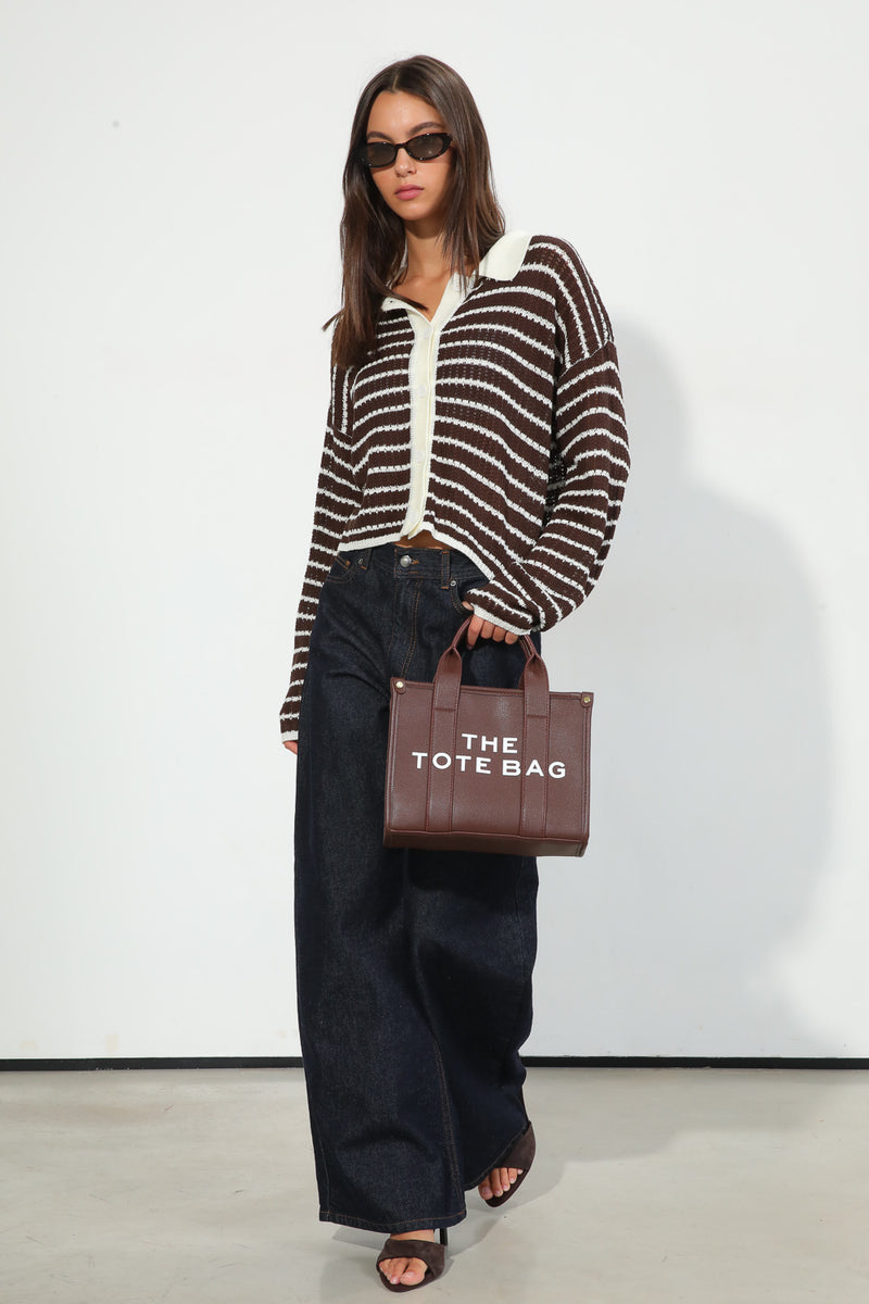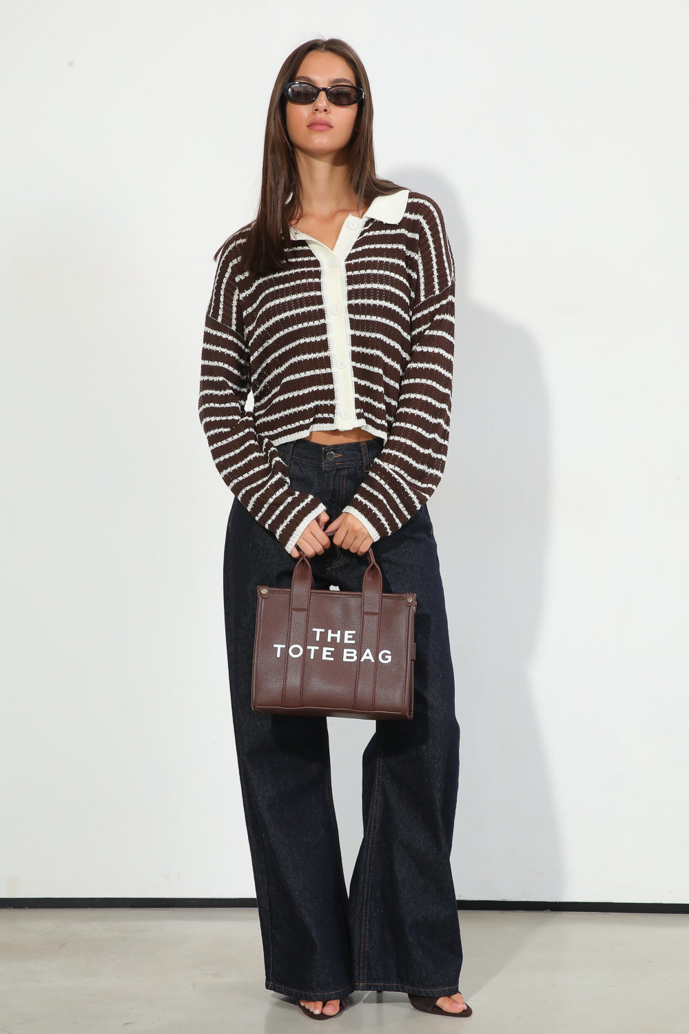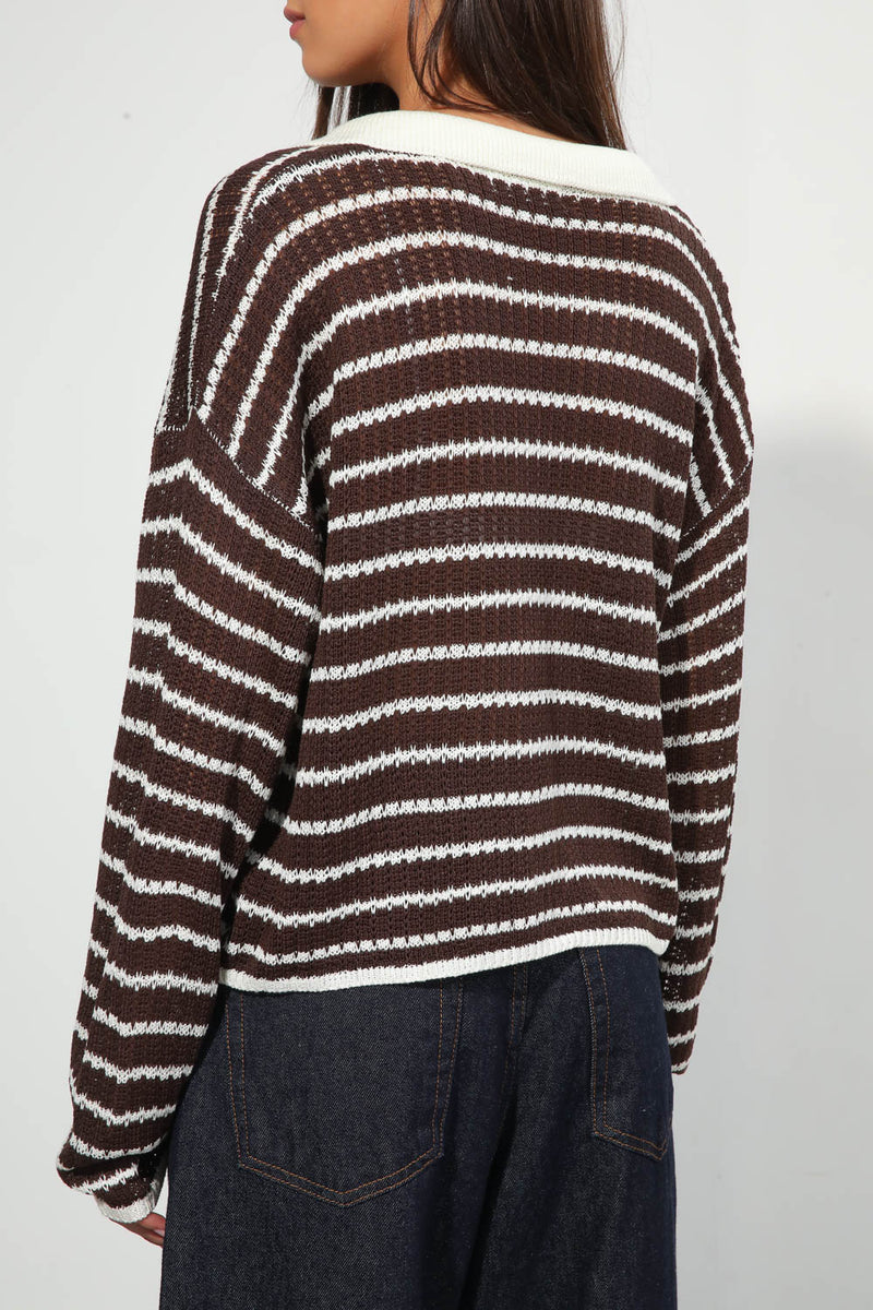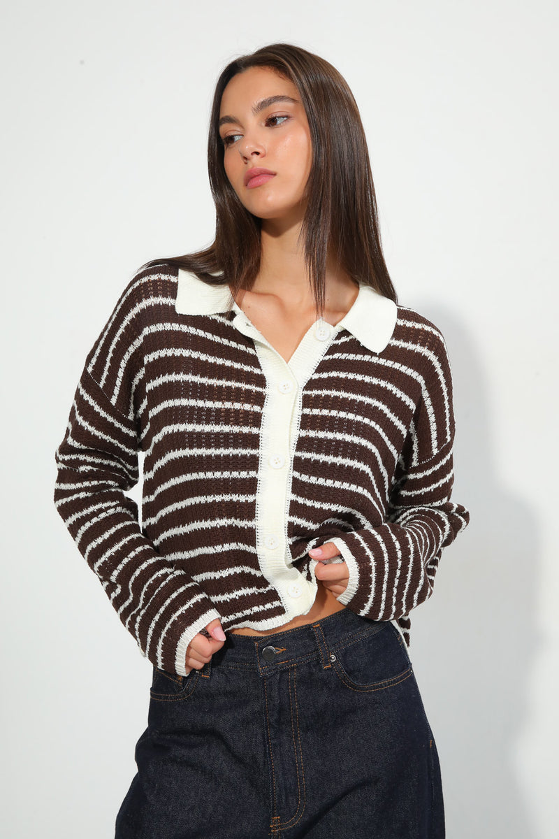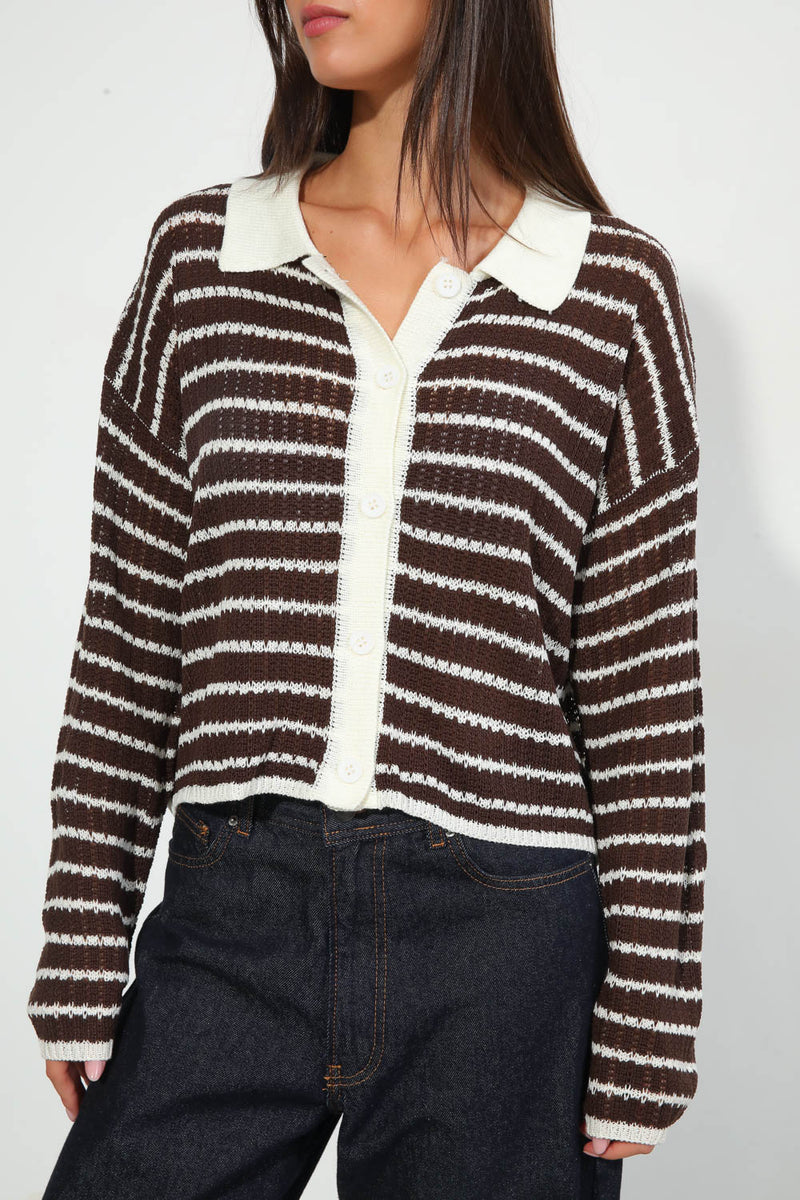 קרדיגן סריג פסים עם צווארון שינה וסגירת כפתורים בחזית,