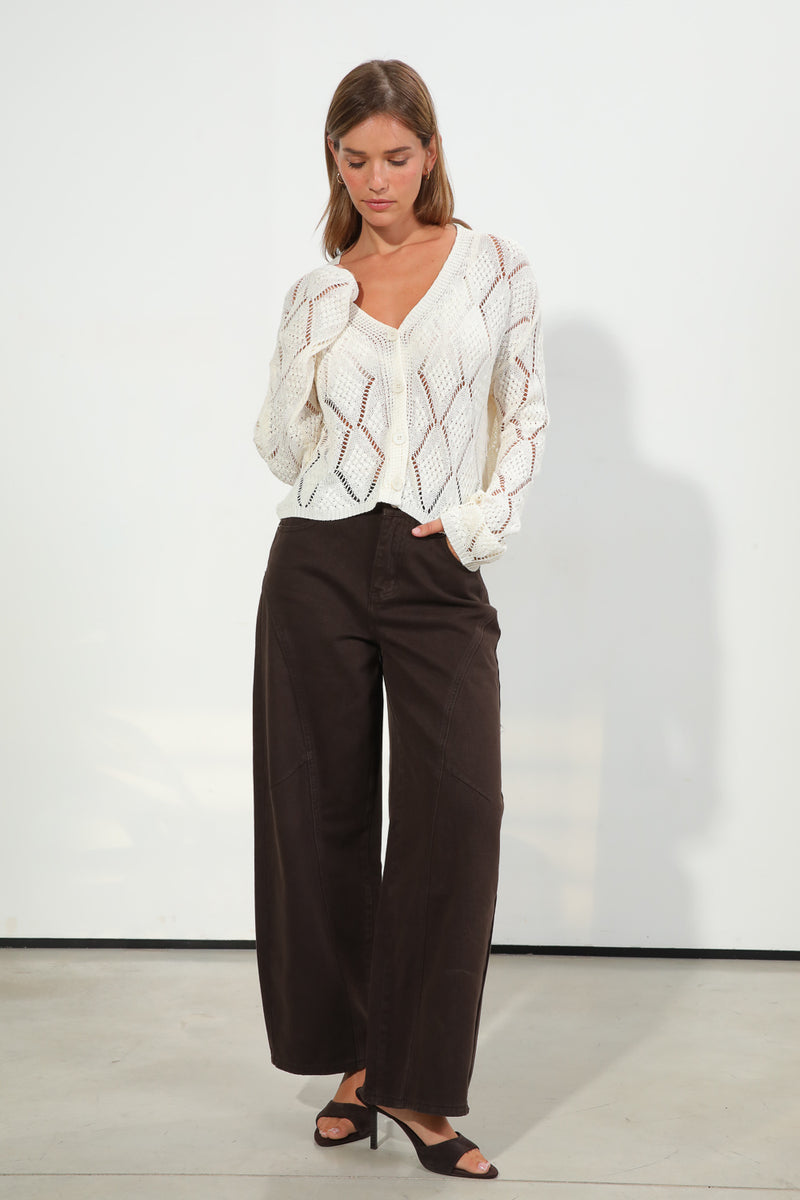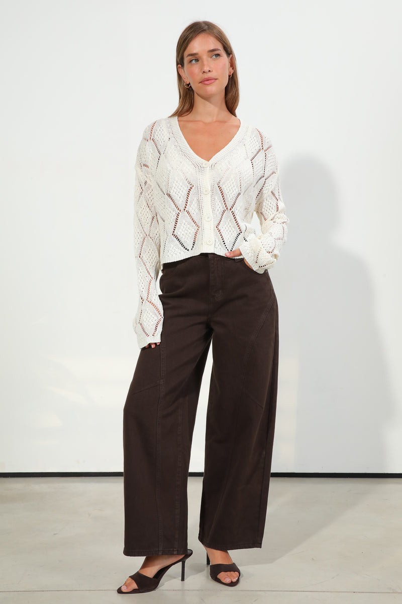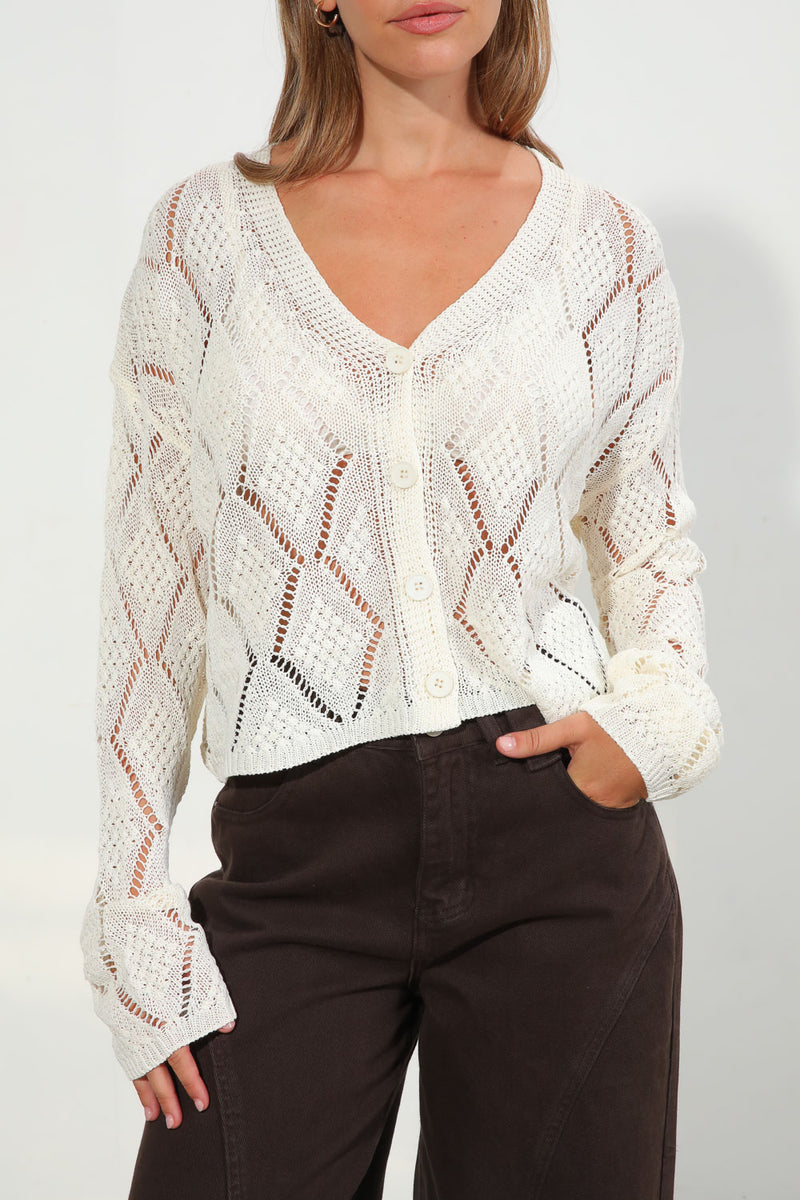 קרדיגן קורשה בטקסטורה היסטרית עם מפתח וי רחב וסגירת כפתורים בחזית,