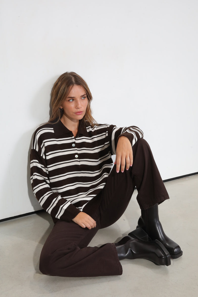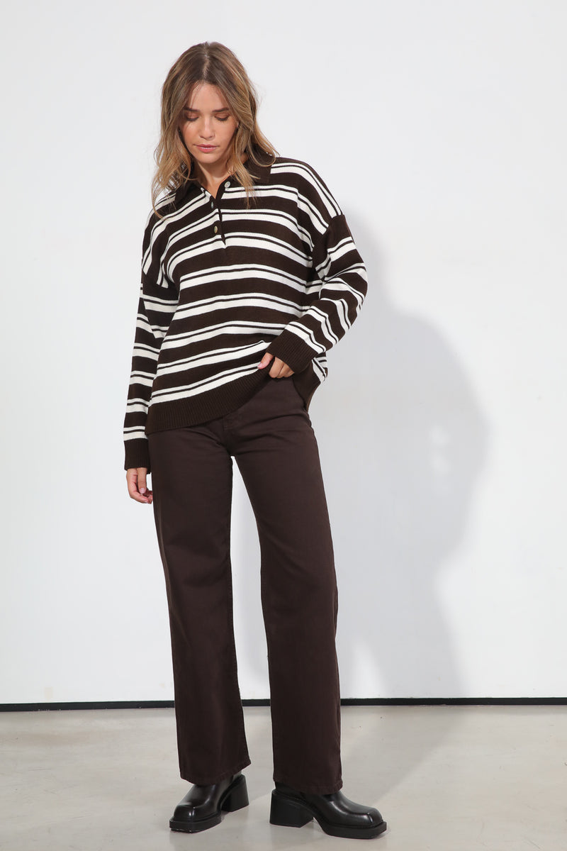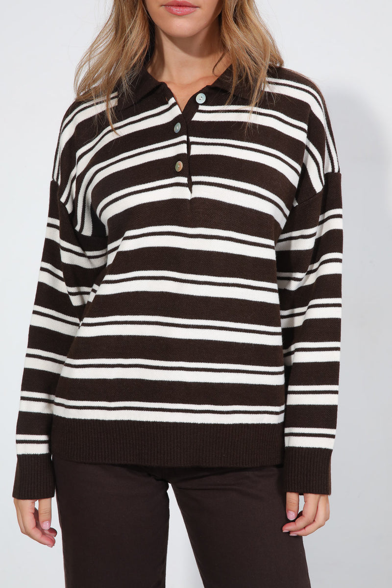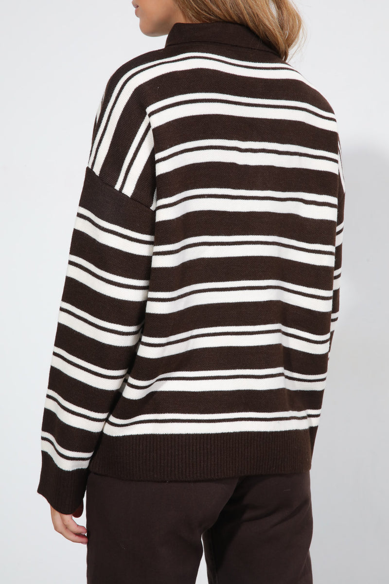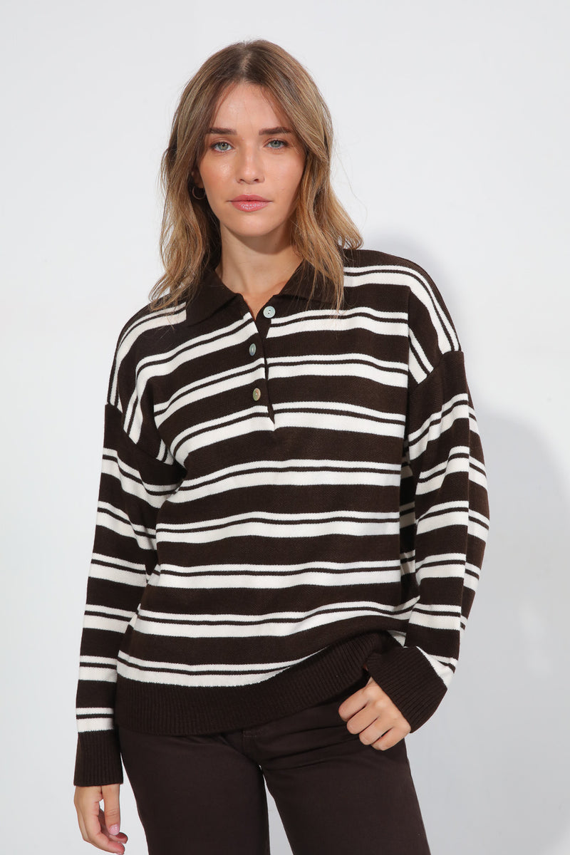 סריג פסים בגזרת אוברסייז עם צווארון שינה ו3 כפתורים,