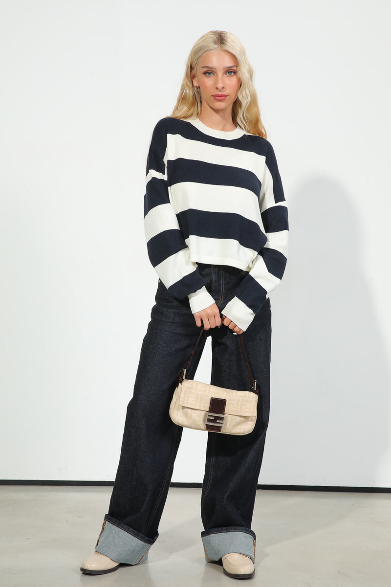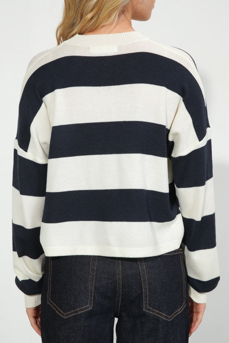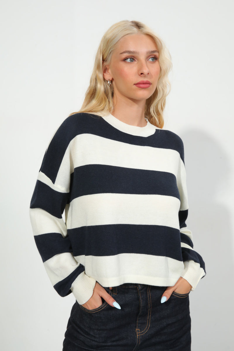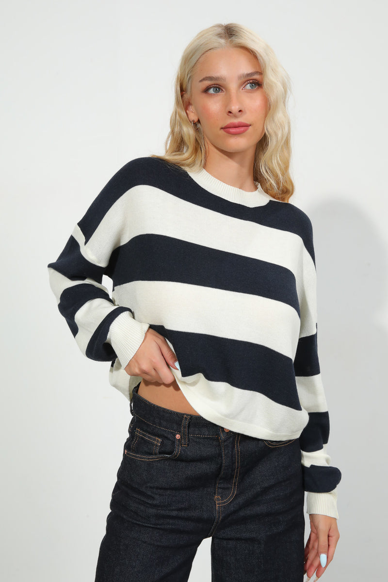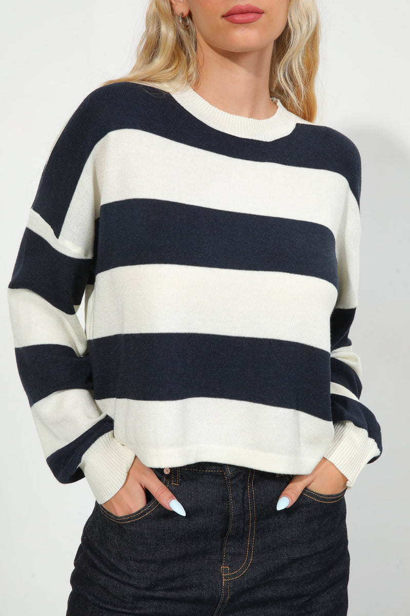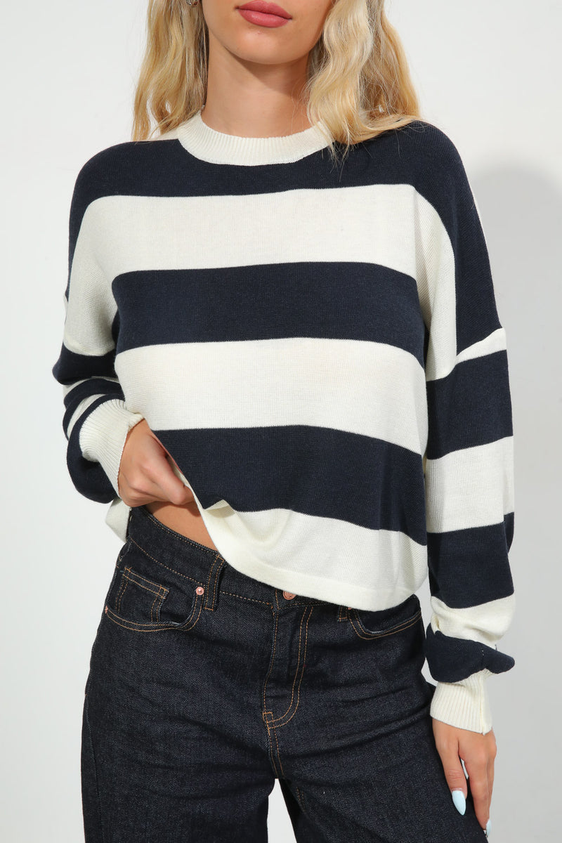 סריג פסים אול אובר בגזרה רחבה עם צווארון עגול בטקסטורת ריפ עדינה,