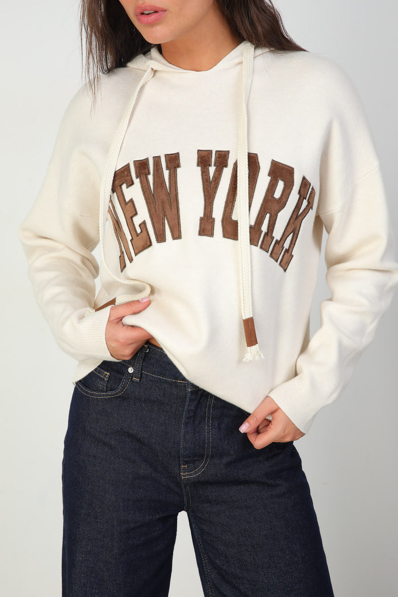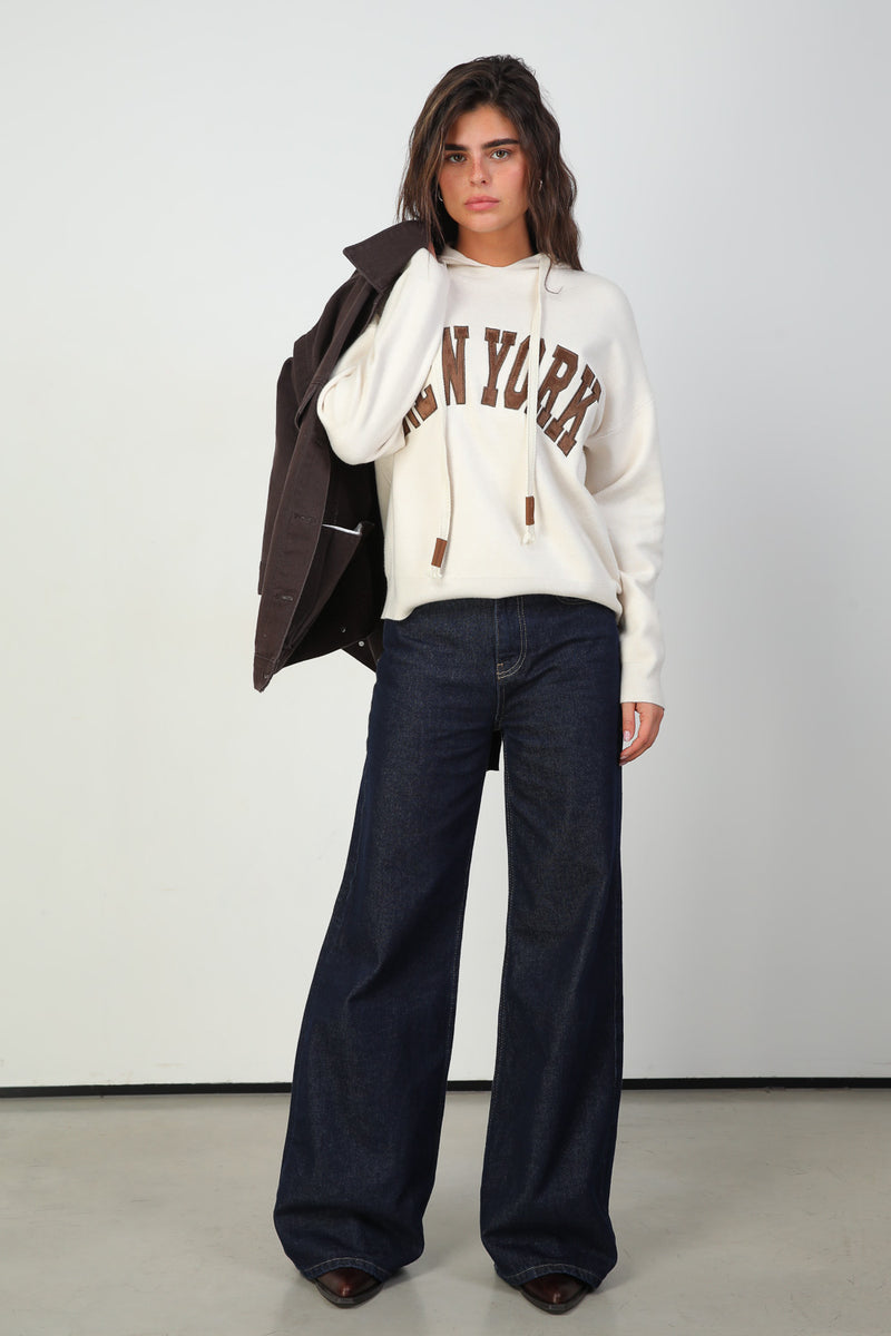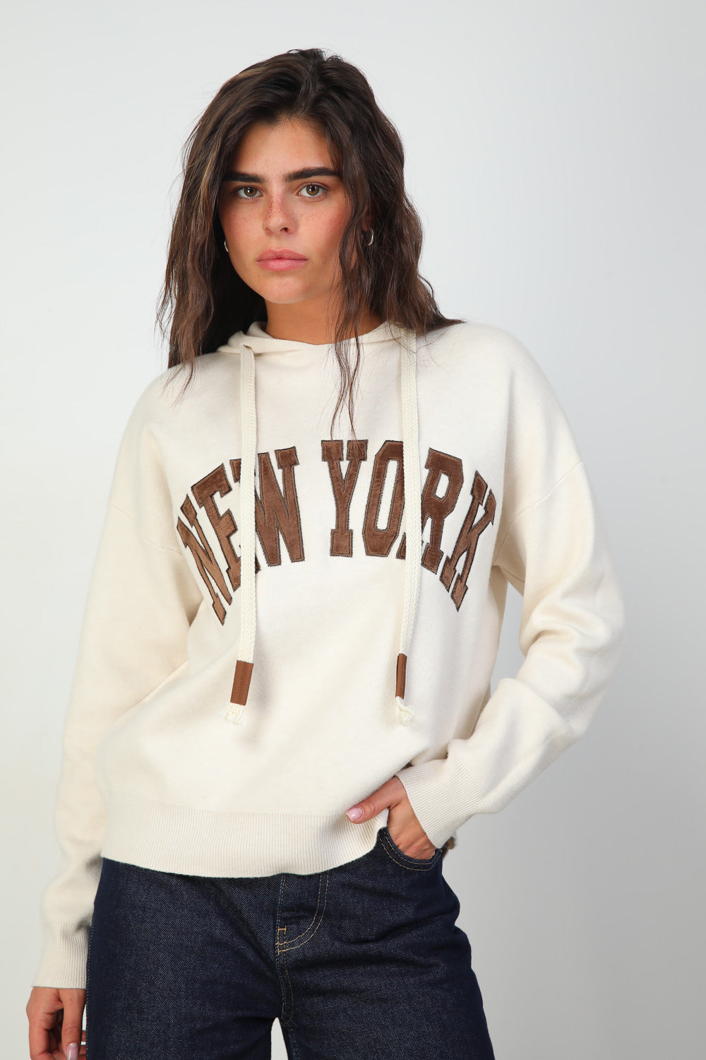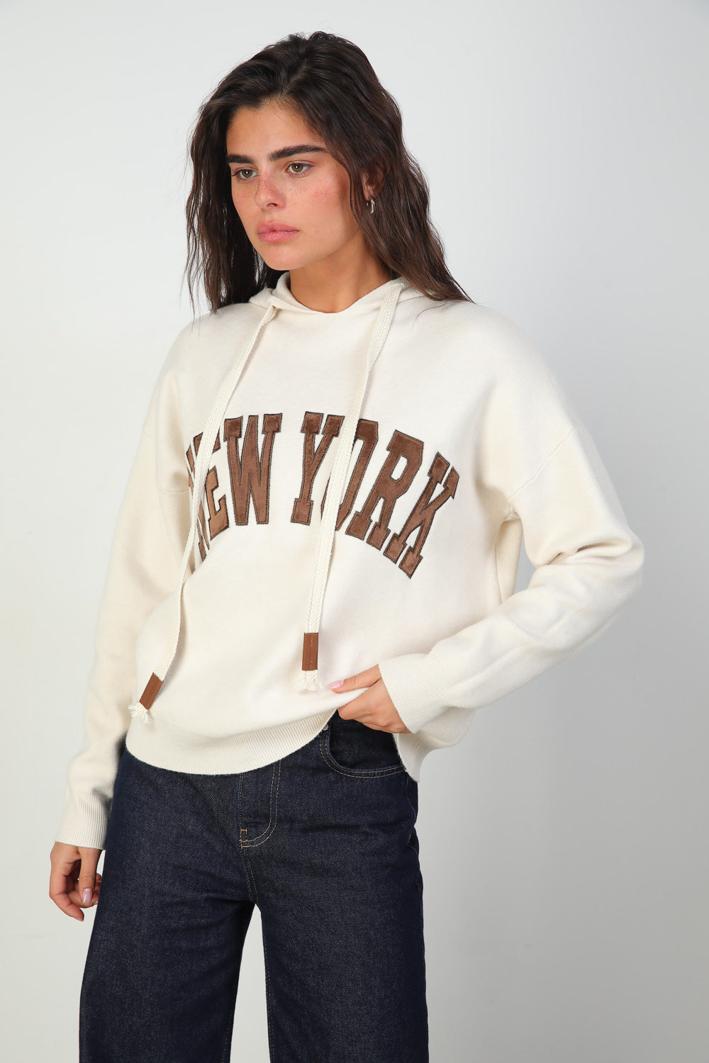 סריג קפוצ'ון בגזרה רפויה עם מראה אורבני וקז’ואלי. כולל קפוצ’ון עם שרוך קשירה וכיתוב NEW YORK מודפס בחזית בסגנון קולג’ קלאסי. עשוי בד סרוג רך ונעים בגוון בז’, ומתאים לשילוב יומיומי עם ג’ינס או מכנסיים רחבים ללוק נוח עם אמירה אופנתית.