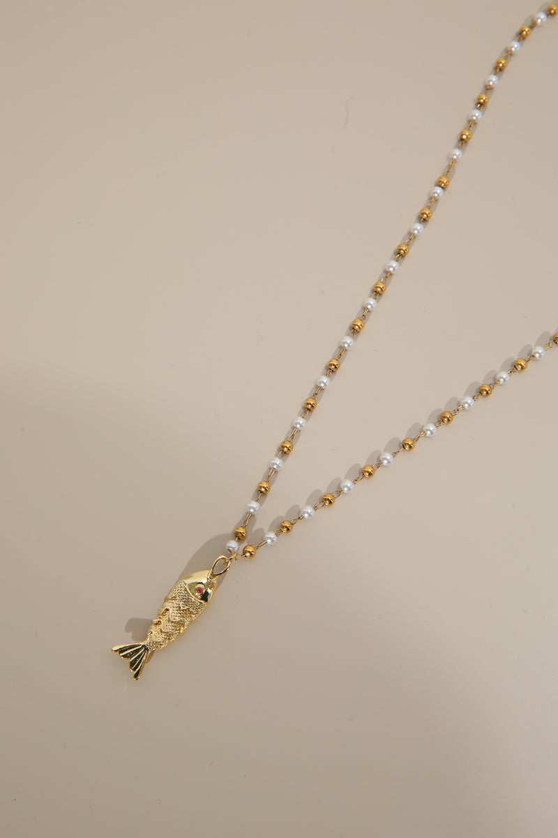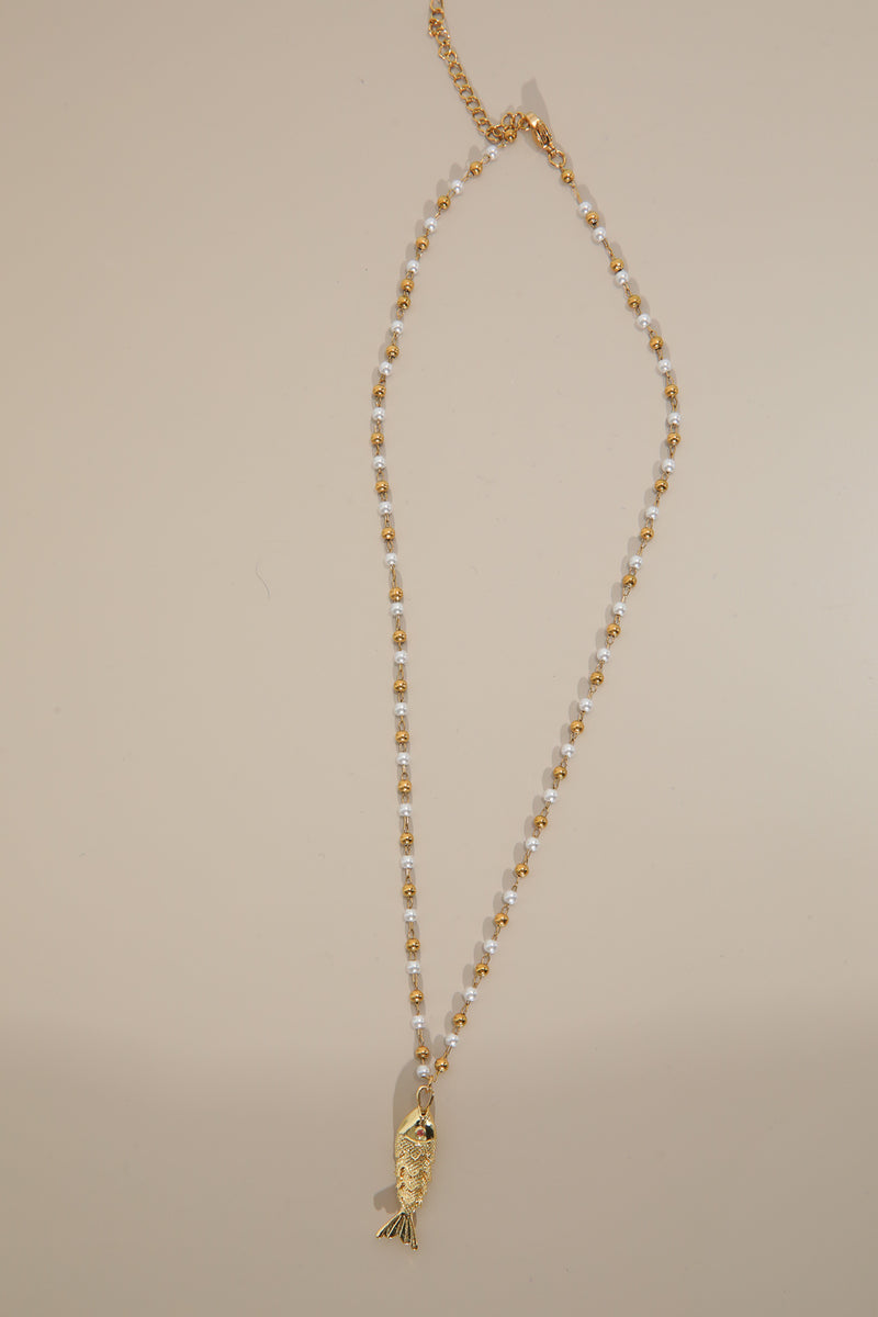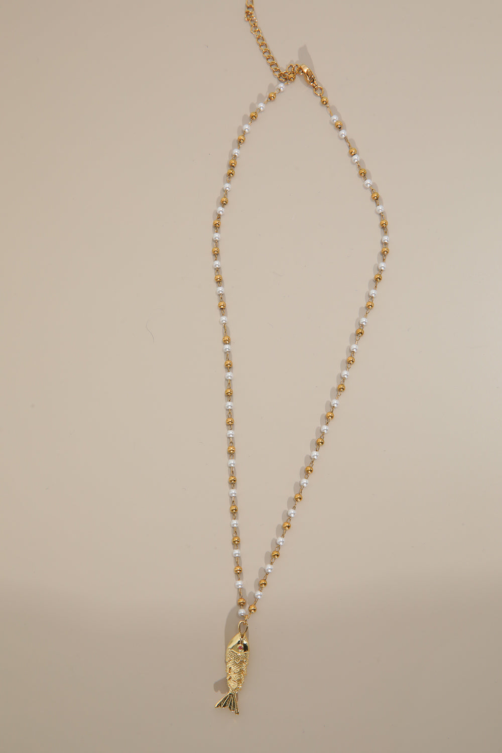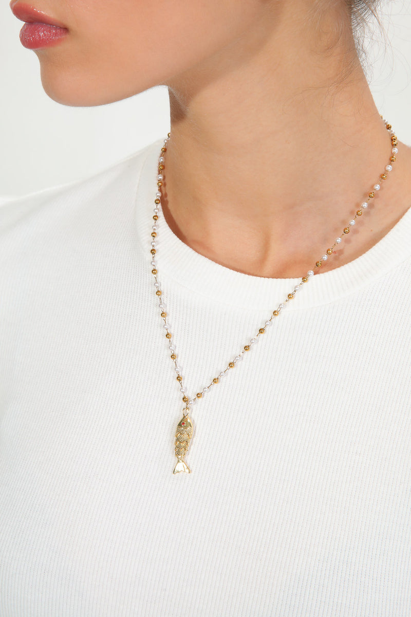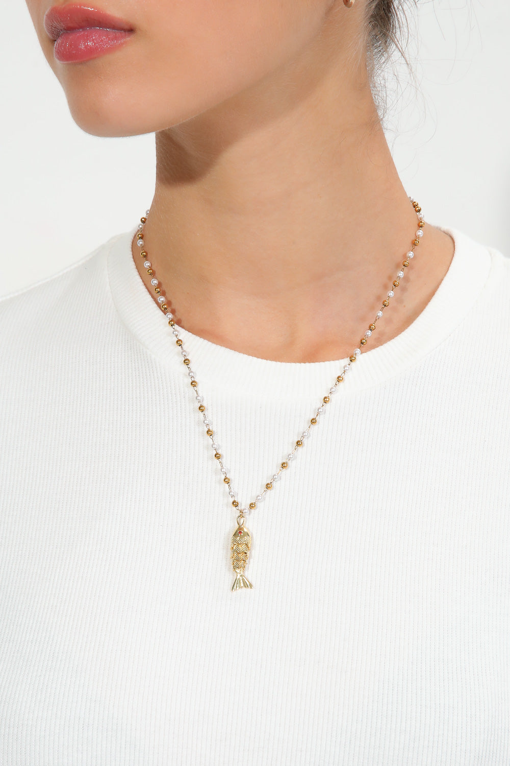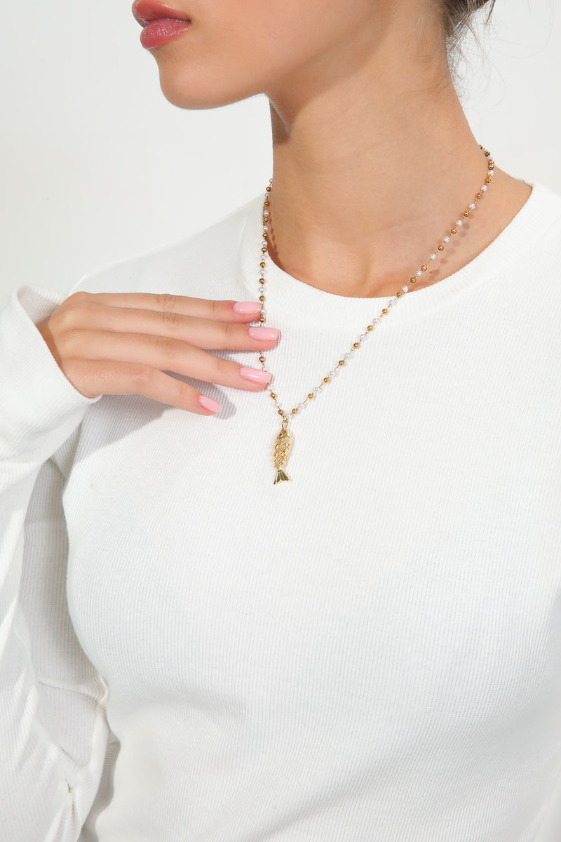 שרשרת דמוי זהב בשילוב חרוזים עם תליון דג.